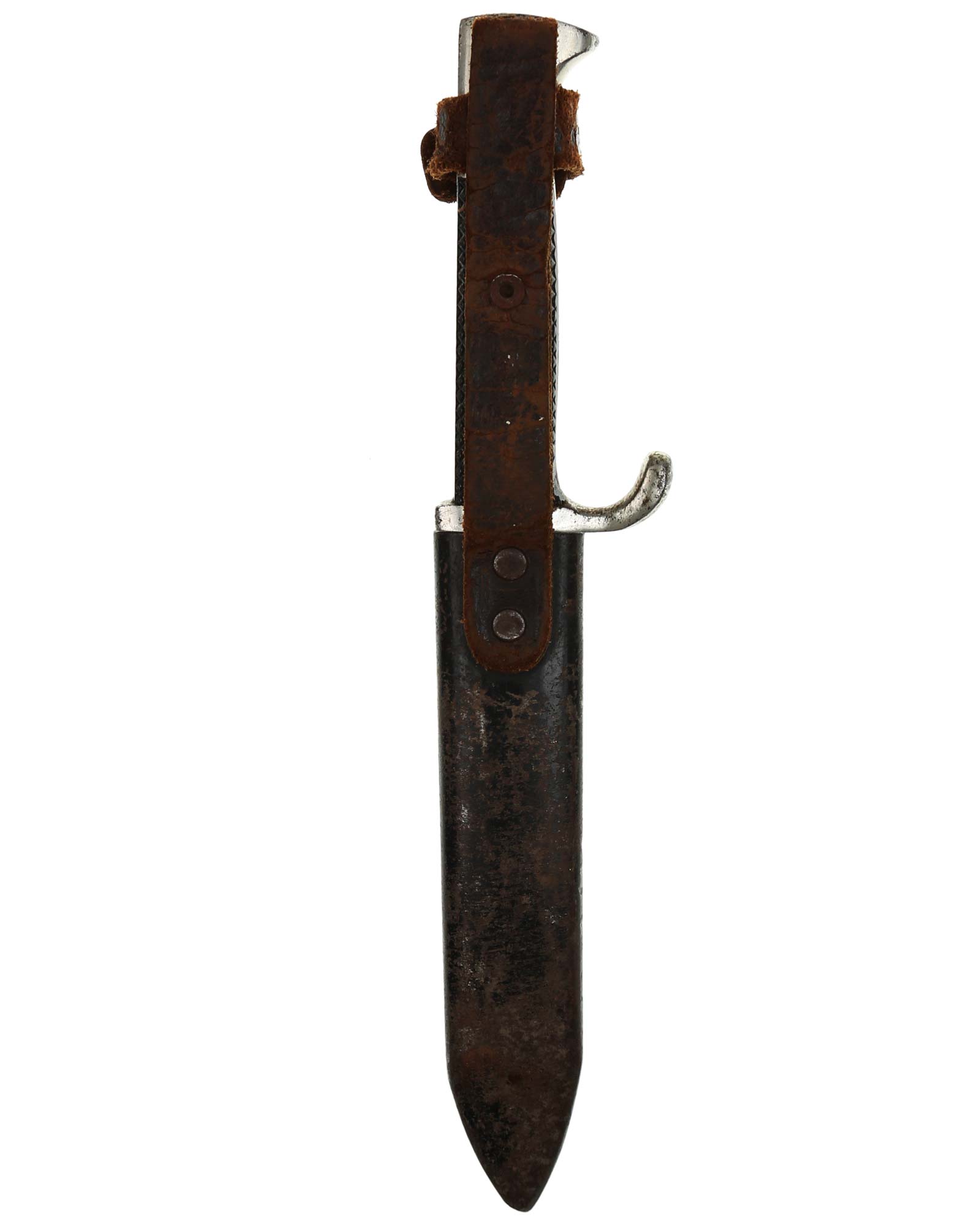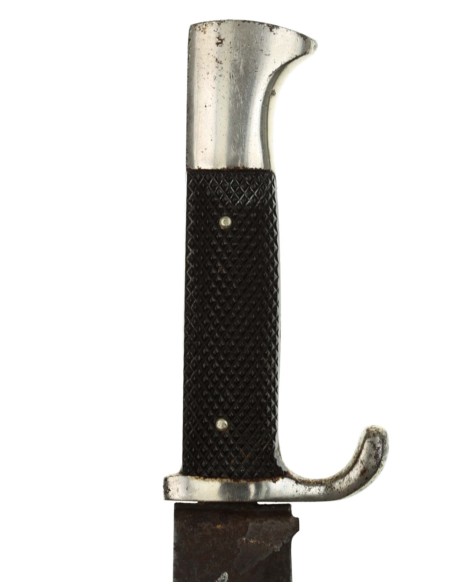 This Hitler Youth Knife is with Motto, shows some age. Model 1933-1935 [Early-period]. The total length is 25.3 cm. The Knife has the maker mark on the blade: Hermann Konejung Solingen.