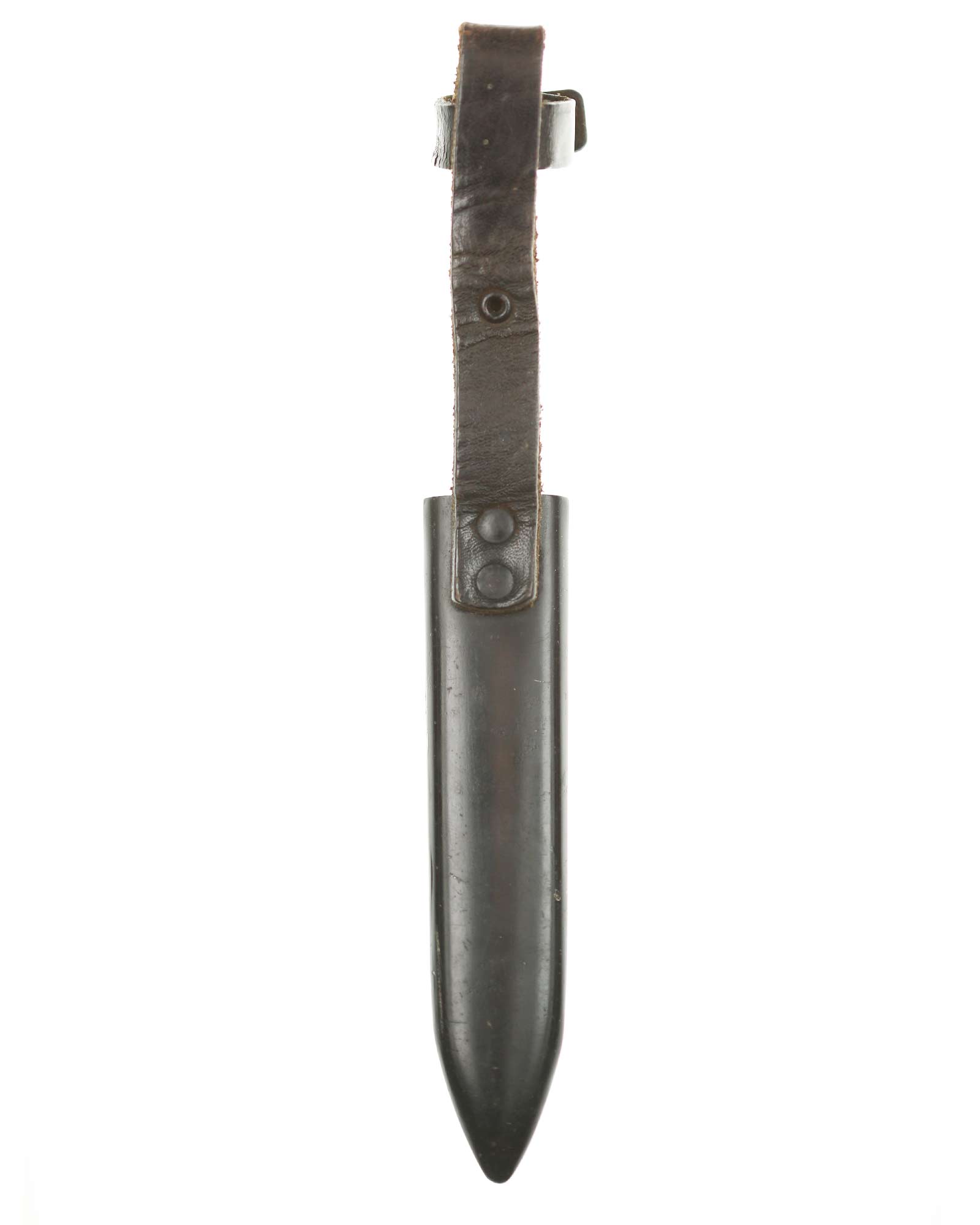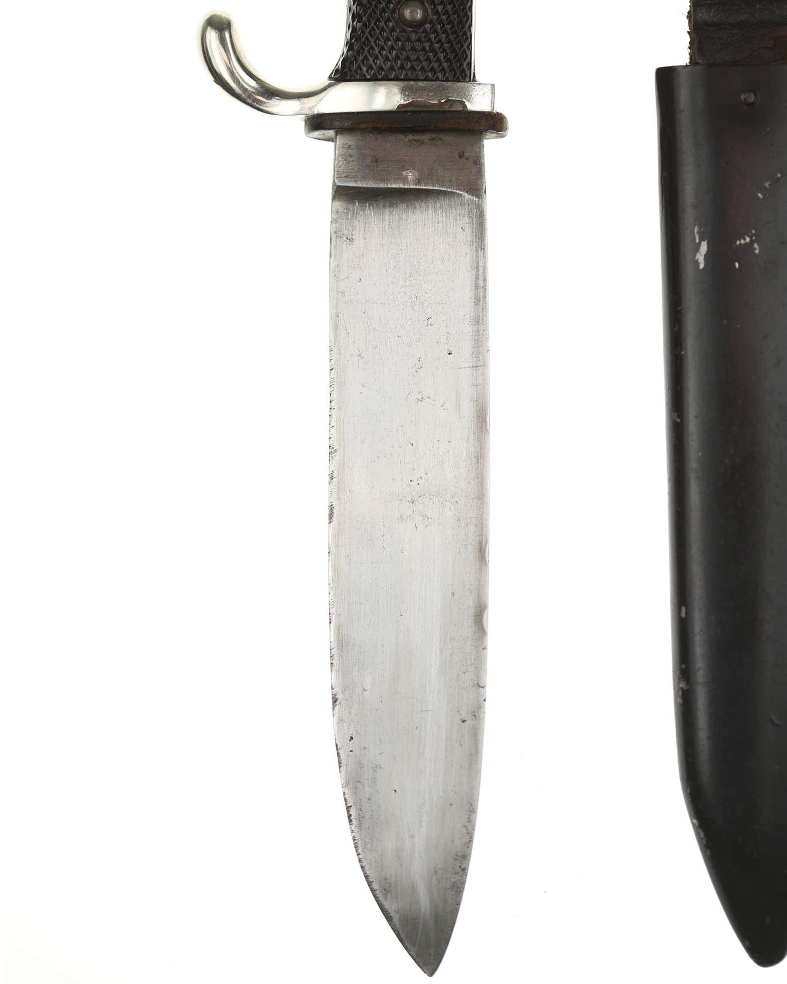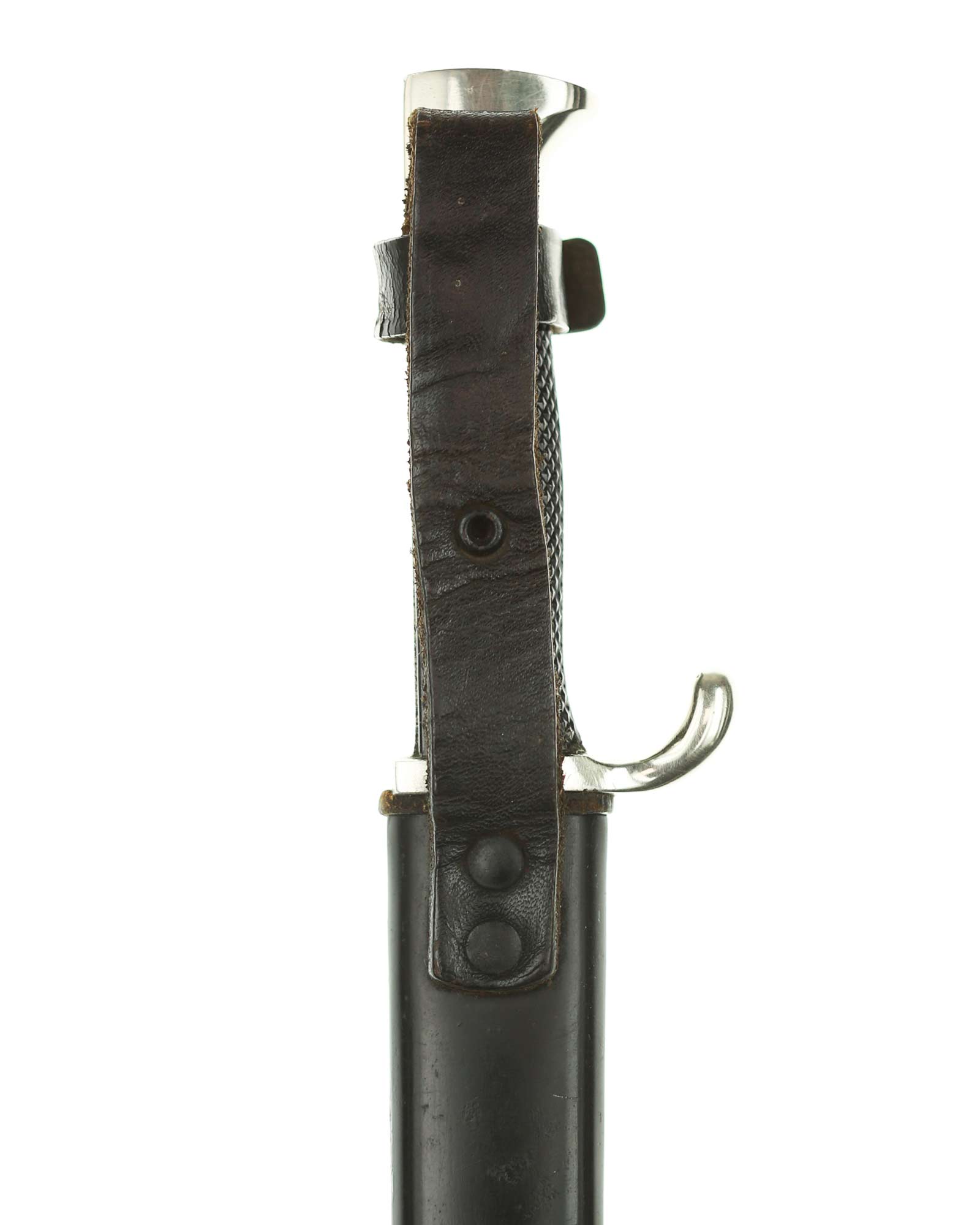 Scabbard: The scabbard shell has good, black paint. This paint has a few mild age spots spread evenly throughout the surface. Attached to the scabbard is an excellent leather hanger.