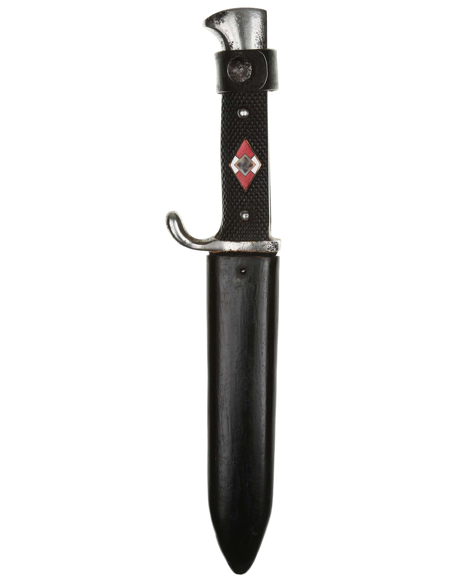 Blade: The blade of this knife is a nice example. The HJ motto etch is deep, with background darkening. This blade is the mid-period type that has a ricasso. The reverse of the blade is marked with loge of the Hörster firm; with the firm's name and location, “E.&F. Hörster Solingen” to the right. The ricasso is marked with a RZM circle placed next to the code “M 7/37” - Robert Klaas Solingen. The leather blade buffer is replaced.