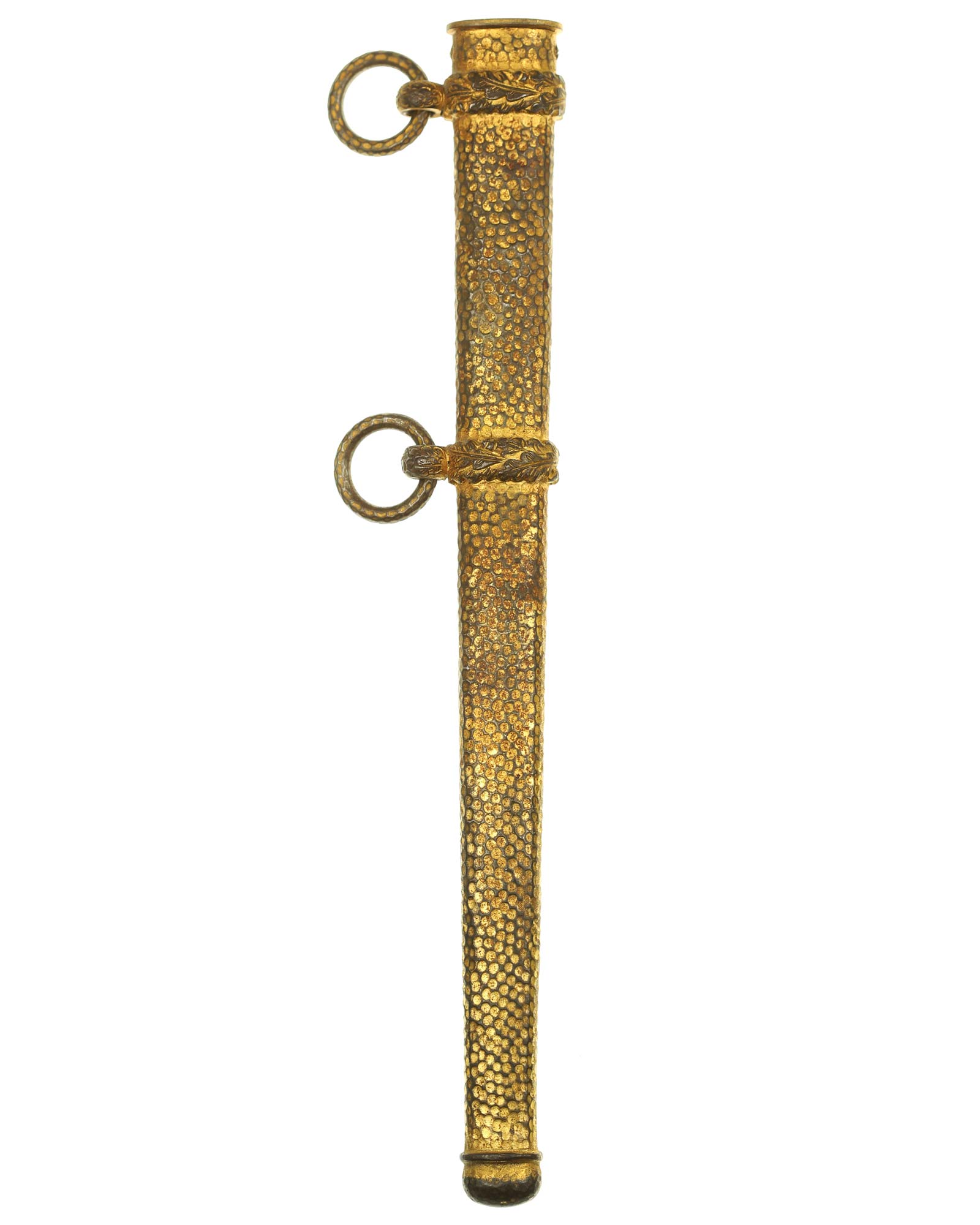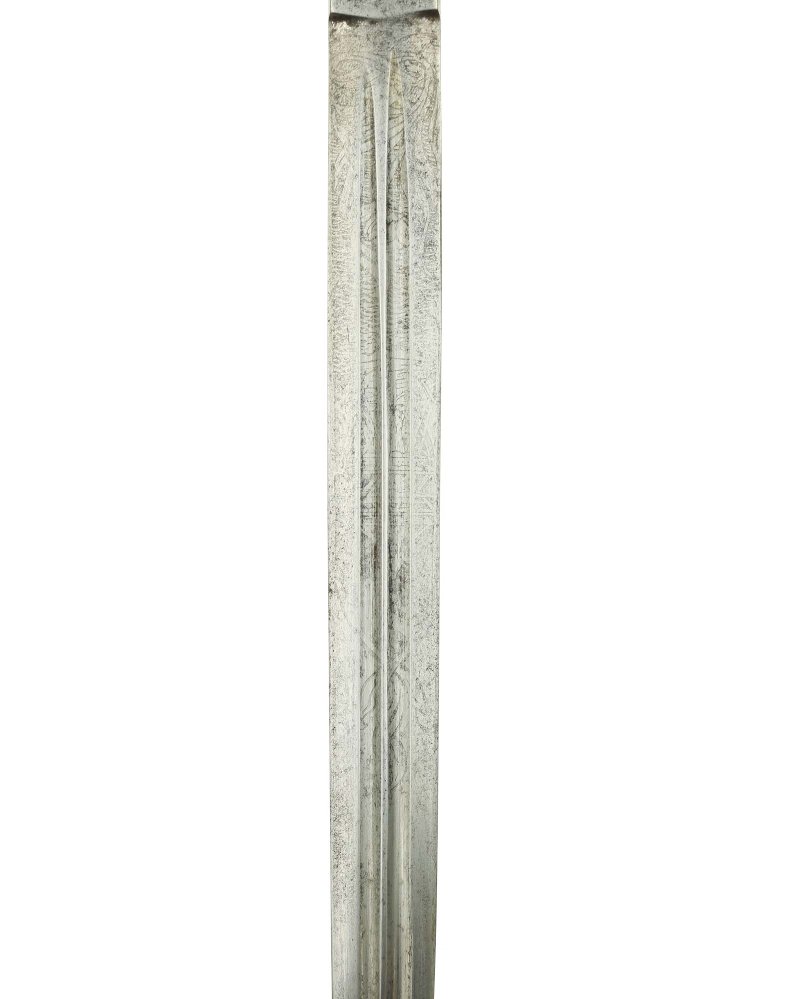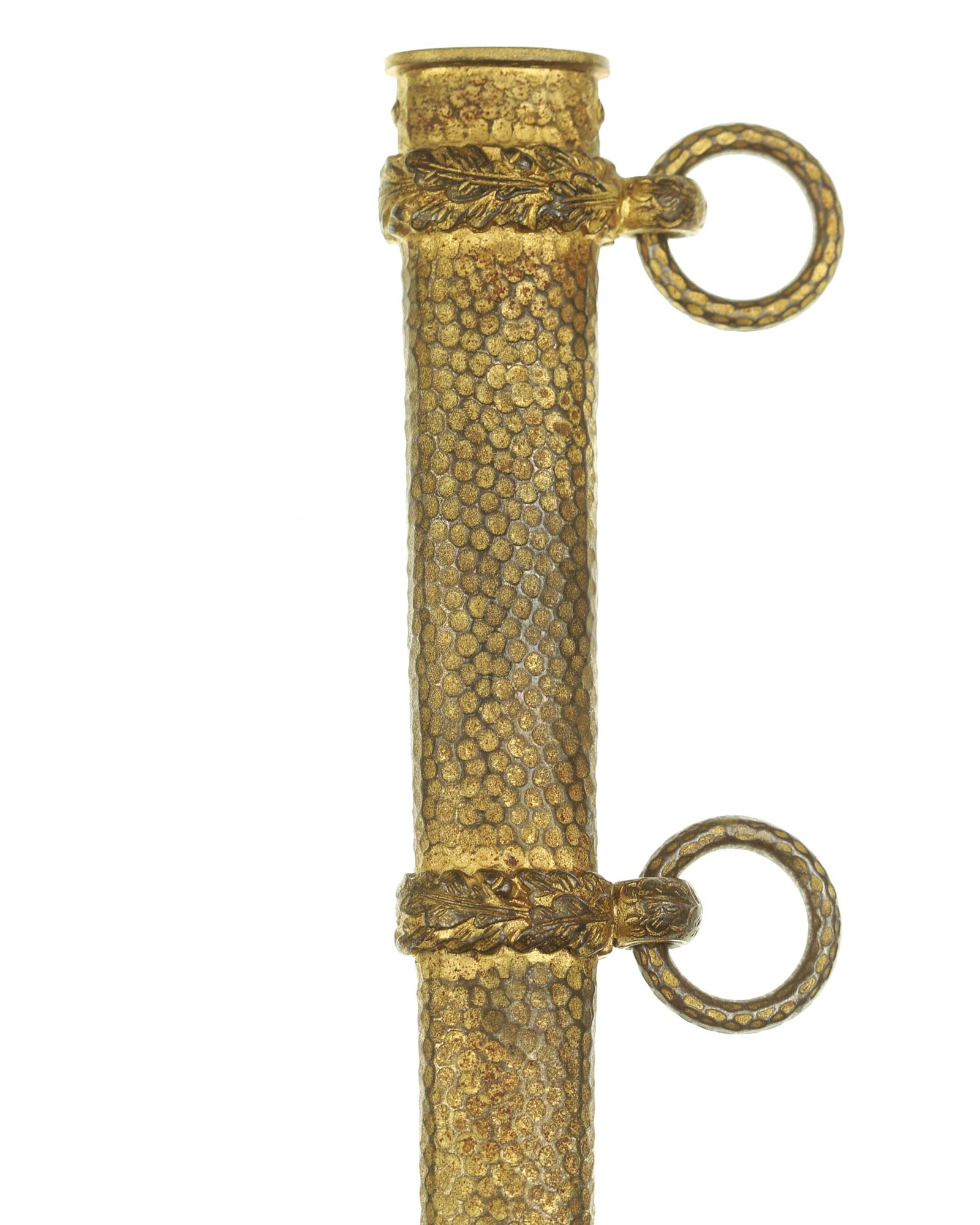 Scabbard: The scabbard is a real beauty. The scabbard is straight throughout and has an excellent hammered finish. This finish is nicely set off by the straight-across bands. These bands feature overlapping oak leaves with acorns in between and show only mild wear. The eyelets have the hammered finish. The throat is retained by two flush mounted side screws