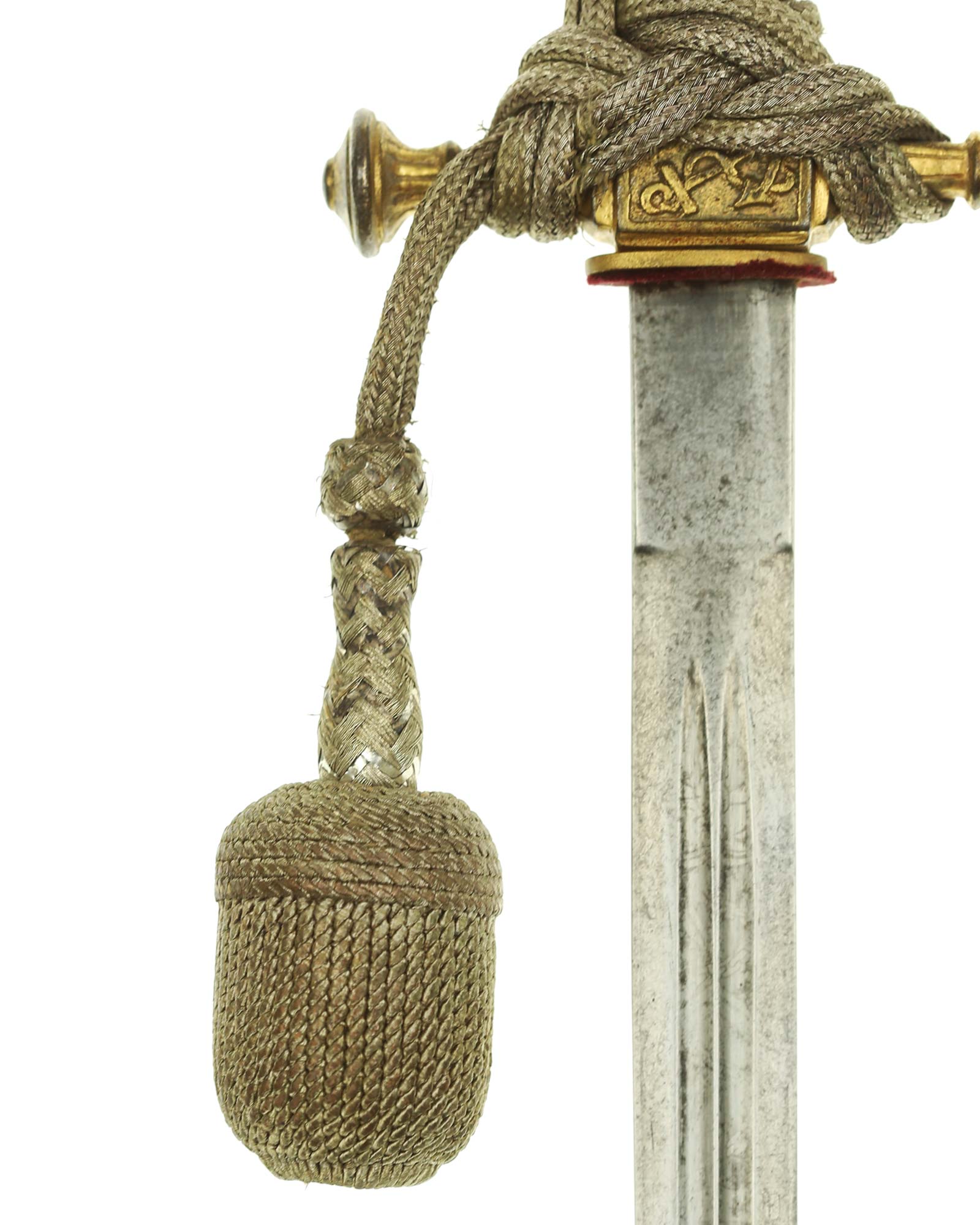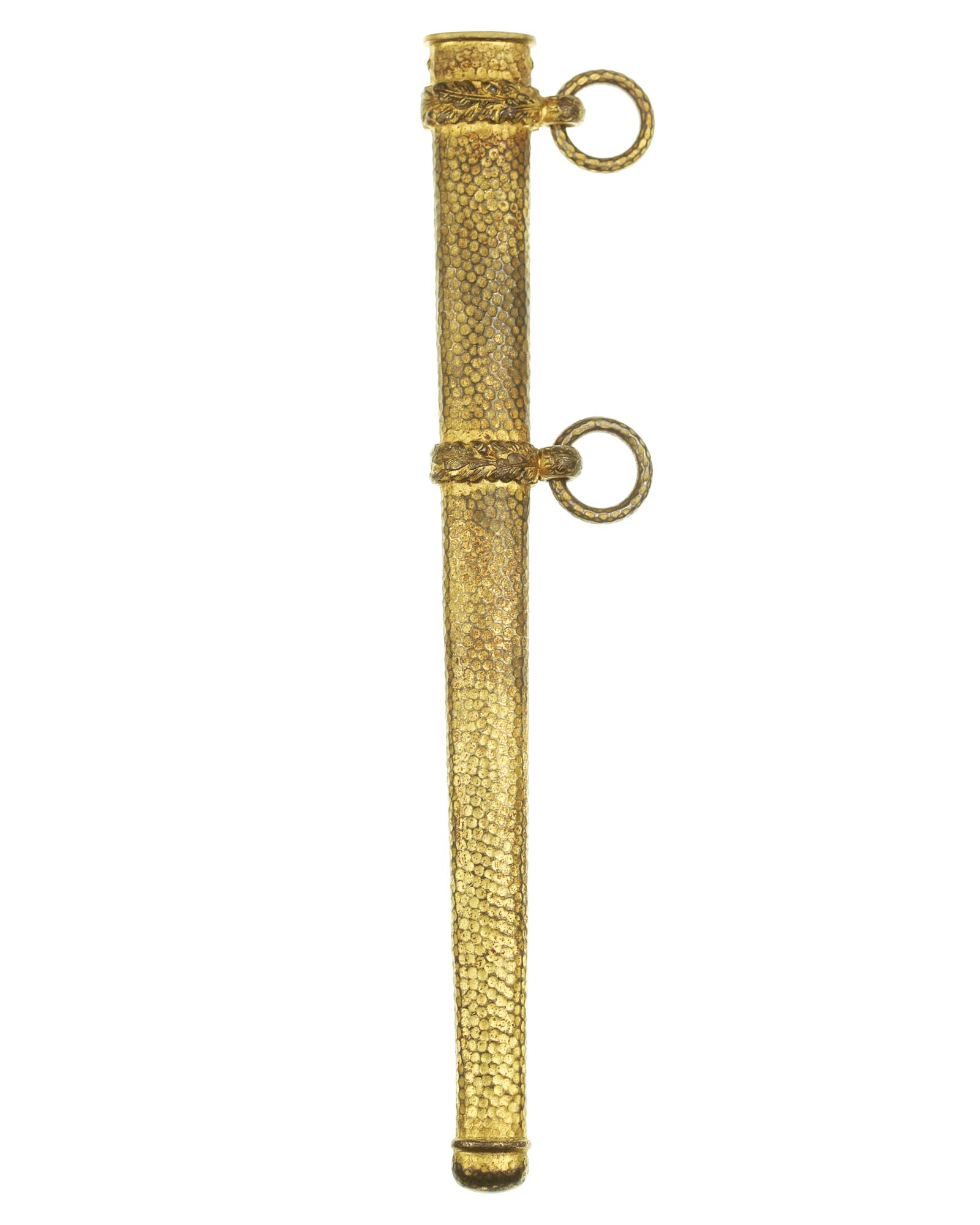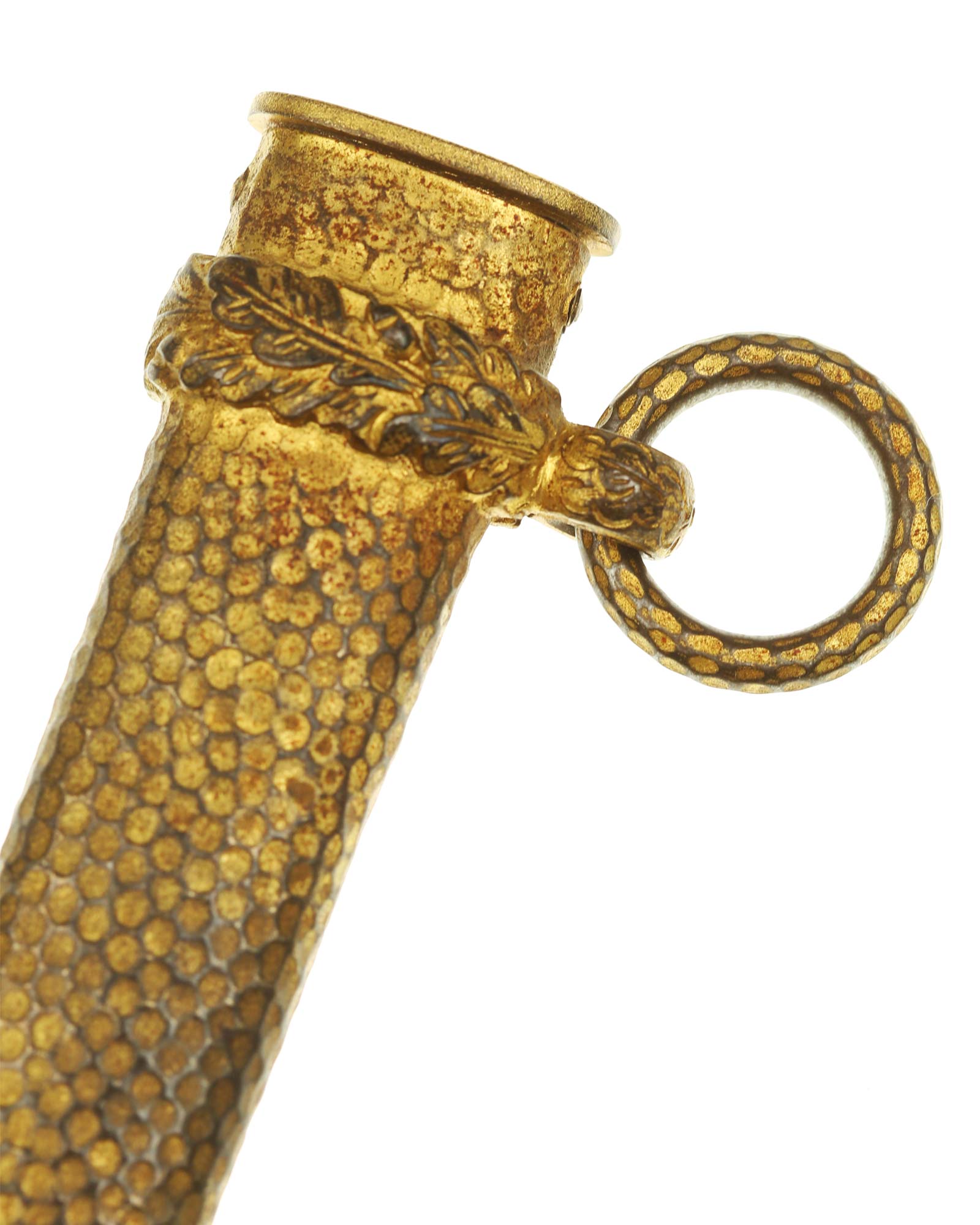 Scabbard: The scabbard is a real beauty. The scabbard is straight throughout and has an excellent hammered finish. This finish is nicely set off by the straight-across bands. These bands feature overlapping oak leaves with acorns in between and show only mild wear. The eyelets have the hammered finish. The throat is retained by two flush mounted side screws