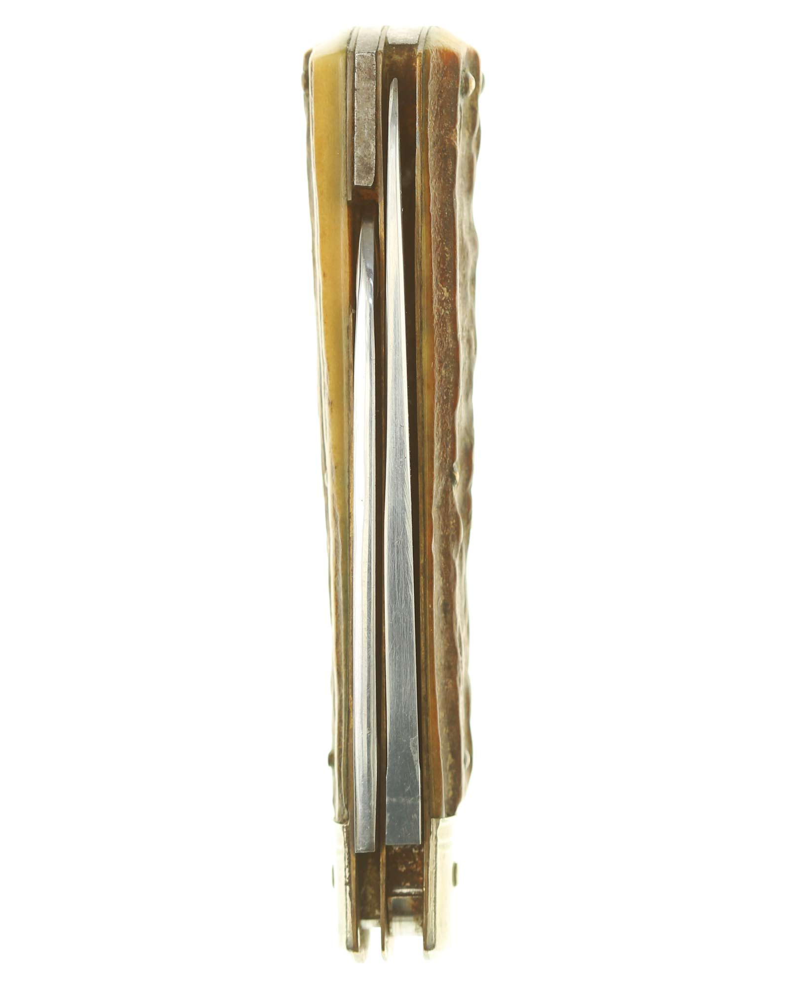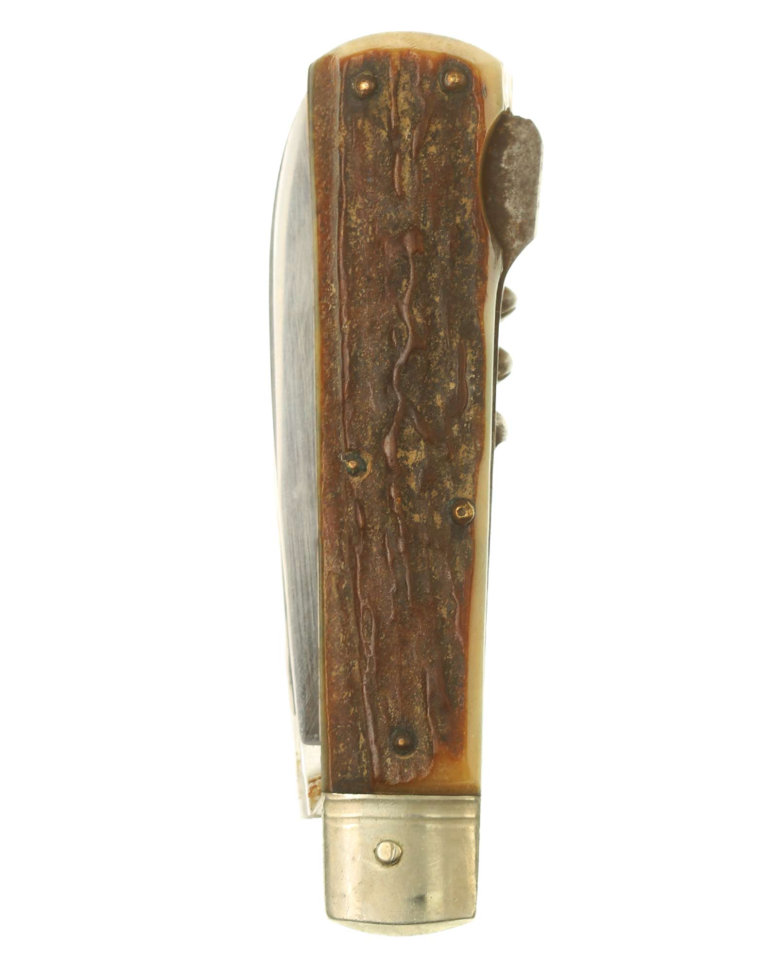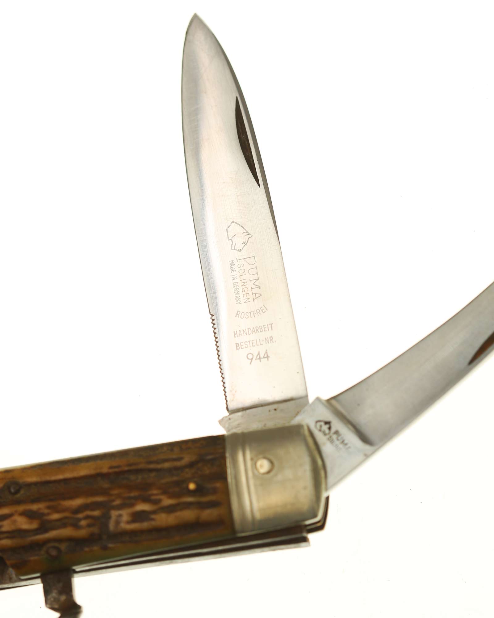 Puma hunting pocket knife with break-open blade and staghorn handle scales. Weight: approx. 152 g.
