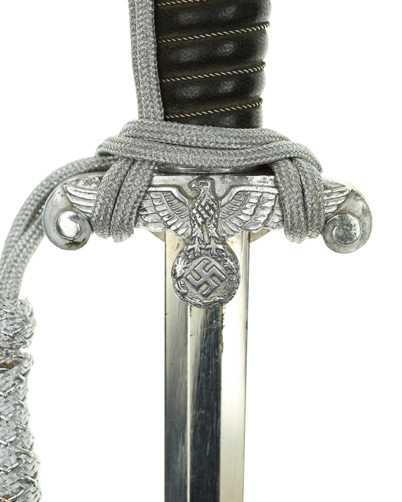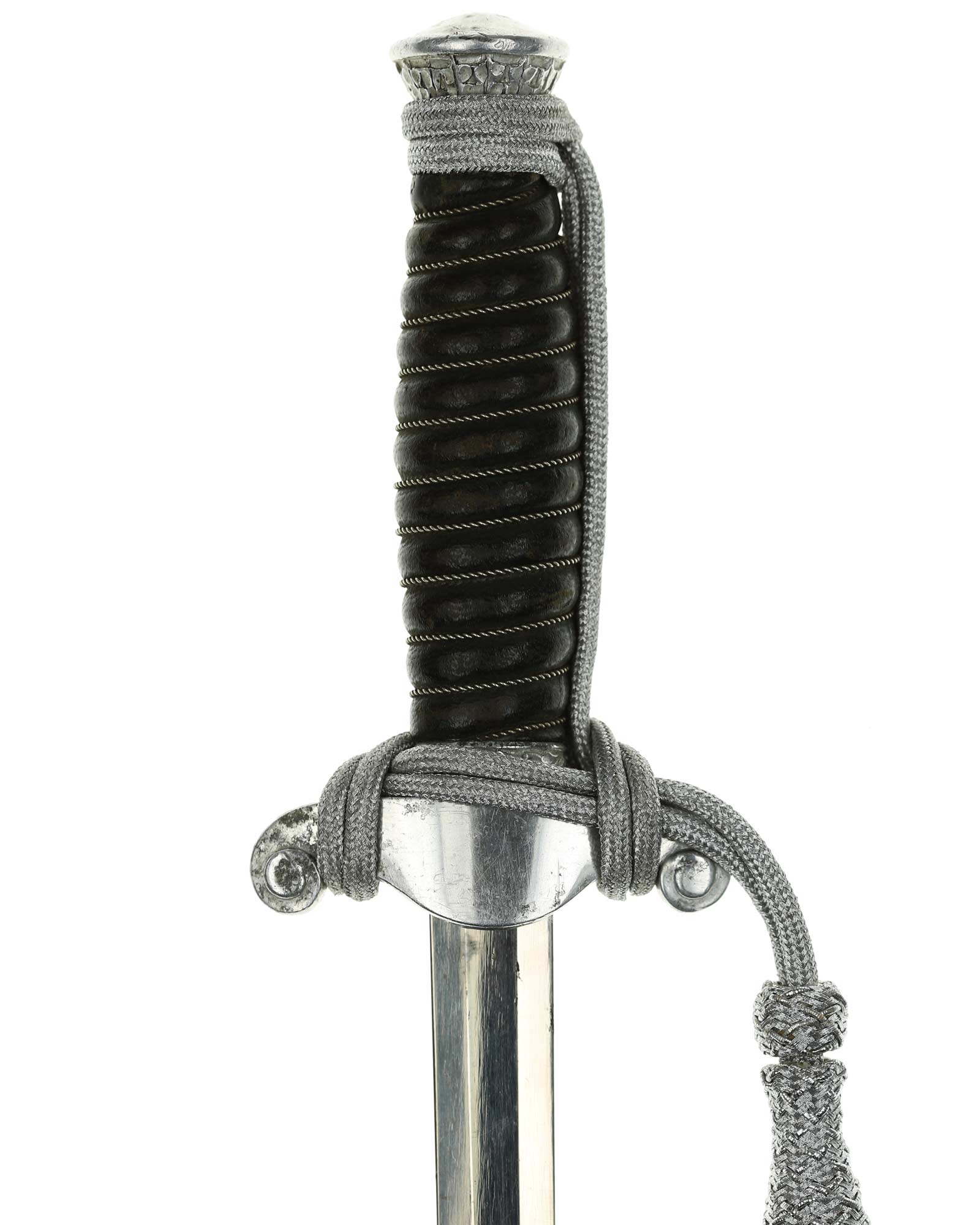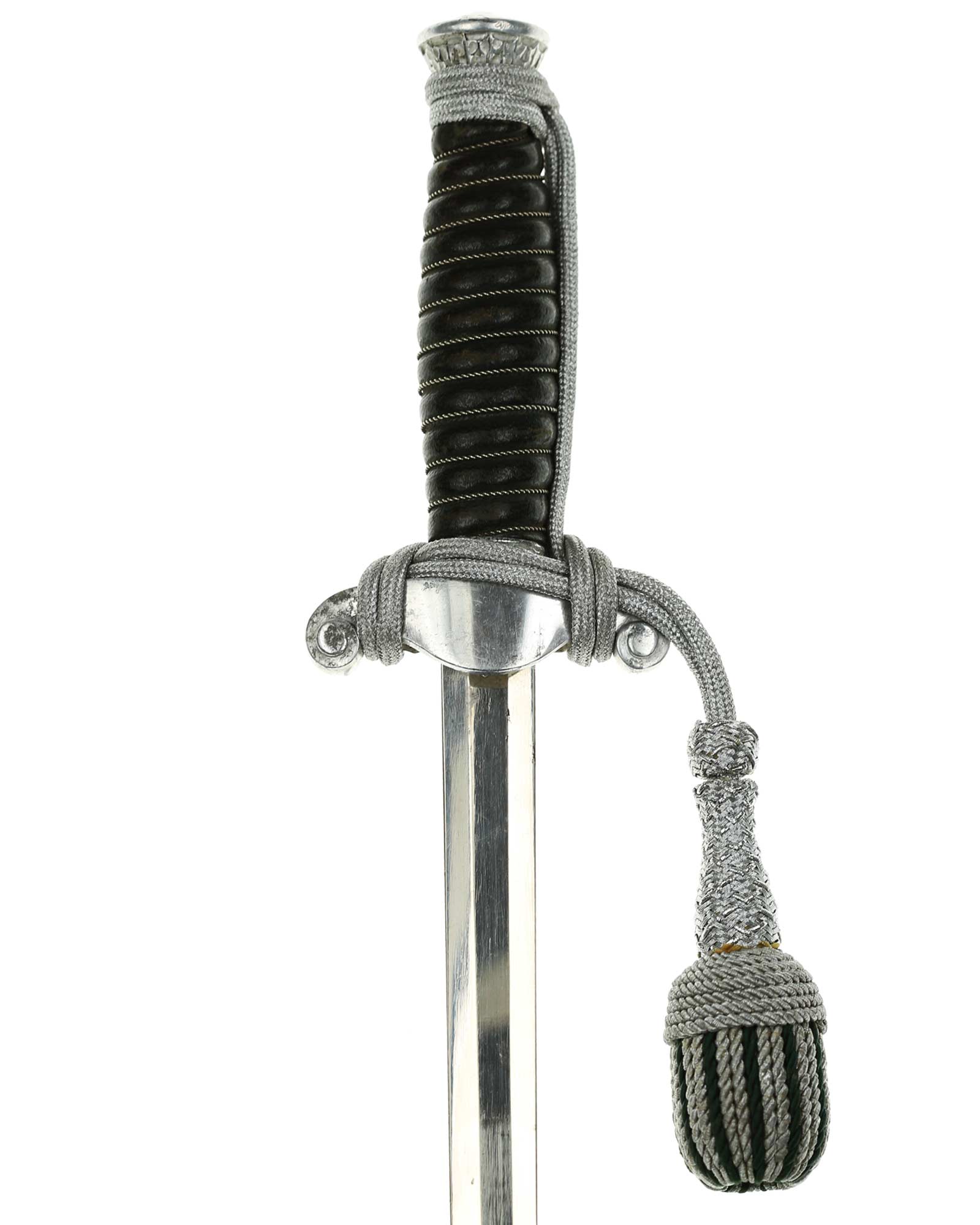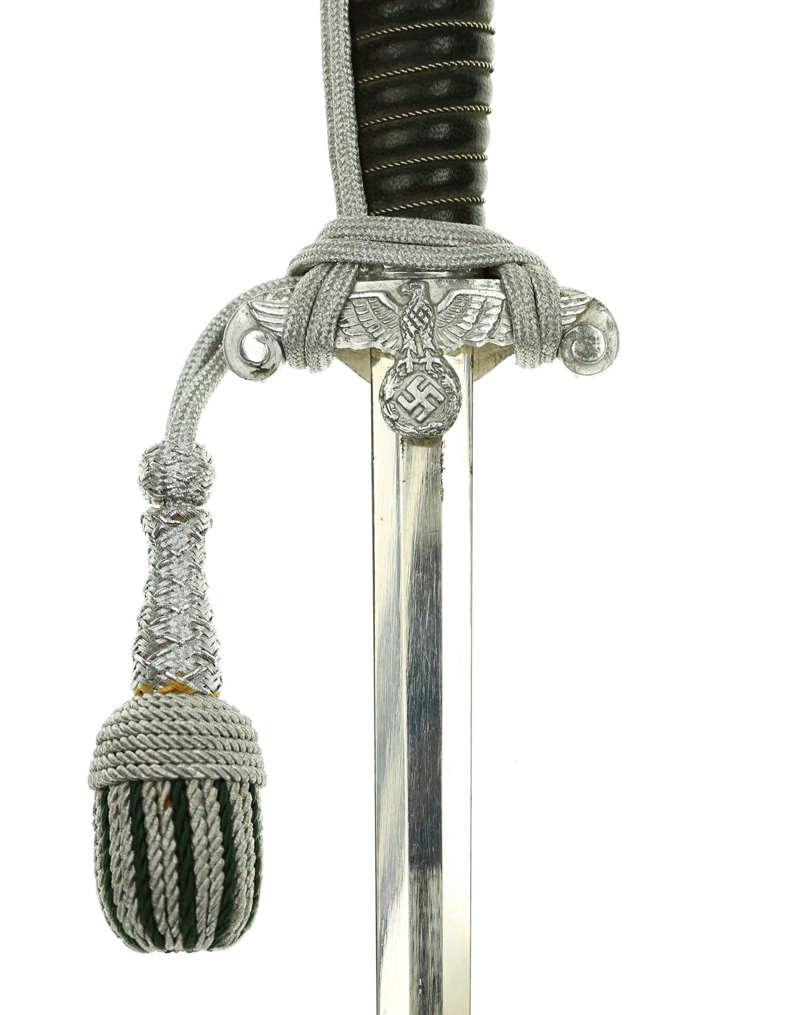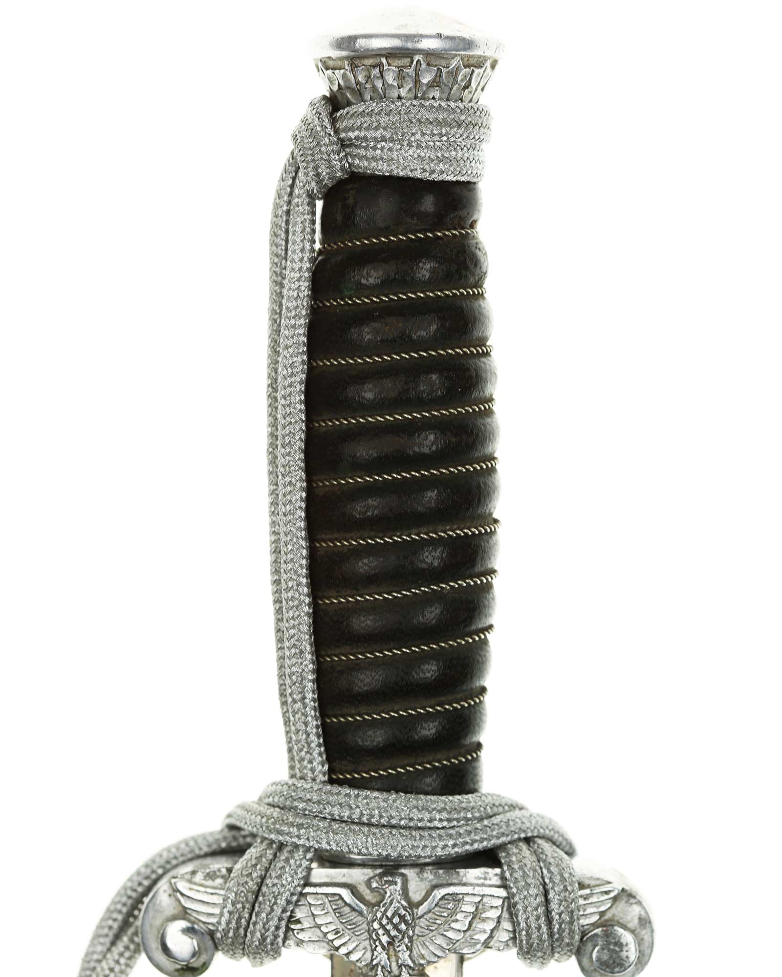 Grip: The carved wooden grip is covered in dark green leather. This leather remains in fine condition. Much of the original grain has been smoothed down but the grip looks fine. It is tightly wrapped with twisted silver wire. The aluminum crossguard is a beauty, with fine, smooth surfaces on the reverse. The eagle has the traditional wing tips which curve upward, and retains full, sharp detailing throughout. The top of the pommel cap shows some normal wear and has a couple of minor hits along the edges, but it is not too bad. The 14 standing Customs style oak leaves (with the points at the top) have each been hand enhanced. The same is true of the oak leaves on the aluminum ferrule. Wrapped about the hilt is a near mint condition 42 cm portepee.