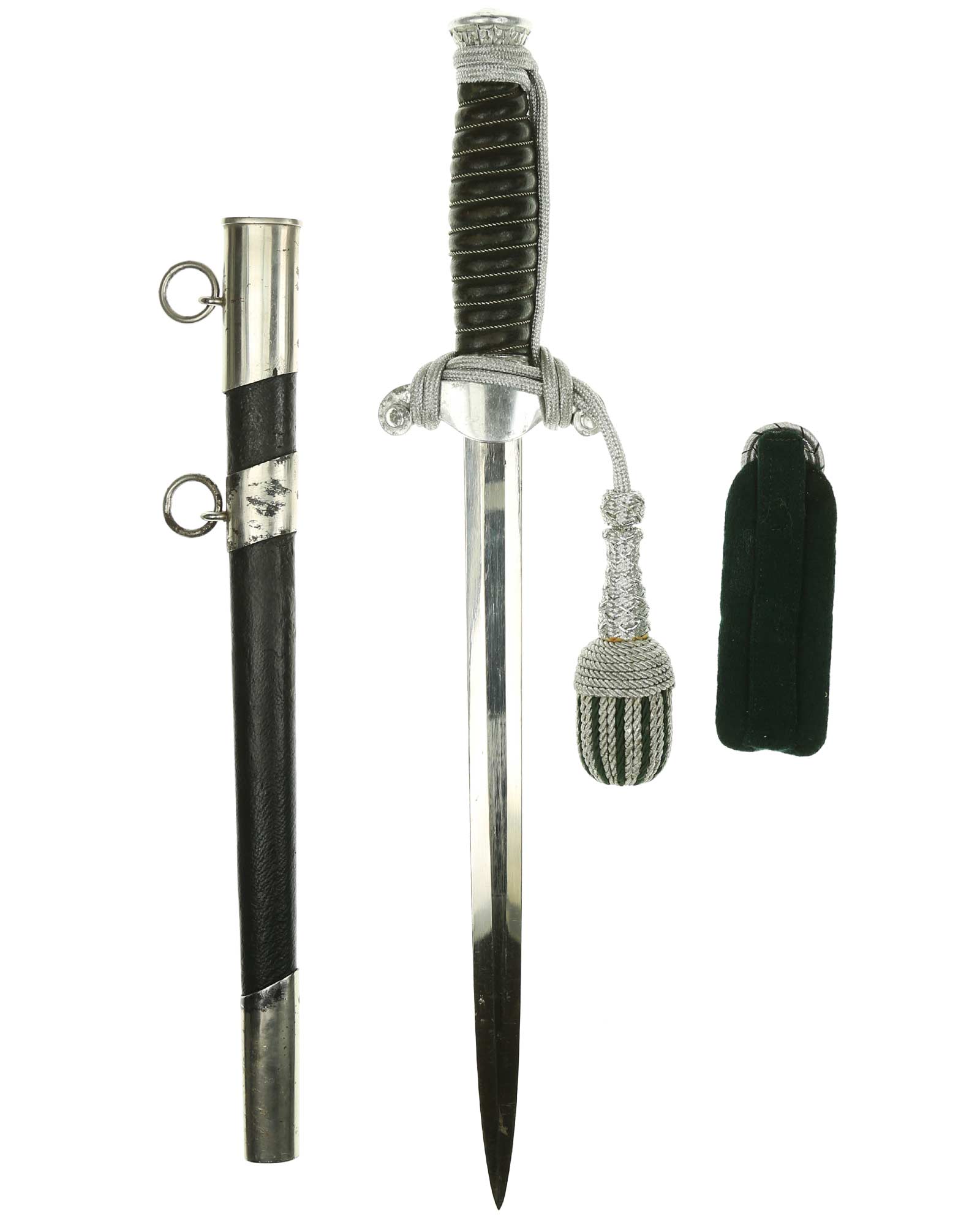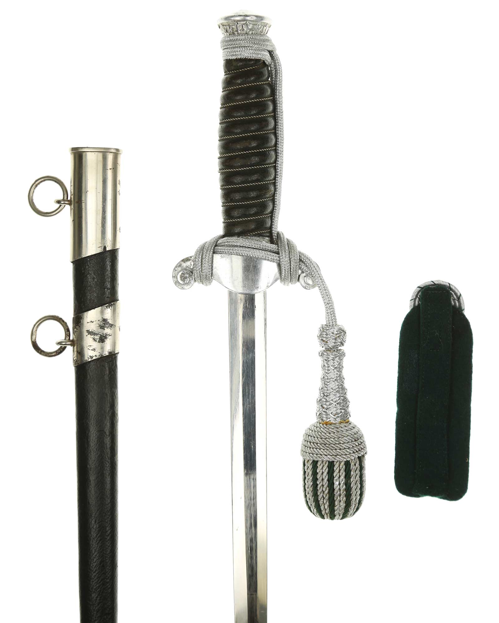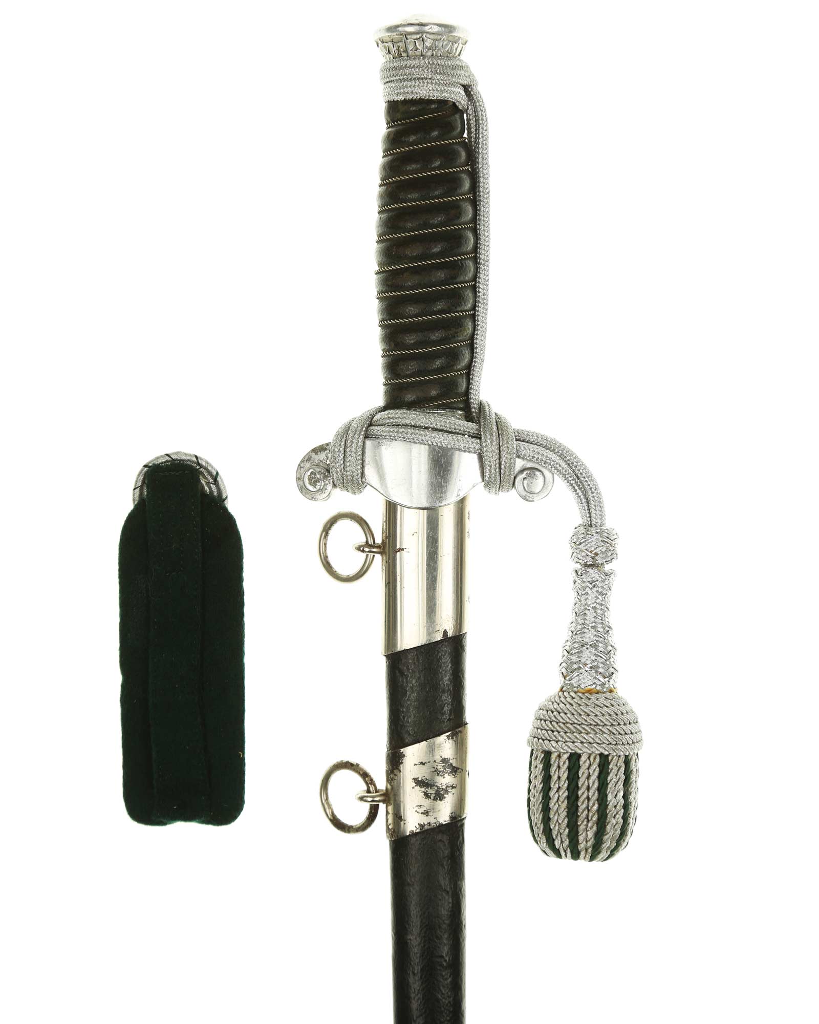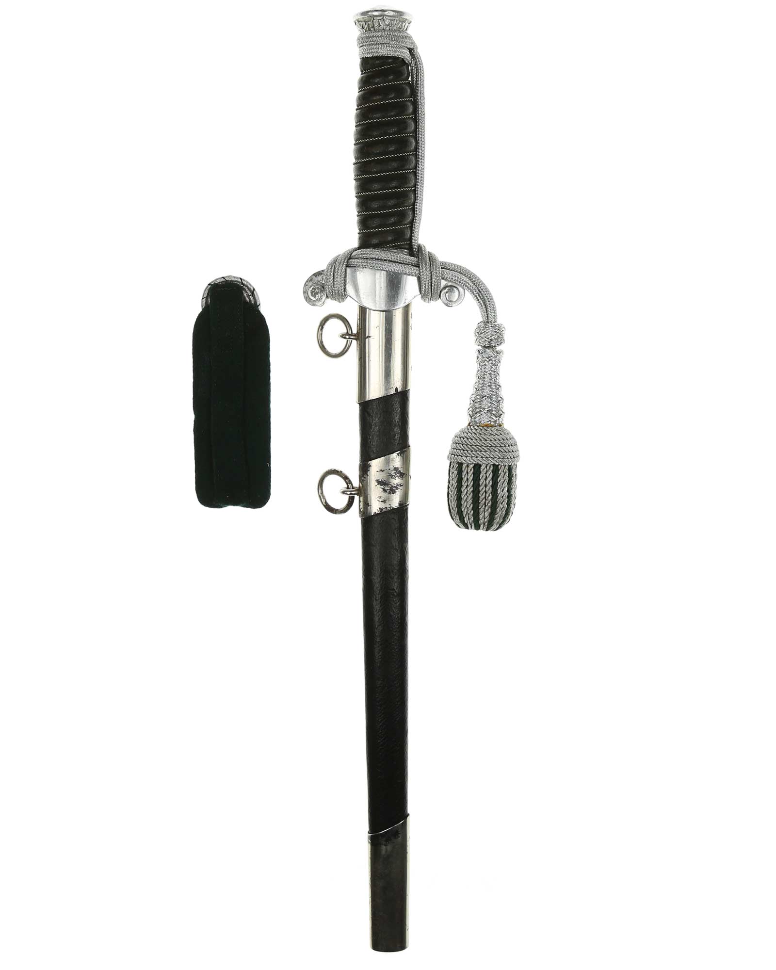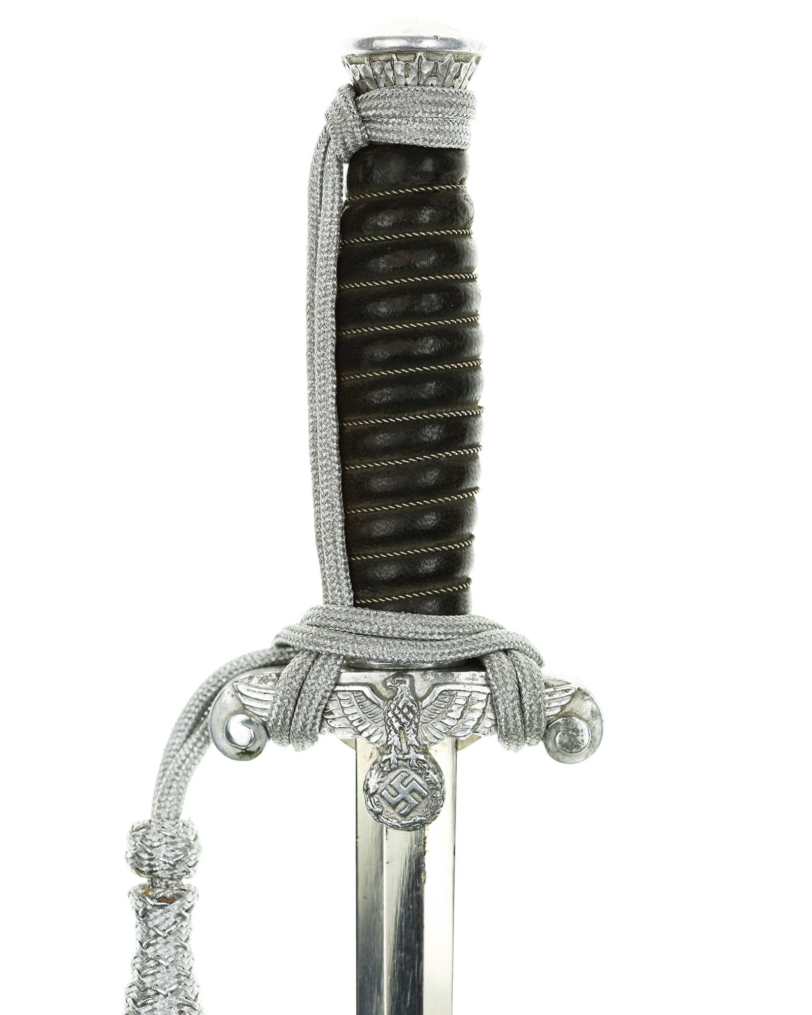 Grip: The carved wooden grip is covered in dark green leather. This leather remains in fine condition. Much of the original grain has been smoothed down but the grip looks fine. It is tightly wrapped with twisted silver wire. The aluminum crossguard is a beauty, with fine, smooth surfaces on the reverse. The eagle has the traditional wing tips which curve upward, and retains full, sharp detailing throughout. The top of the pommel cap shows some normal wear and has a couple of minor hits along the edges, but it is not too bad. The 14 standing Customs style oak leaves (with the points at the top) have each been hand enhanced. The same is true of the oak leaves on the aluminum ferrule. Wrapped about the hilt is a near mint condition 42 cm portepee.
