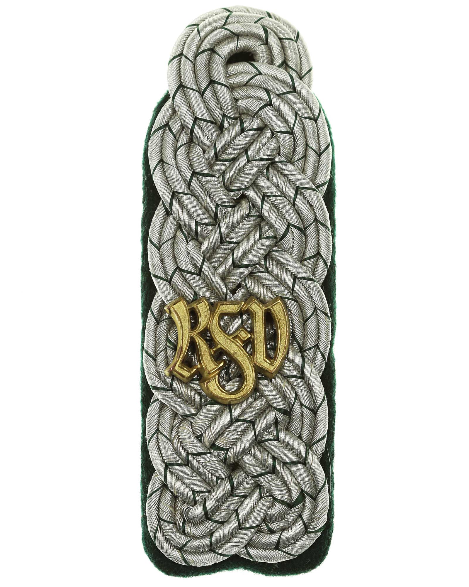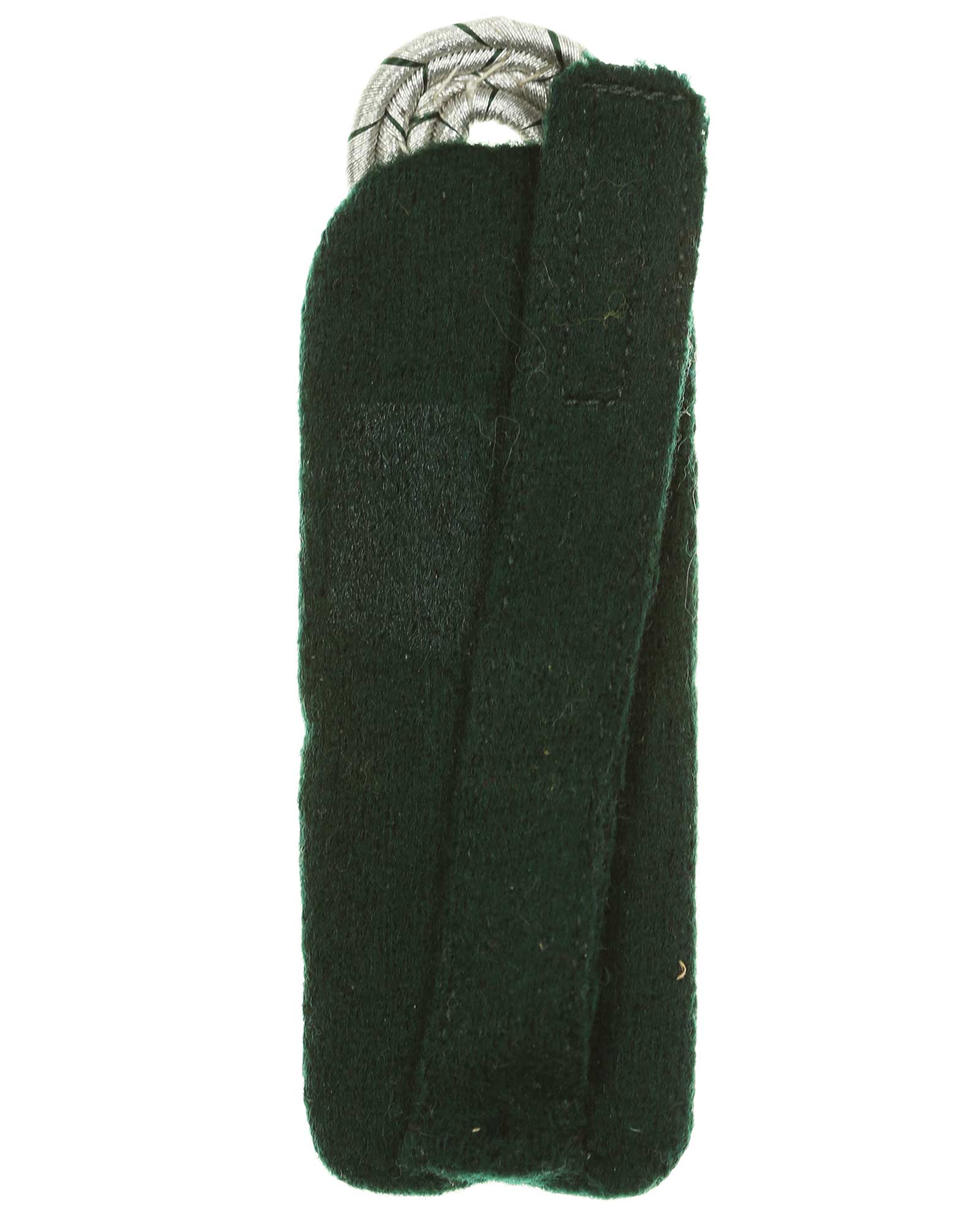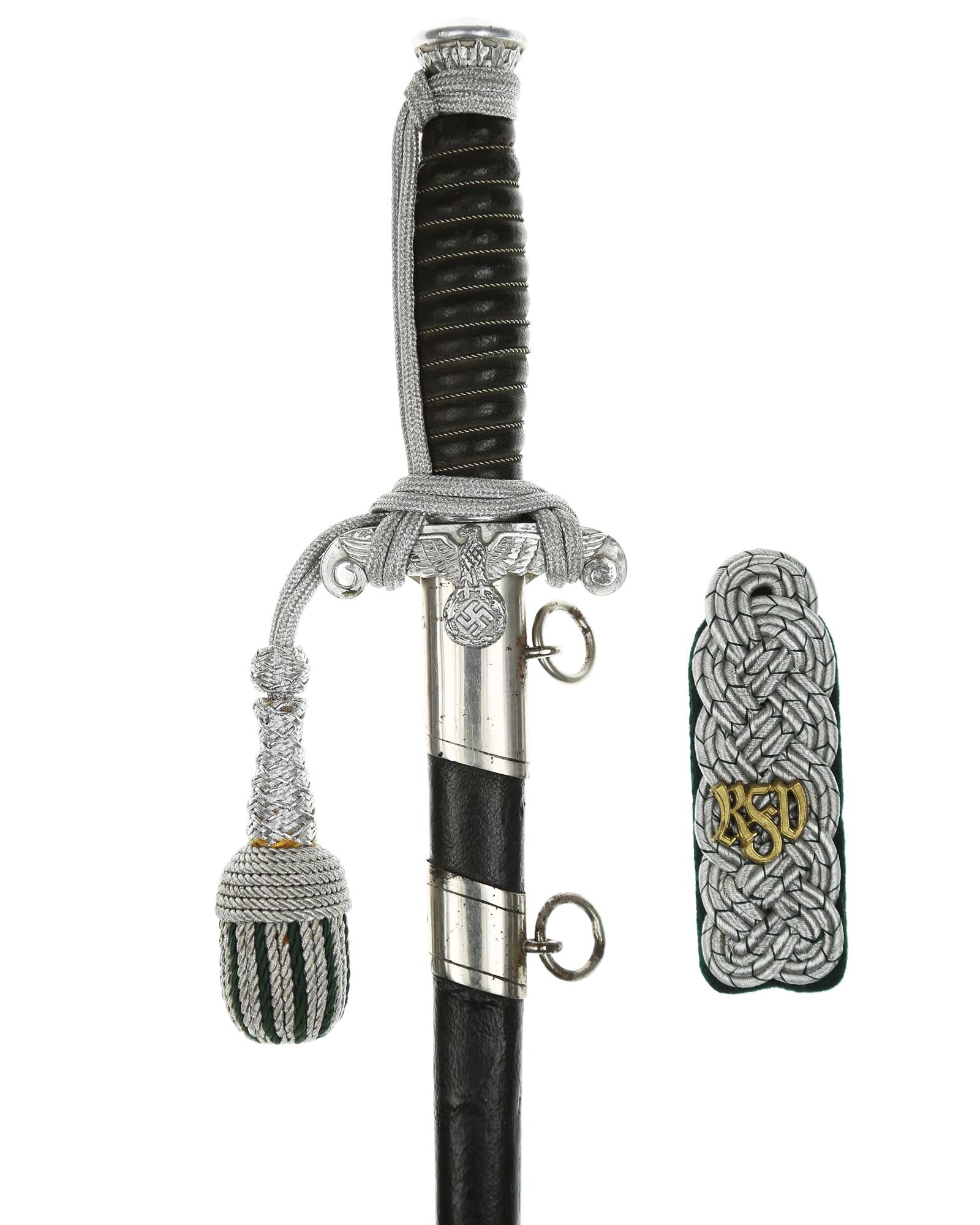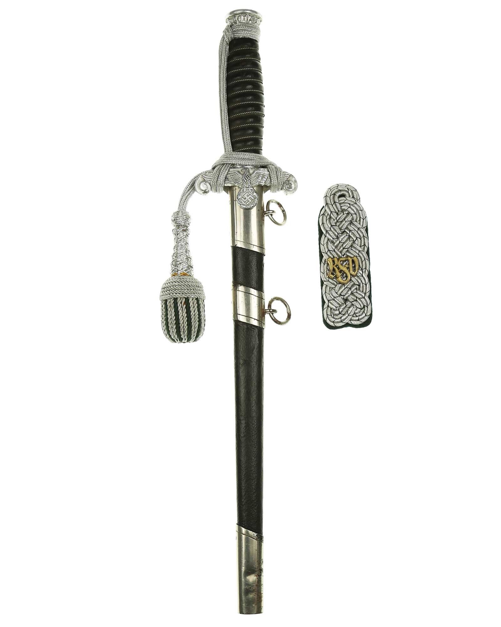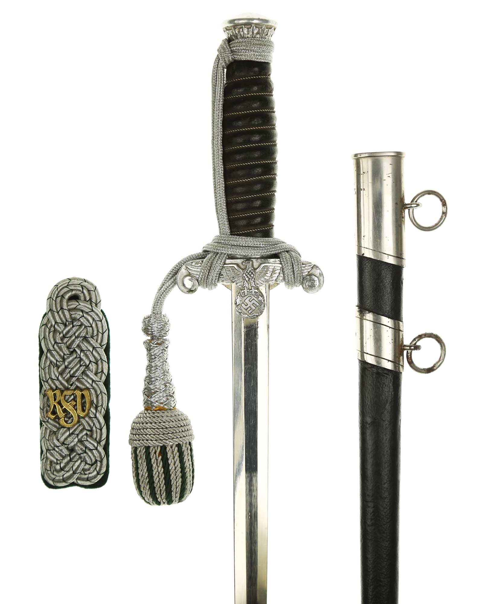 Grip: The carved wooden grip is covered in dark green leather. This leather remains in fine condition. Much of the original grain has been smoothed down but the grip looks fine. It is tightly wrapped with twisted silver wire. The aluminum crossguard is a beauty, with fine, smooth surfaces on the reverse. The eagle has the traditional wing tips which curve upward, and retains full, sharp detailing throughout. The top of the pommel cap shows some normal wear and has a couple of minor hits along the edges, but it is not too bad. The 14 standing Customs style oak leaves (with the points at the top) have each been hand enhanced. The same is true of the oak leaves on the aluminum ferrule. Wrapped about the hilt is a near mint condition 42 cm portepee.