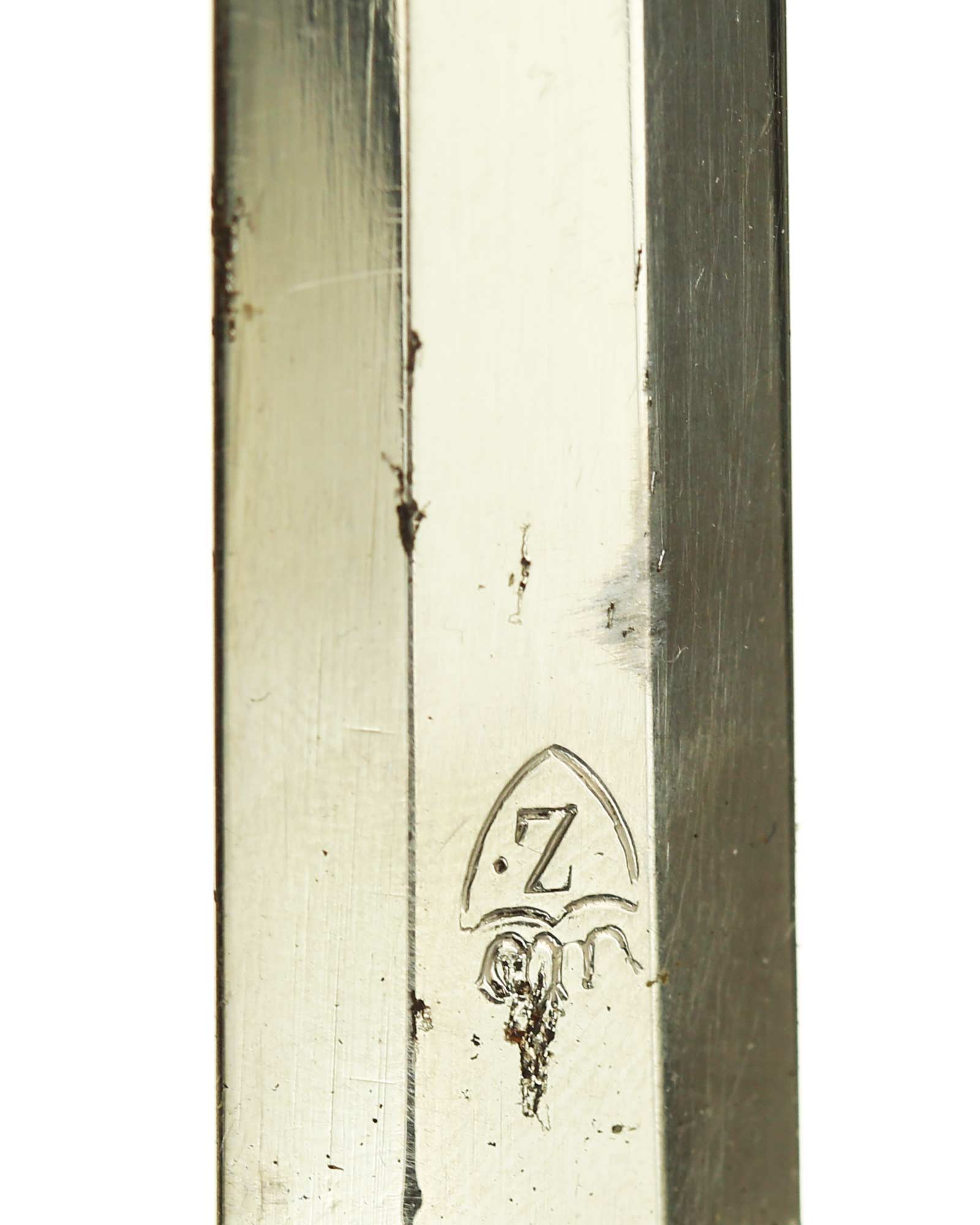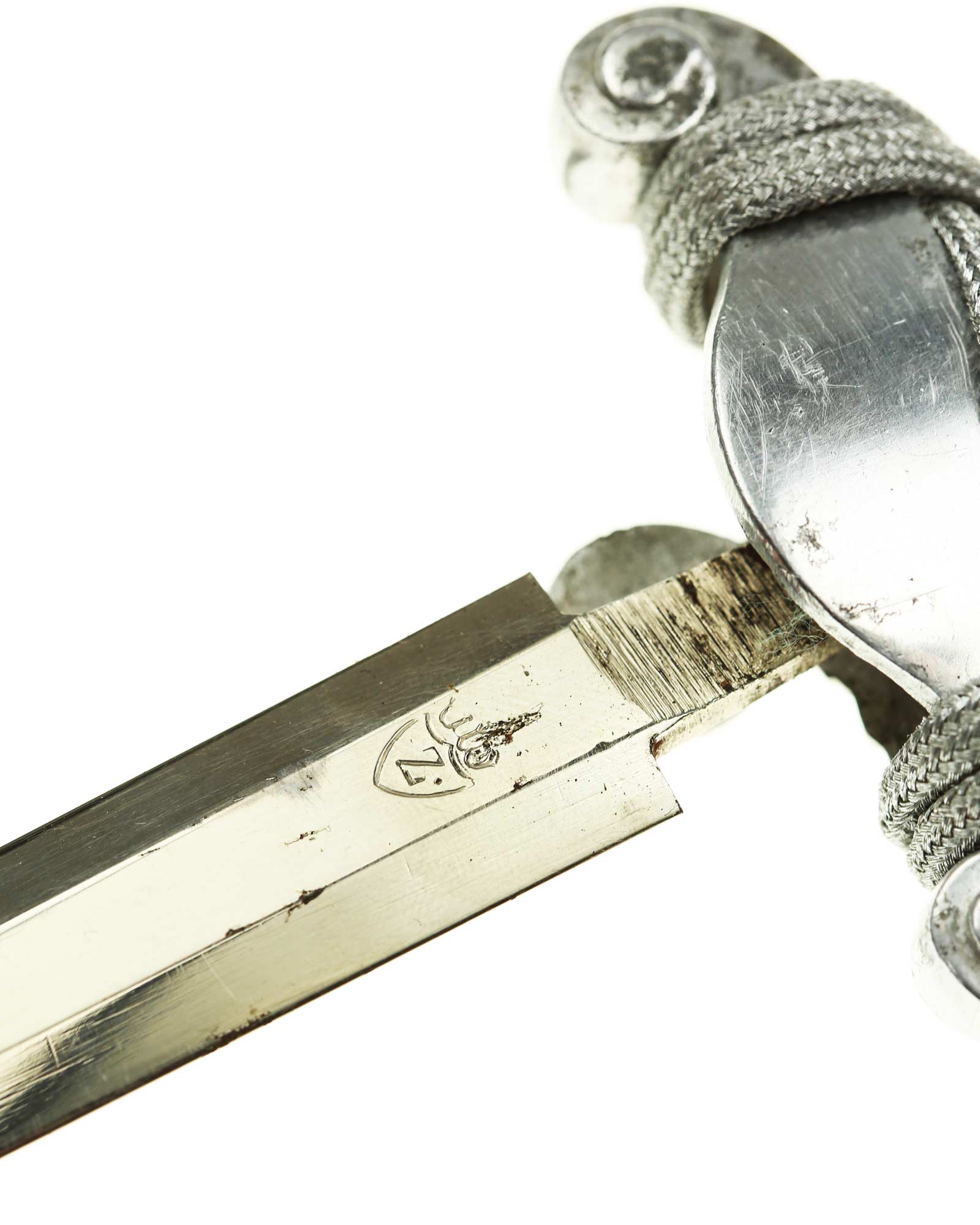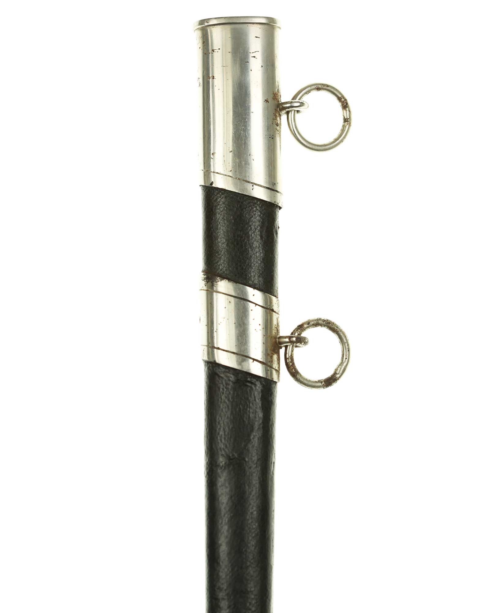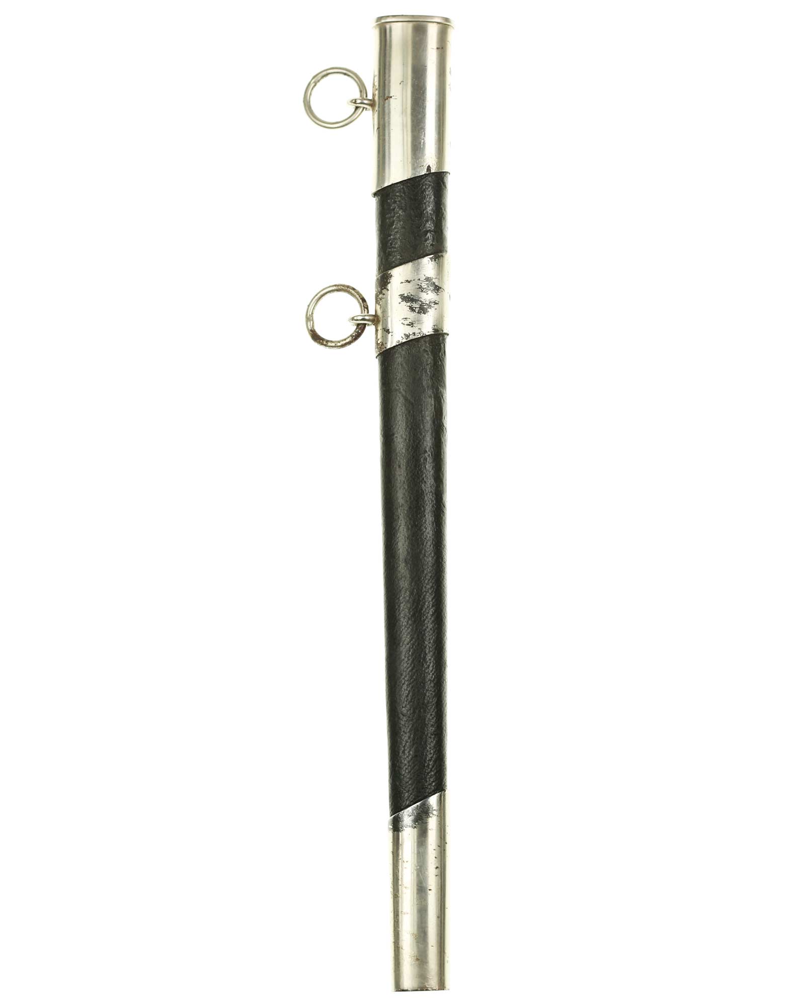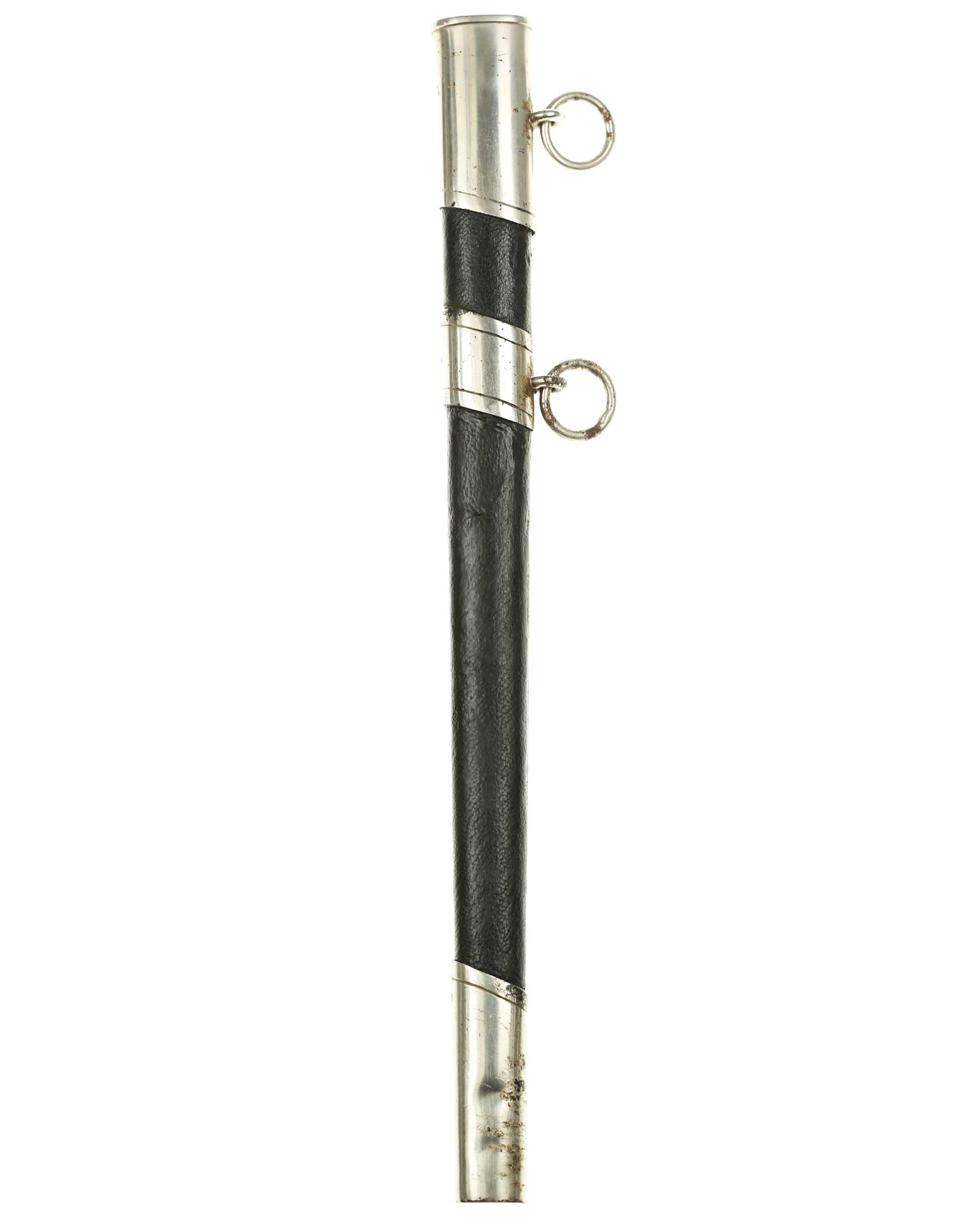 Scabbard: The scabbard shell is a fine, straight example, constructed of steel. It is covered in original dark green leather which remains in excellent condition, with only modest wear and most of the grain. It nicely matches that used on the grip. The mounts are nickel-plated steel and remain in excellent condition. They are the type with decorative lines on obverse edges, rained by headless screws set on the left hand side. The throat is the type that is built into the upper scabbard mount.