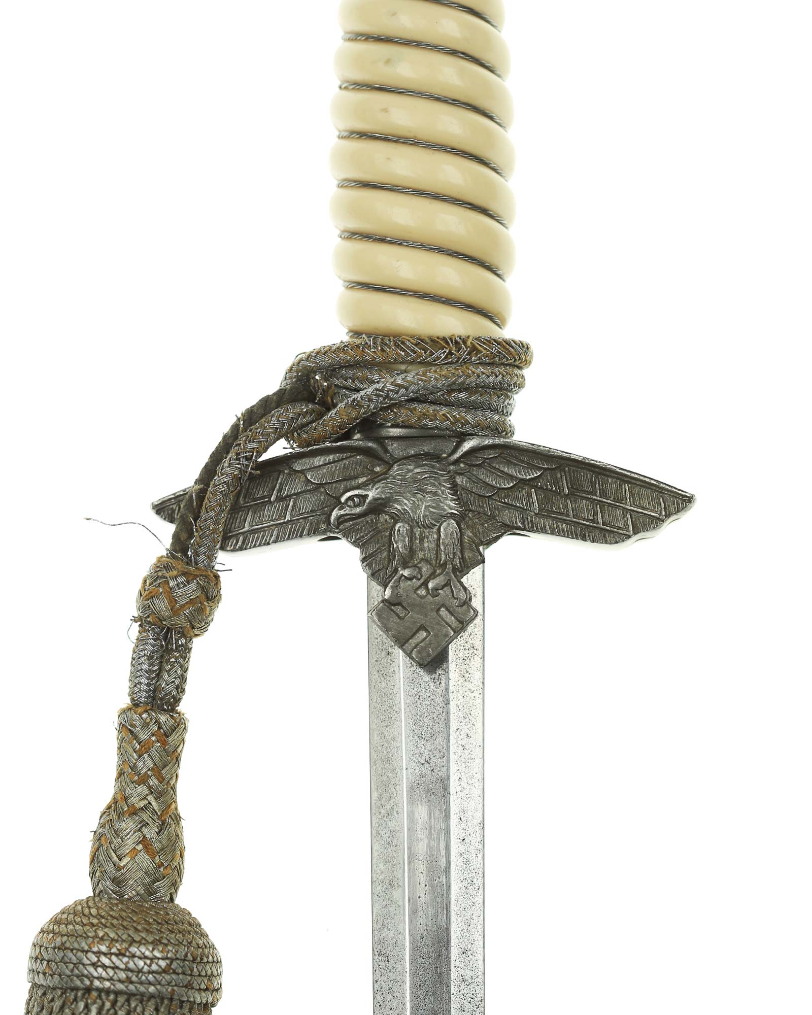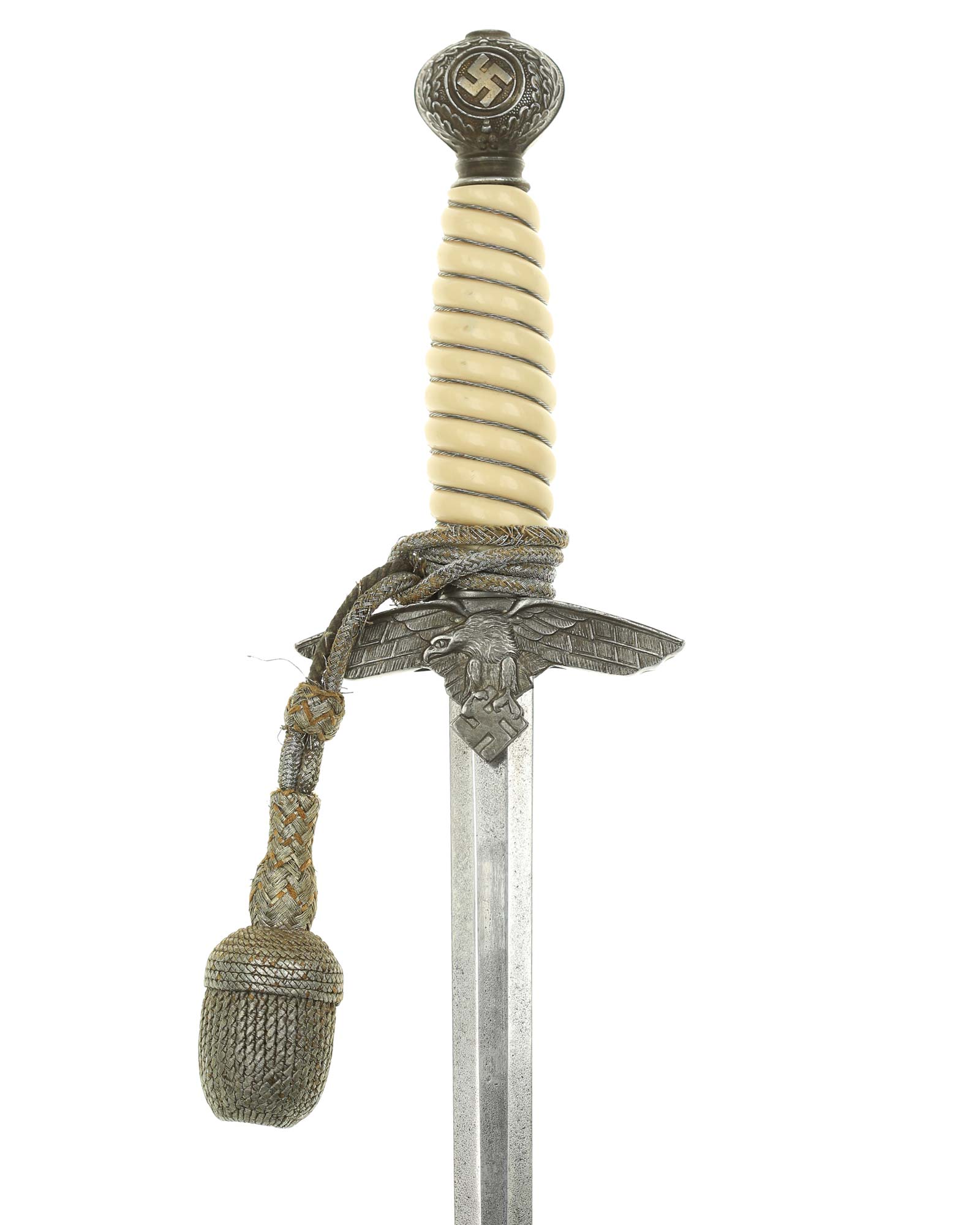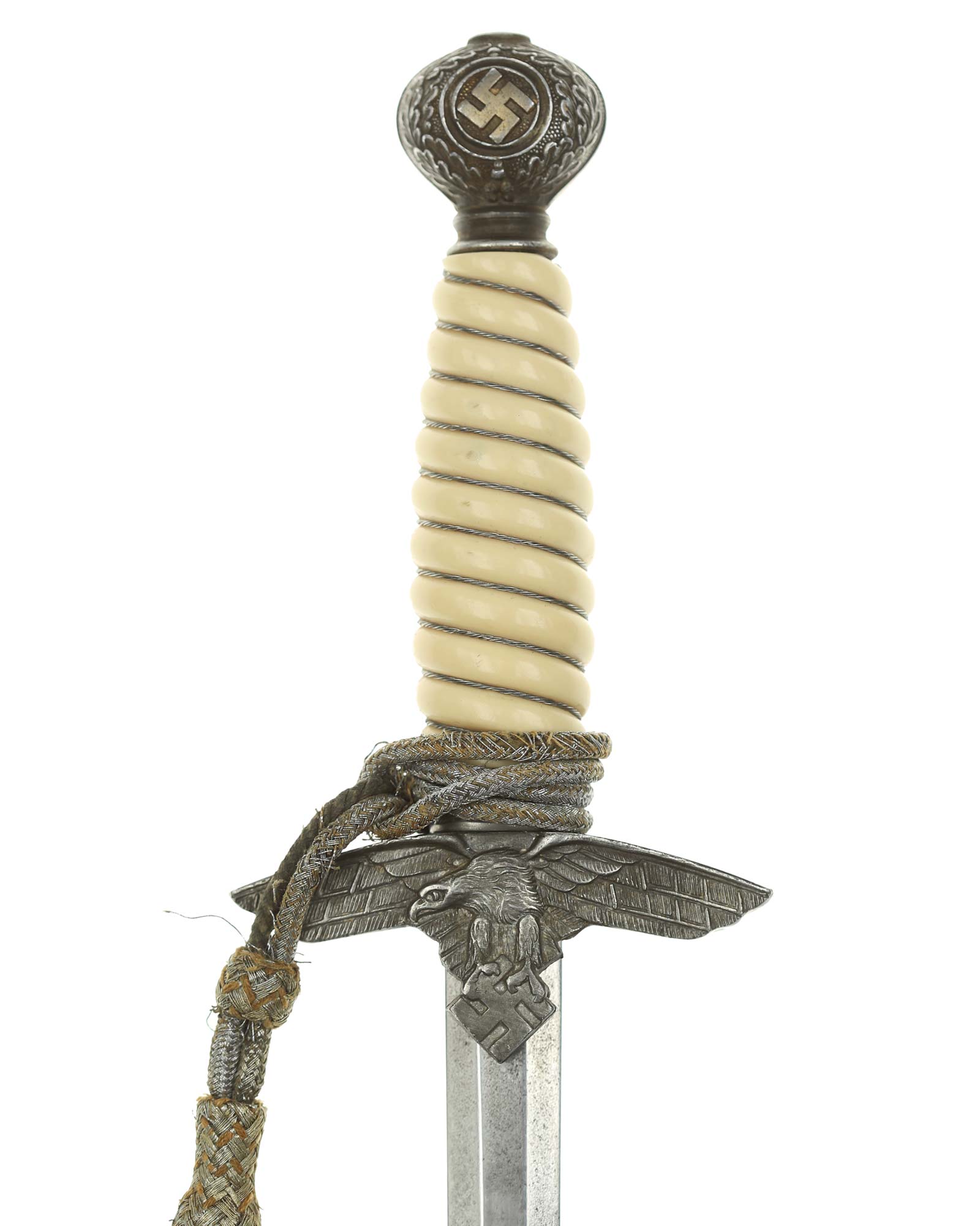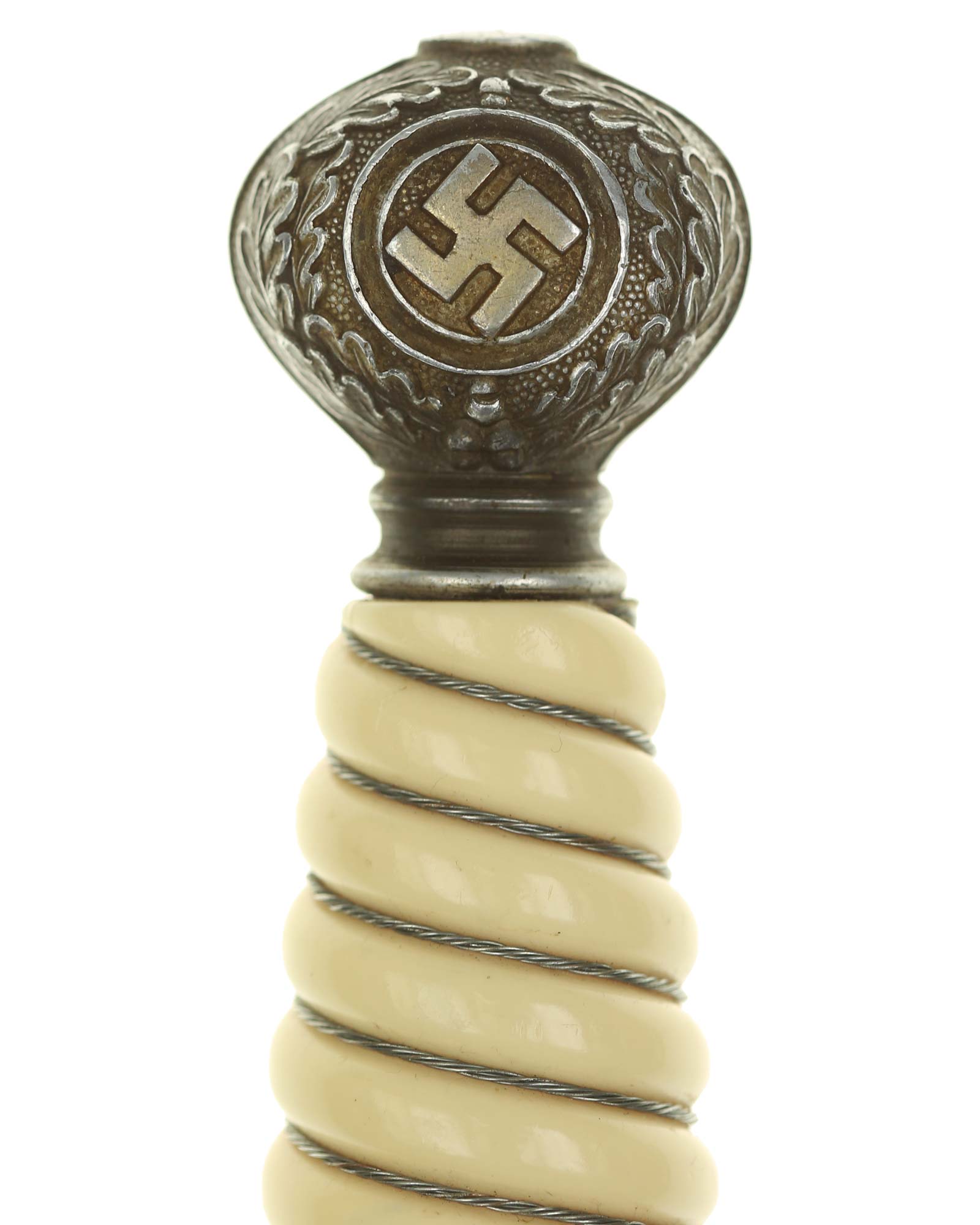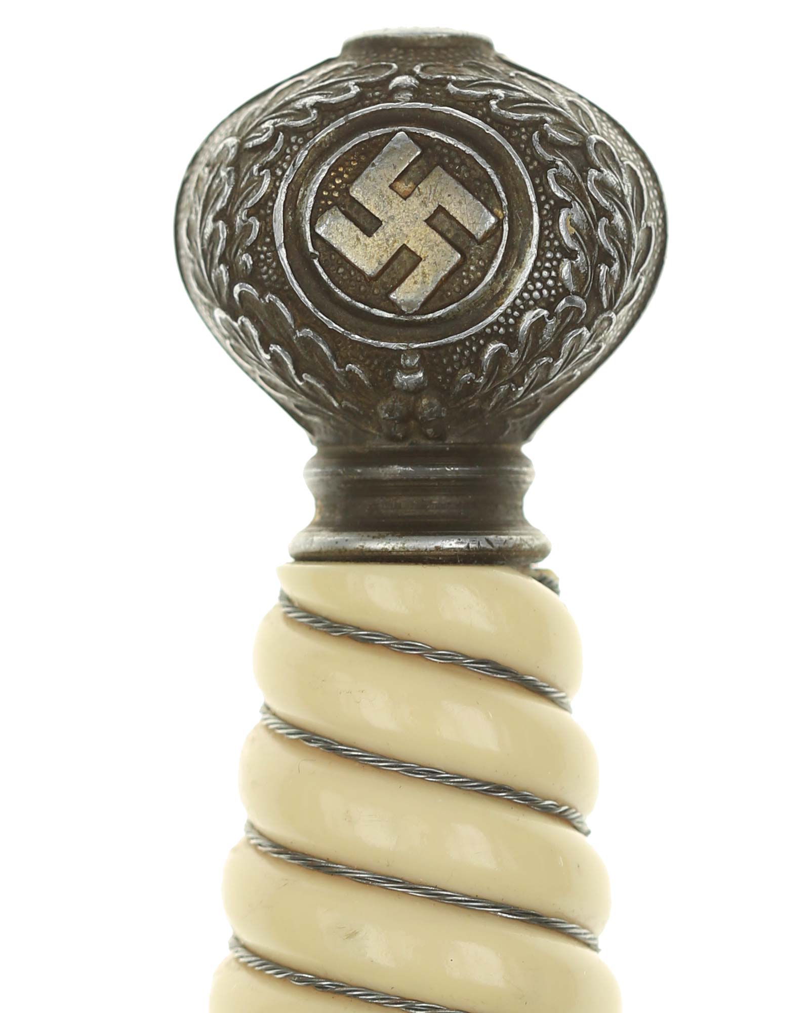 Grip: The Grip of this dagger is a fine, yellow-white color. It is tightly wrapped with twisted silver wire. The pommel is the style with pebbled backgrounds to the oak leaves. These oak leaves are nicely detailed, and they surround the raised swastikas that appear on both sides of the pommel. The crossguard is also a great example. The generic variety has large pebbling on the reverse panel. The eagles on these guards are especially nice as the tops of the wings slightly overlap the depiction. This bird has complete detail to the head, breast and wing feathering, as well as the talons. The upper surface of the quillons are decorated with a pattern of oak leaves and acorns cast into the surfaces.