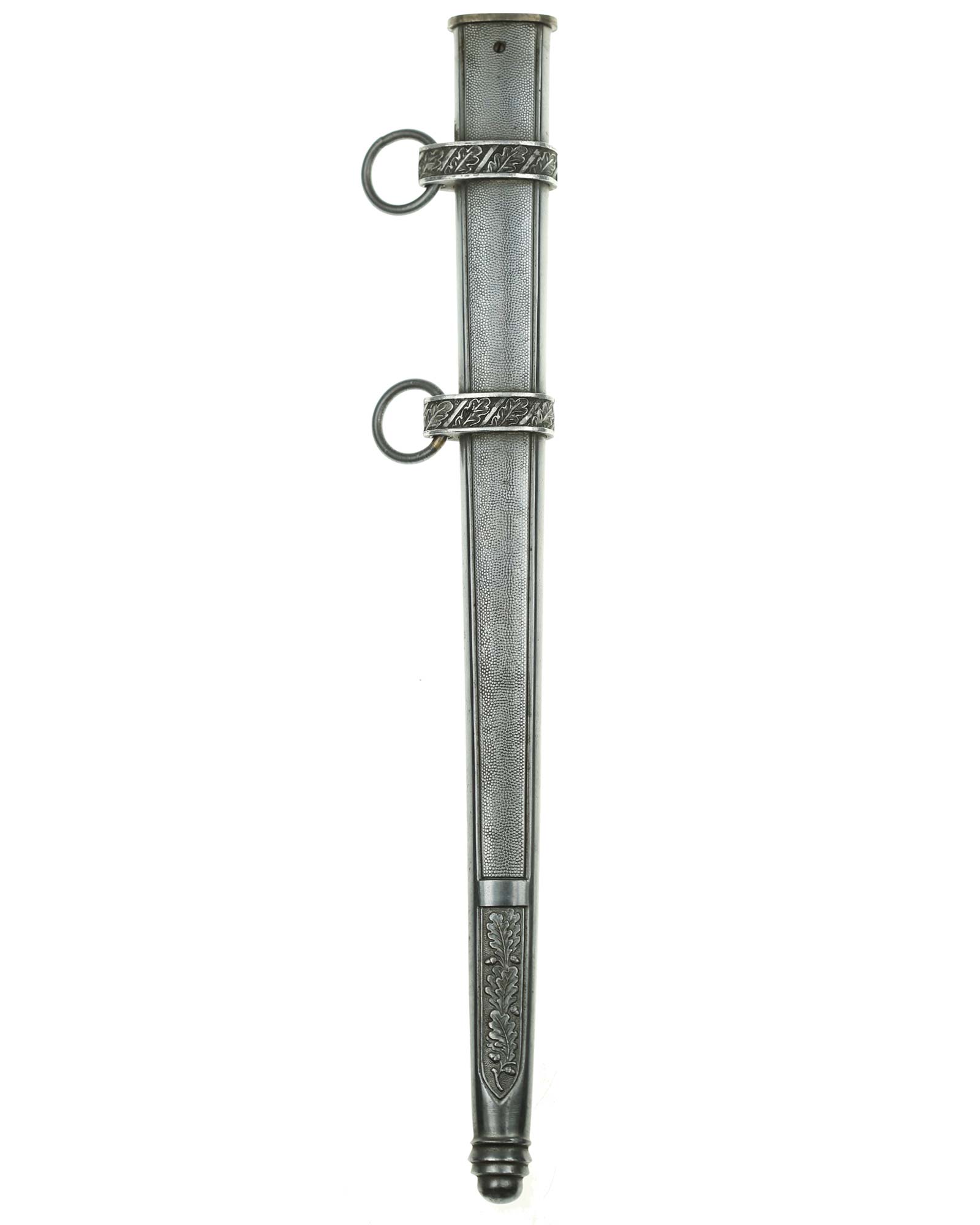 Scabbard: The scabbard is also a fine example. It has outstanding crisp pebbled panels and the bands are a fine aluminum having excellent detail to the oak leaves. The throat is slightly thick and is retained by one screw.