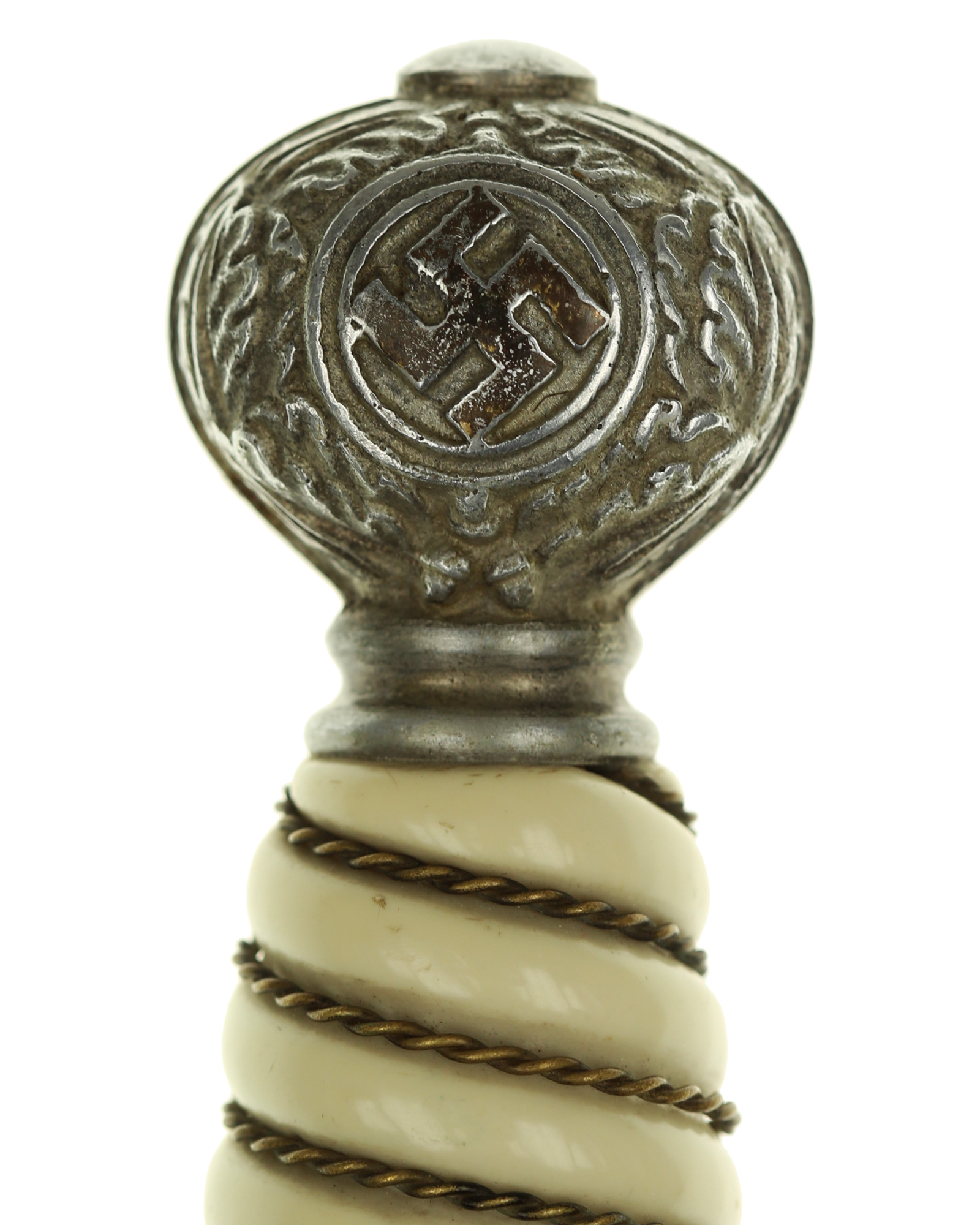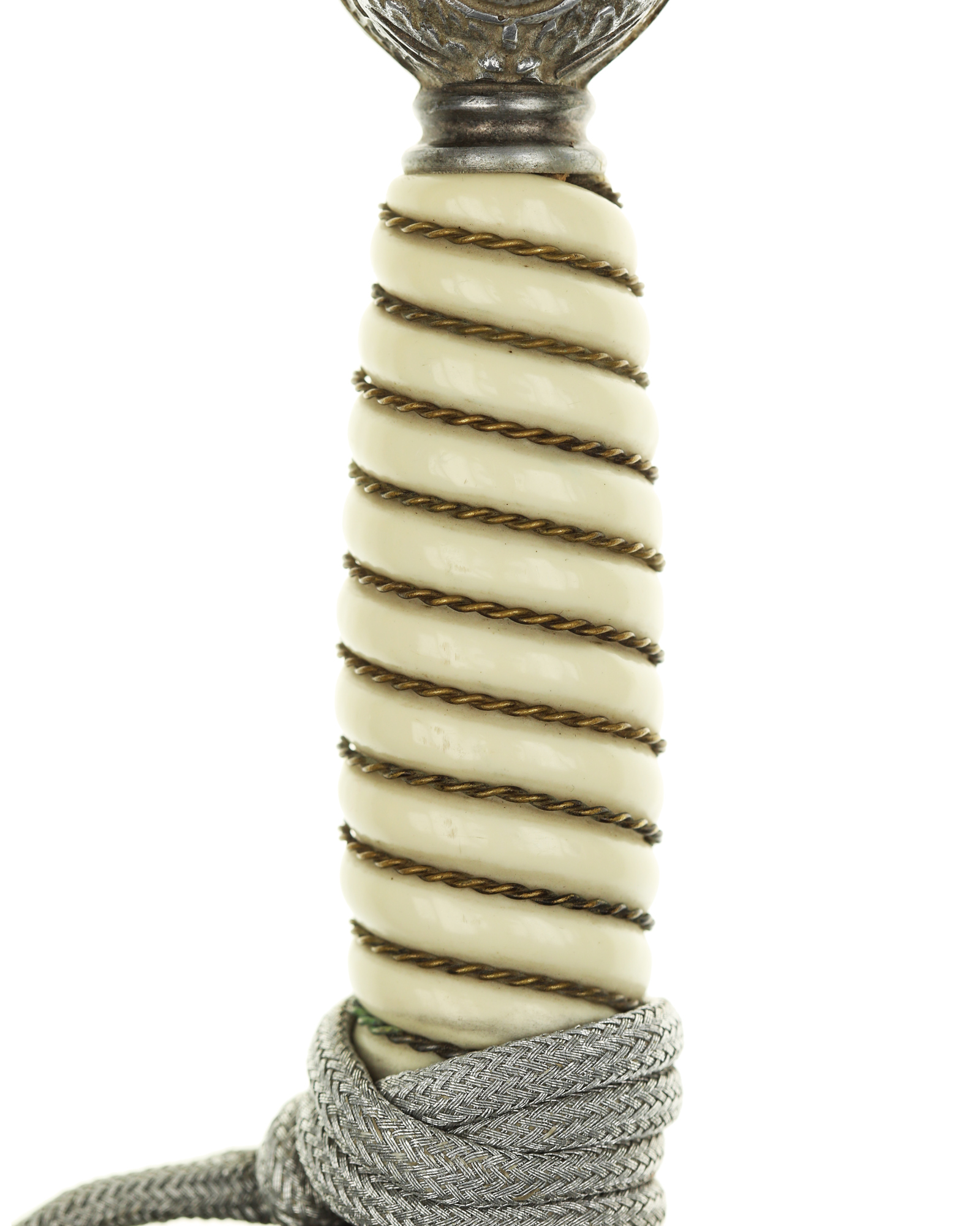Grip: The Grip of this dagger is a fine, off-white color. It is tightly wrapped with twisted silver wire. The pommel is the style with pebbled backgrounds to the oak leaves. These oak leaves are nicely detailed, and they surround the raised swastikas that appear on both sides of the pommel. The crossguard is also a great example. The generic variety has large pebbling on the reverse panel. The eagles on these guards are especially nice as the tops of the wings slightly overlap the depiction. This bird has complete detail to the head, breast and wing feathering, as well as the talons.