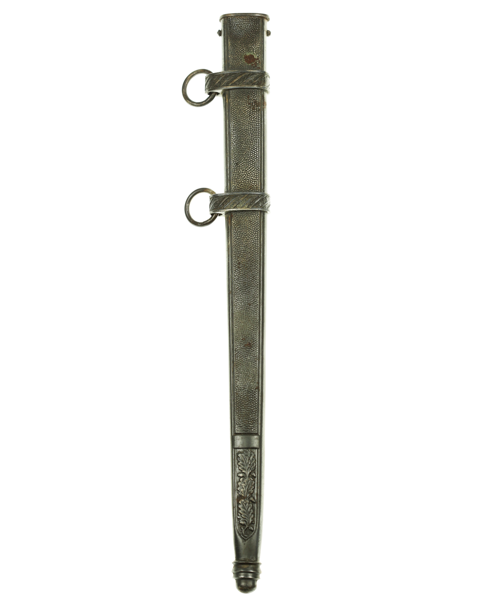 Scabbard: The scabbard is also a fine example. It has outstanding crisp pebbled panels and the bands are a fine aluminum having excellent detail to the oak leaves. The throat is slightly thick and is retained by two side screws.