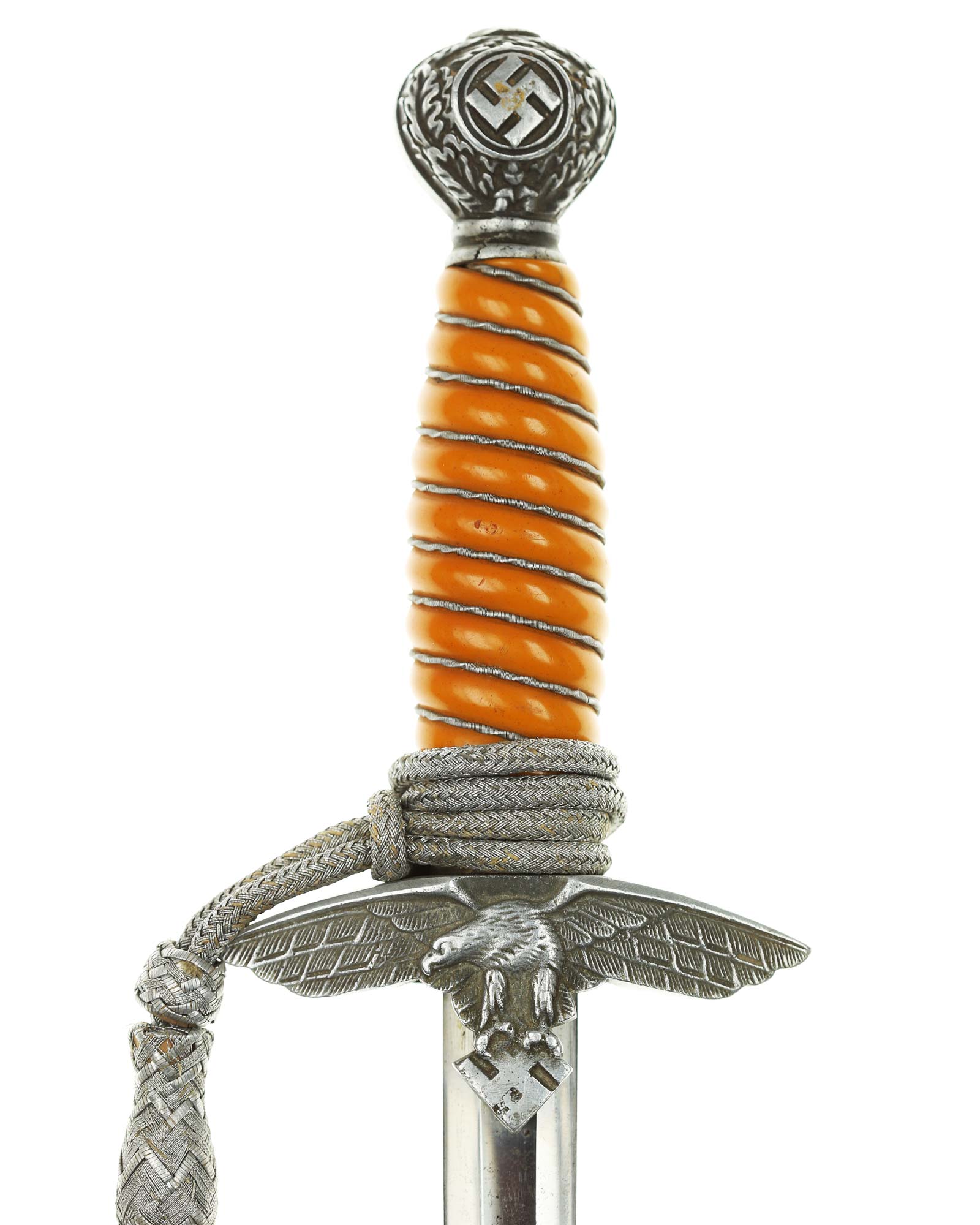 Grip: The grip of this dagger is a beauty, being a shade of dark orange and is tightly wrapped with wire. The pommel is a great example. The oak leaves which surround the swastikas are extremely well rendered and hand engraved right up to the smooth center ridge line.