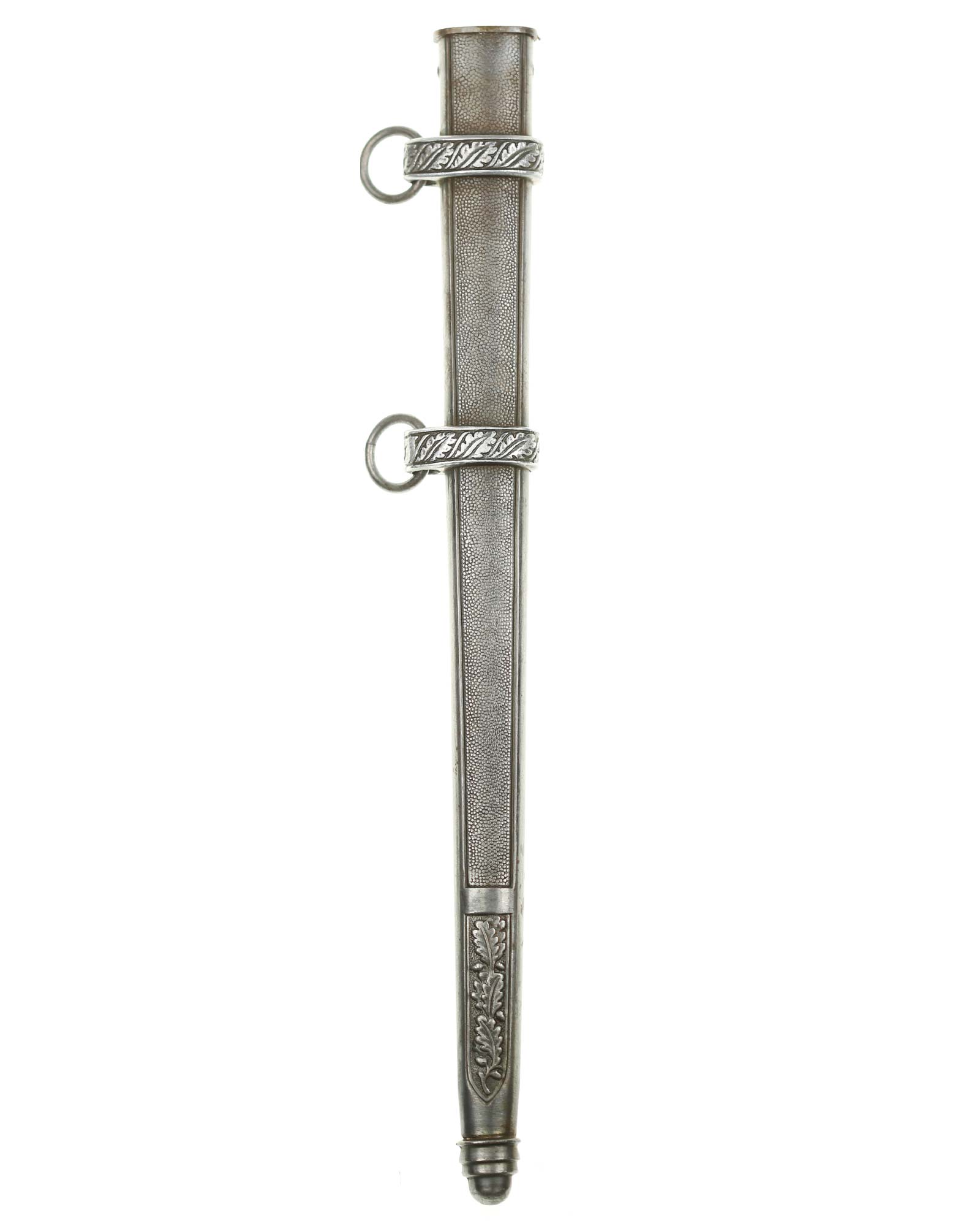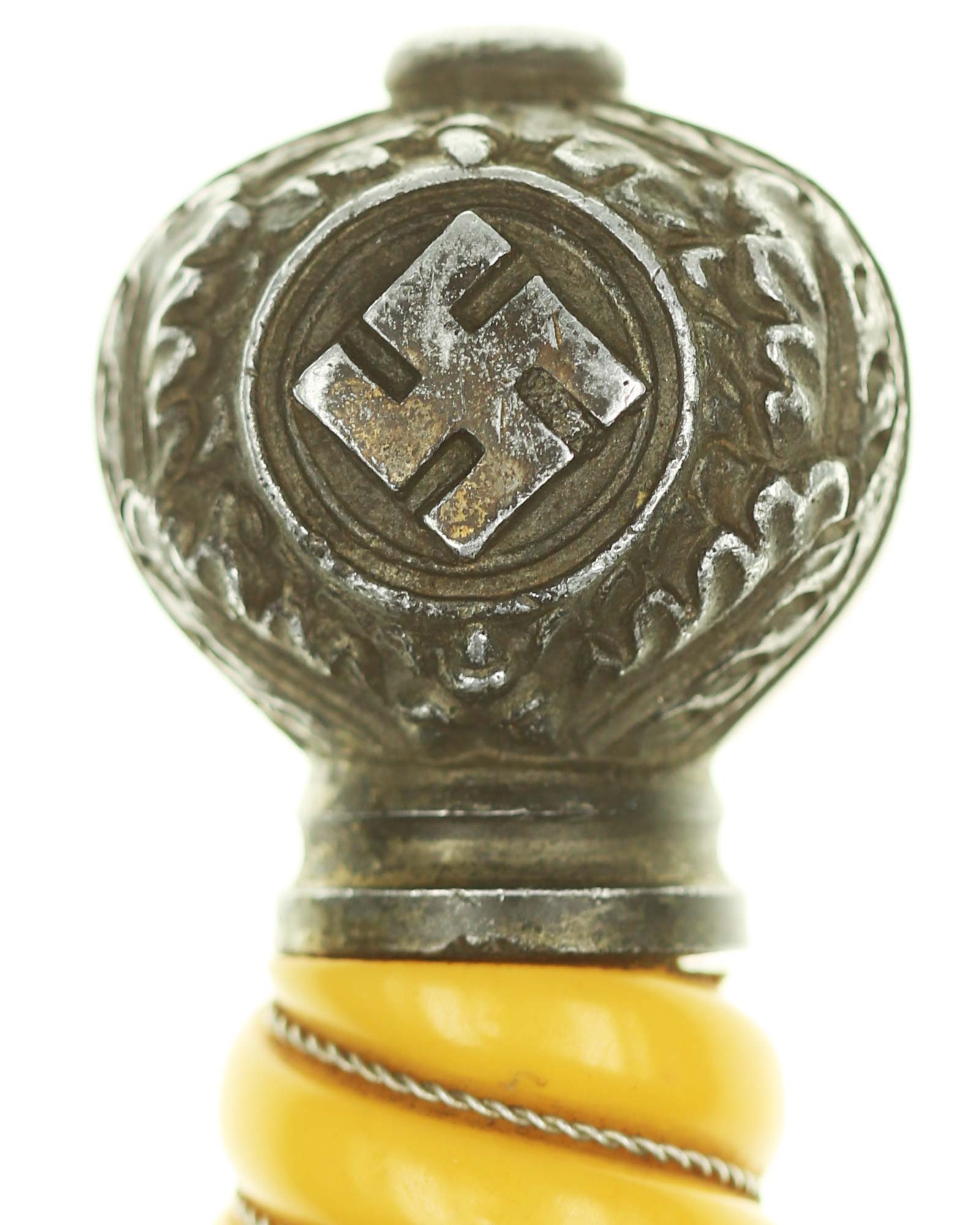 Grip: The grip of this dagger is a beauty, being a orange and is tightly wrapped with wire. The pommel is a great example. The oak leaves which surround the swastikas are extremely well rendered and hand engraved right up to the smooth center ridge line.