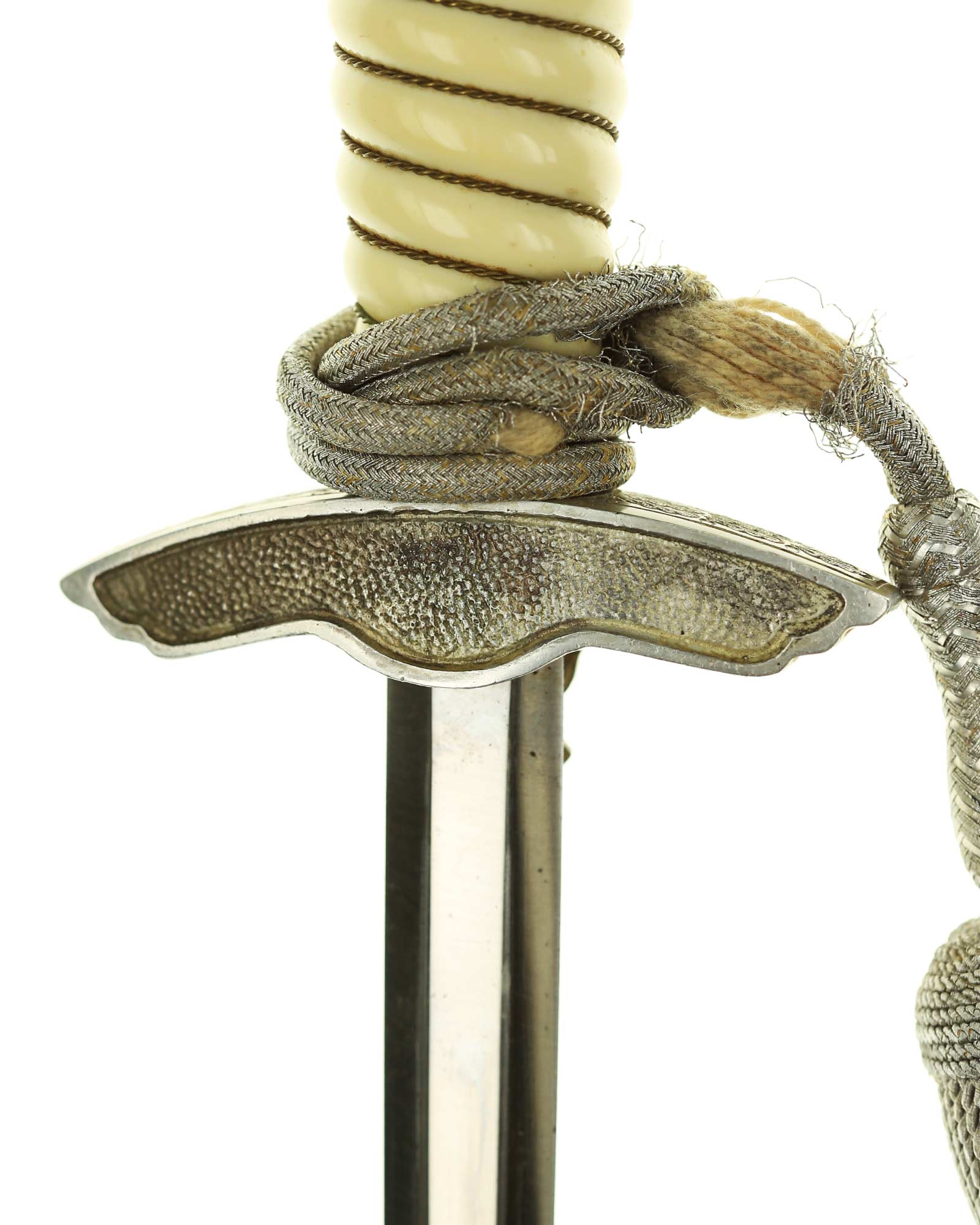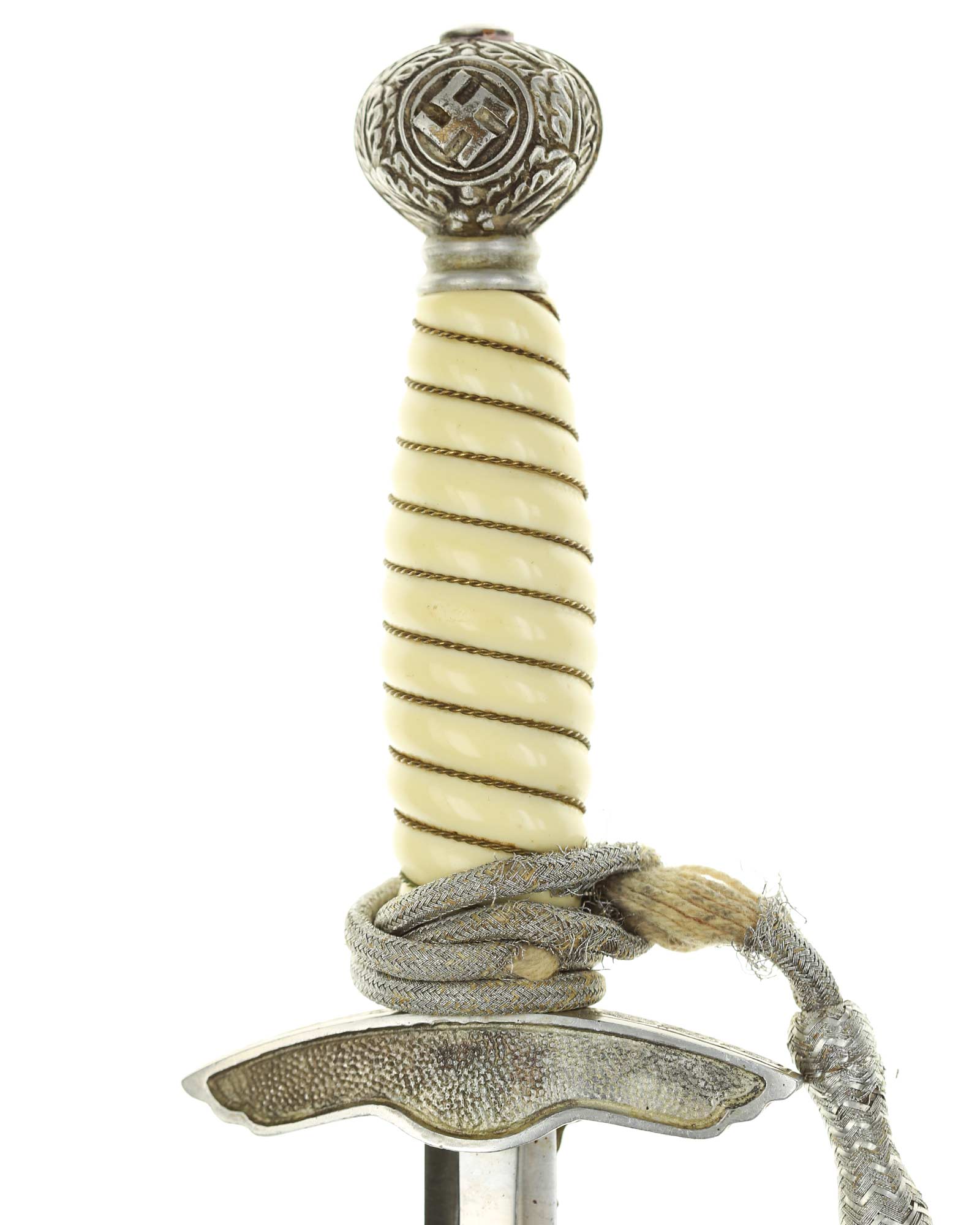 Grip: The Grip of this dagger is a fine, off-white color. It is wrapped with silver wire. The pommel is the style with pebbled backgrounds to the oak leaves. These oak leaves are nicely detailed, and they surround the raised swastikas that appear on both sides of the pommel. The crossguard is also a great example. The generic variety has large pebbling on the reverse panel. The eagles on these guards are especially nice as the tops of the wings slightly overlap the depiction. This bird has complete detail to the head, breast and wing feathering, as well as the talons.