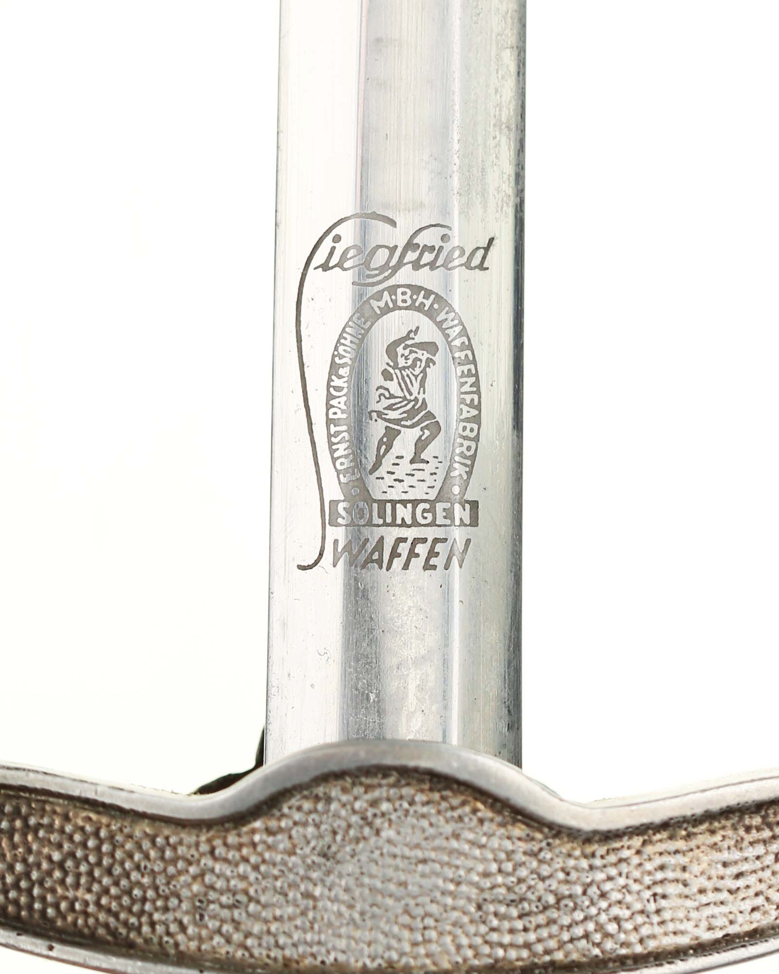 Blade: The blade is in EXC+ condition throughout. This blade is etched on the reverse with the Siegrfried trademark having the firm's initials and location beneath, “Ernst Pack & Söhne Solingen”. The leather washer is in place.