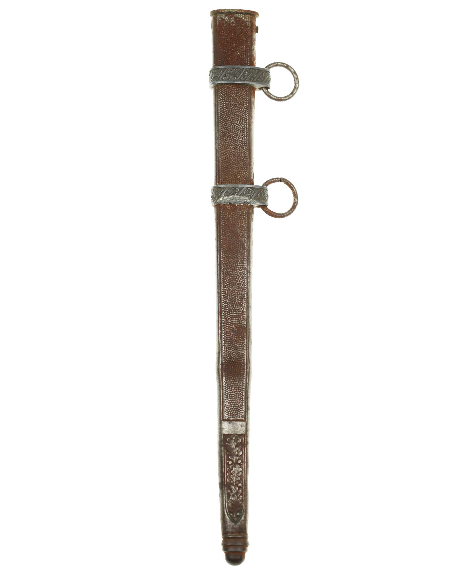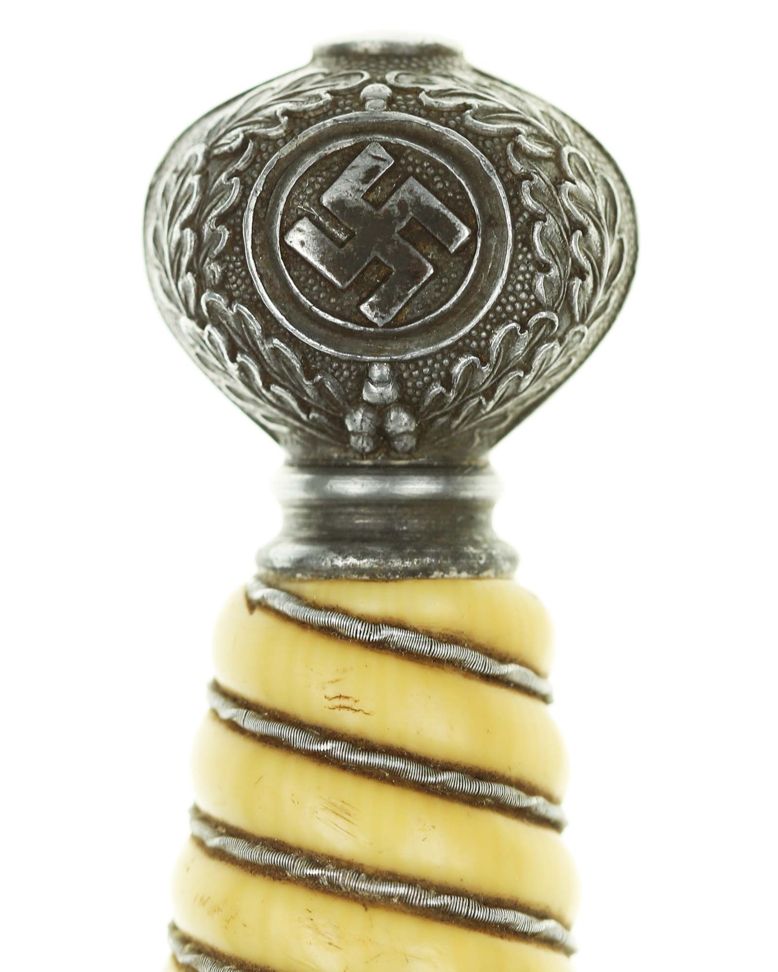 Grip: The Grip of this dagger is a fine, yellow-white color. It is tightly wrapped with twisted silver wire. The pommel is the style with pebbled backgrounds to the oak leaves. These oak leaves are nicely detailed, and they surround the raised swastikas that appear on both sides of the pommel. The crossguard is also a great example. The generic variety has large pebbling on the reverse panel. The eagles on these guards are especially nice as the tops of the wings slightly overlap the depiction. This bird has complete detail to the head, breast and wing feathering, as well as the talons. The upper surface of the quillons are decorated with a pattern of oak leaves and acorns cast into the surfaces.