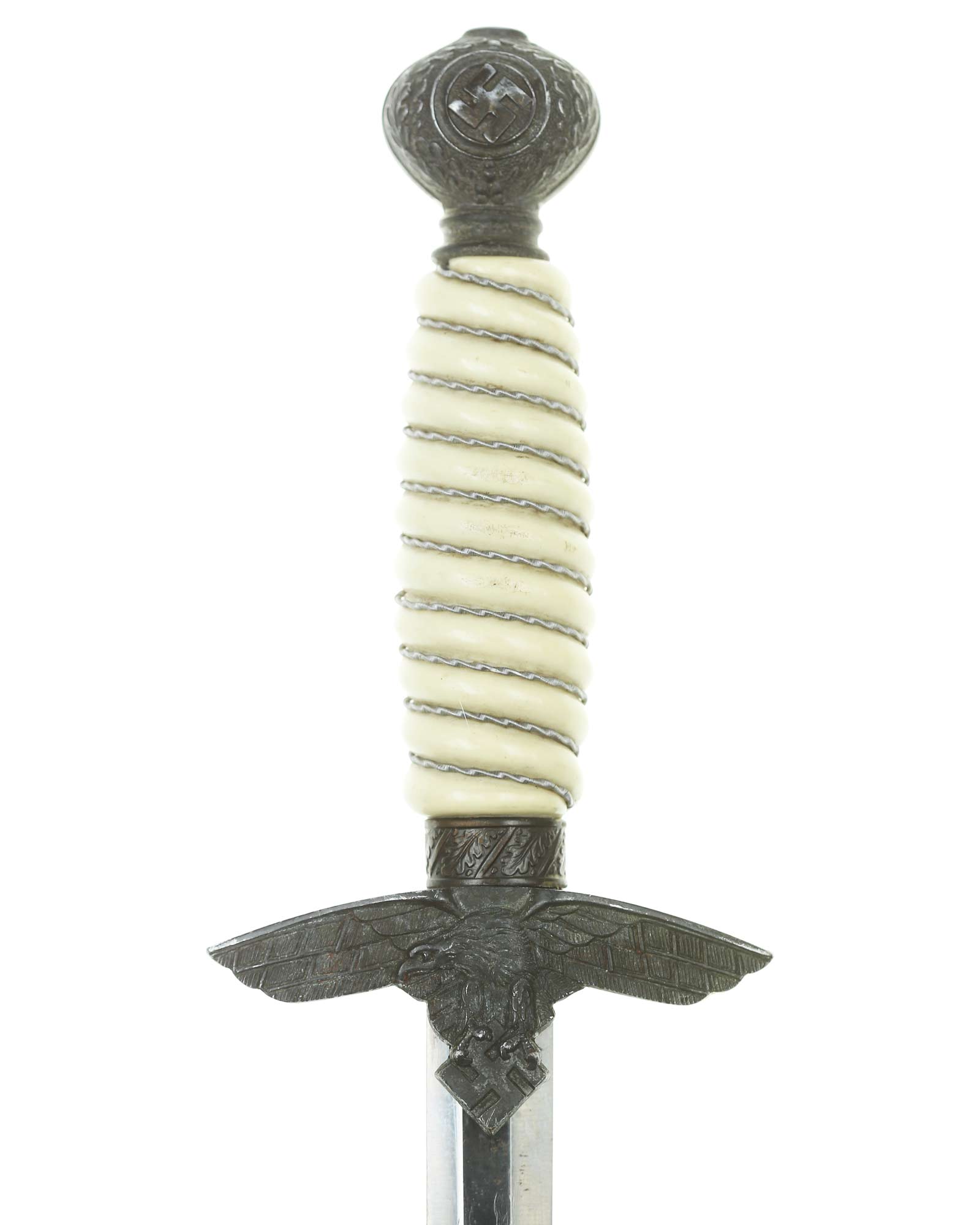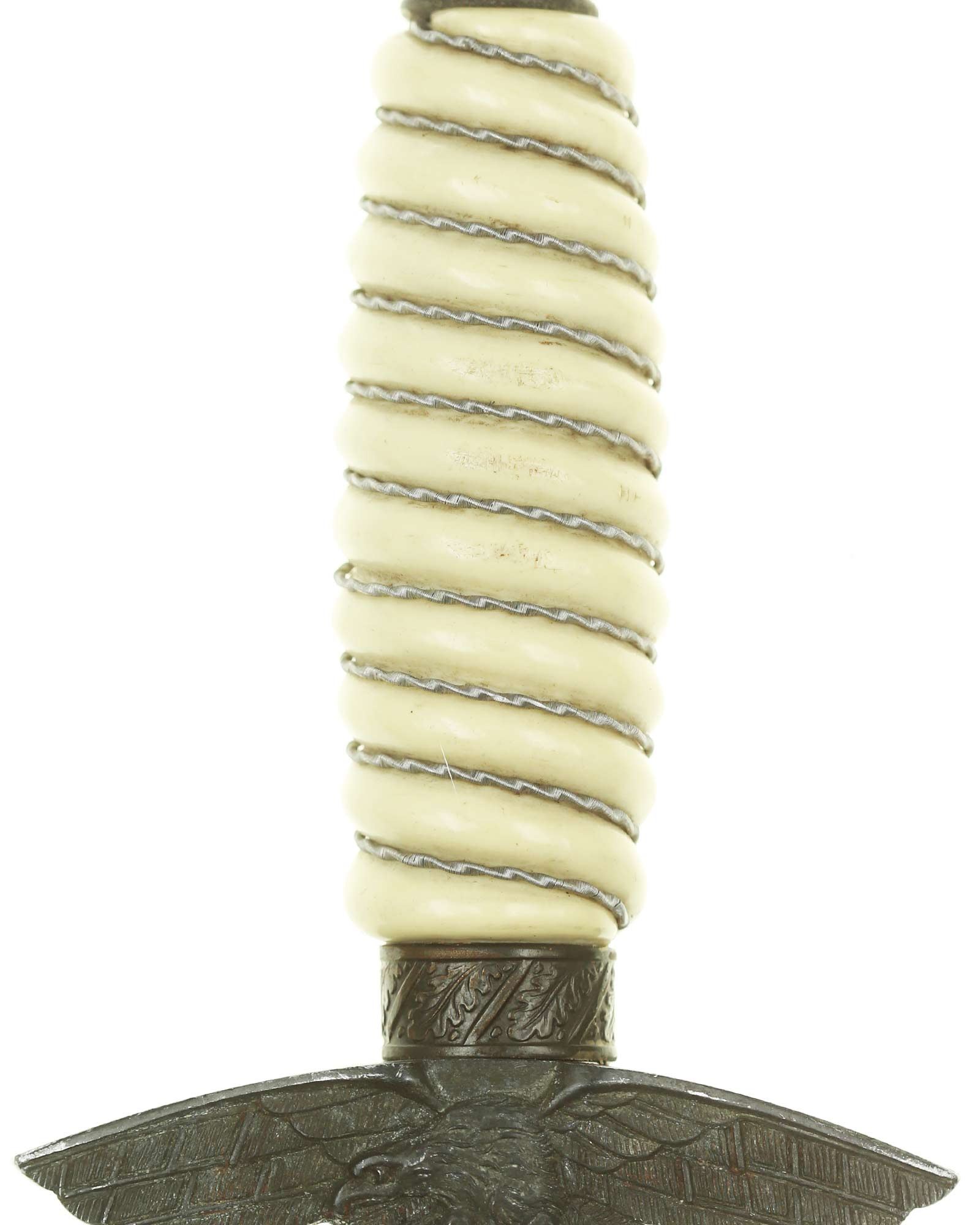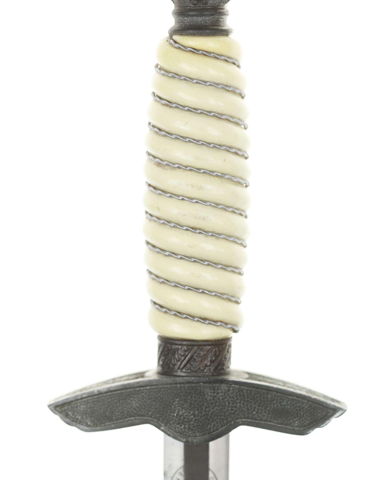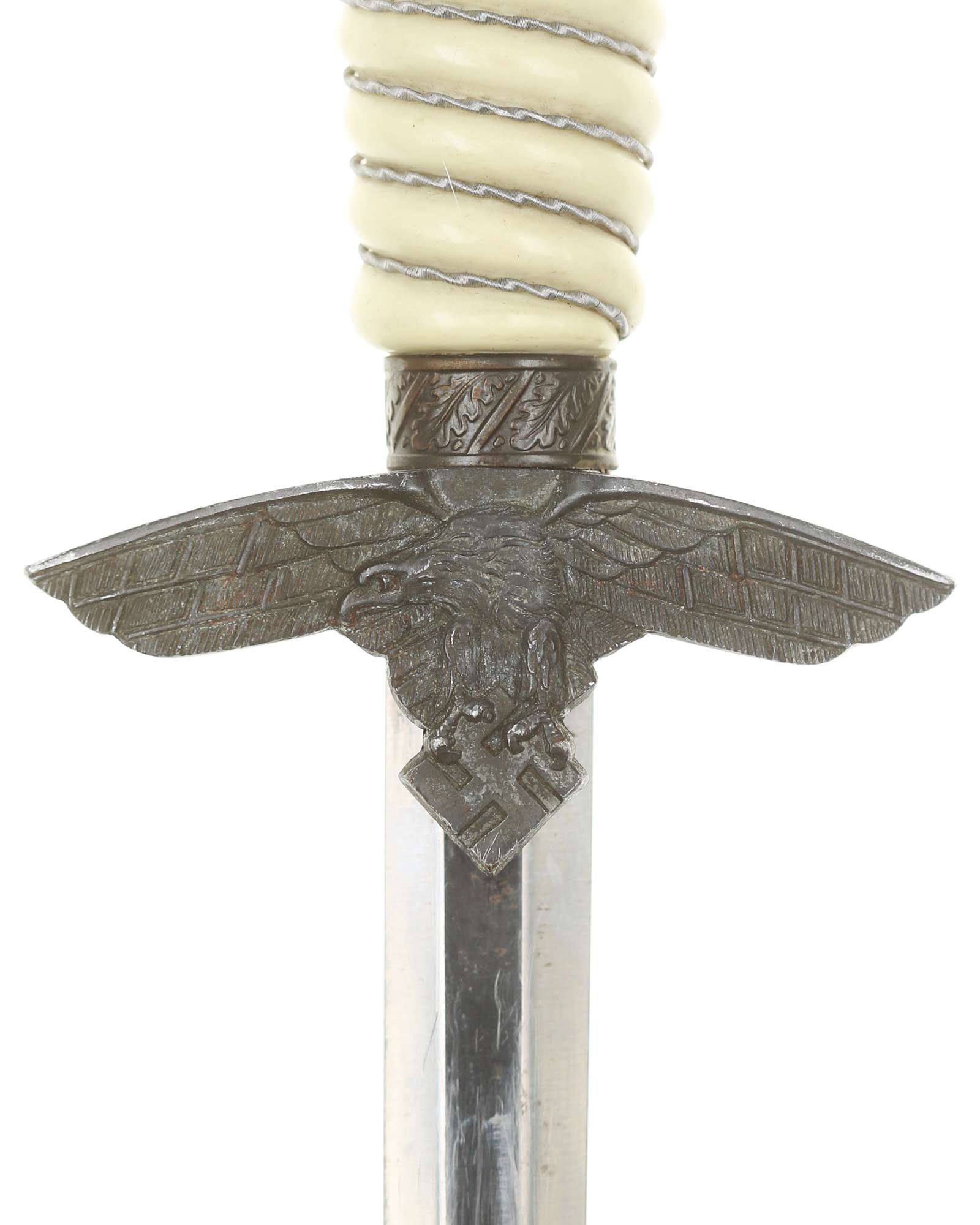 Grip: The Grip of this dagger is a fine, white color. It is tightly wrapped with twisted silver wire. The pommel is the style with pebbled backgrounds to the oak leaves. These oak leaves are nicely detailed, and they surround the raised swastikas that appear on both sides of the pommel. The crossguard is also a great example. The generic variety has large pebbling on the reverse panel. The eagles on these guards are especially nice as the tops of the wings slightly overlap the depiction. This bird has complete detail to the head, breast and wing feathering, as well as the talons. The upper surface of the quillons are decorated with a pattern of oak leaves and acorns cast into the surfaces.