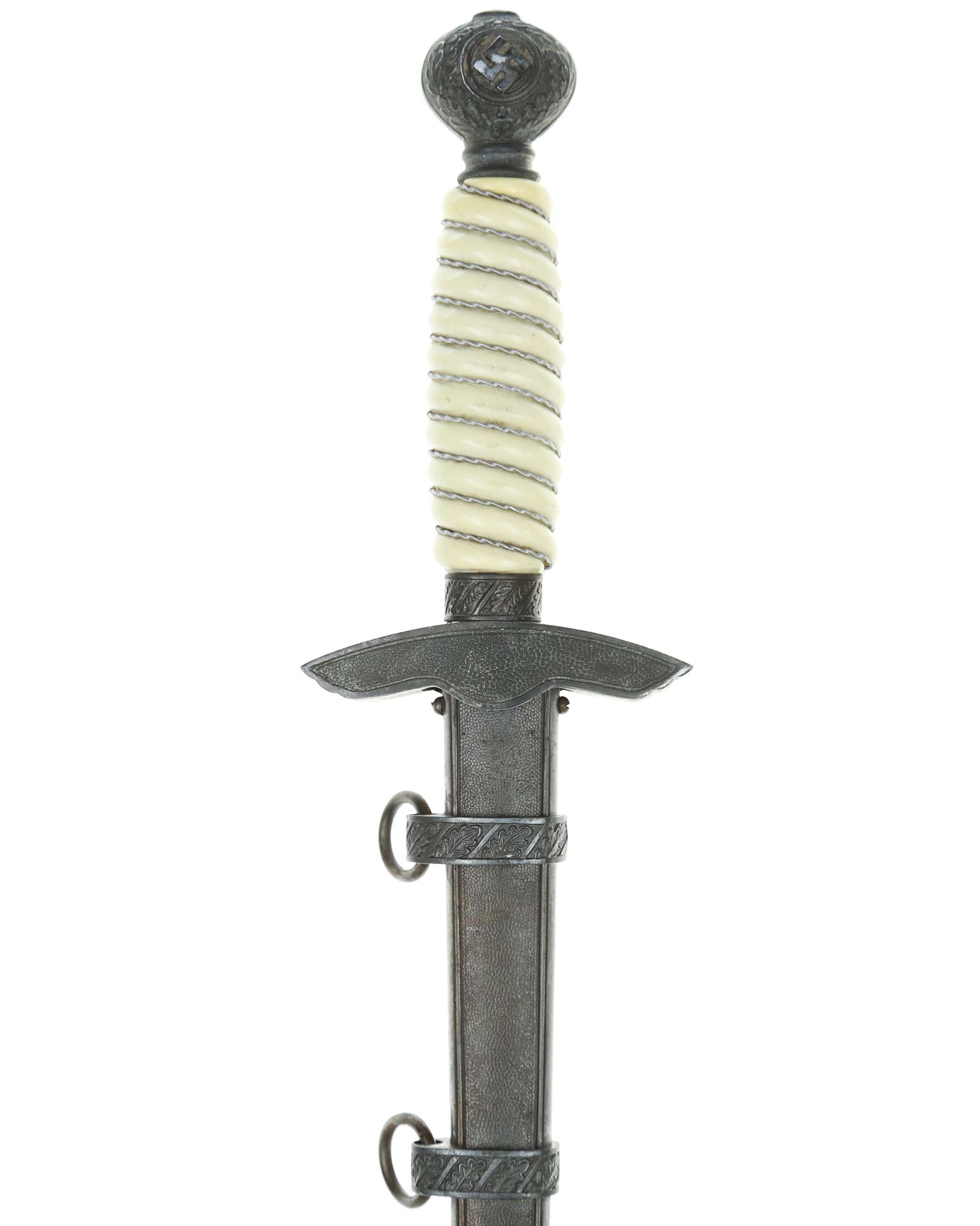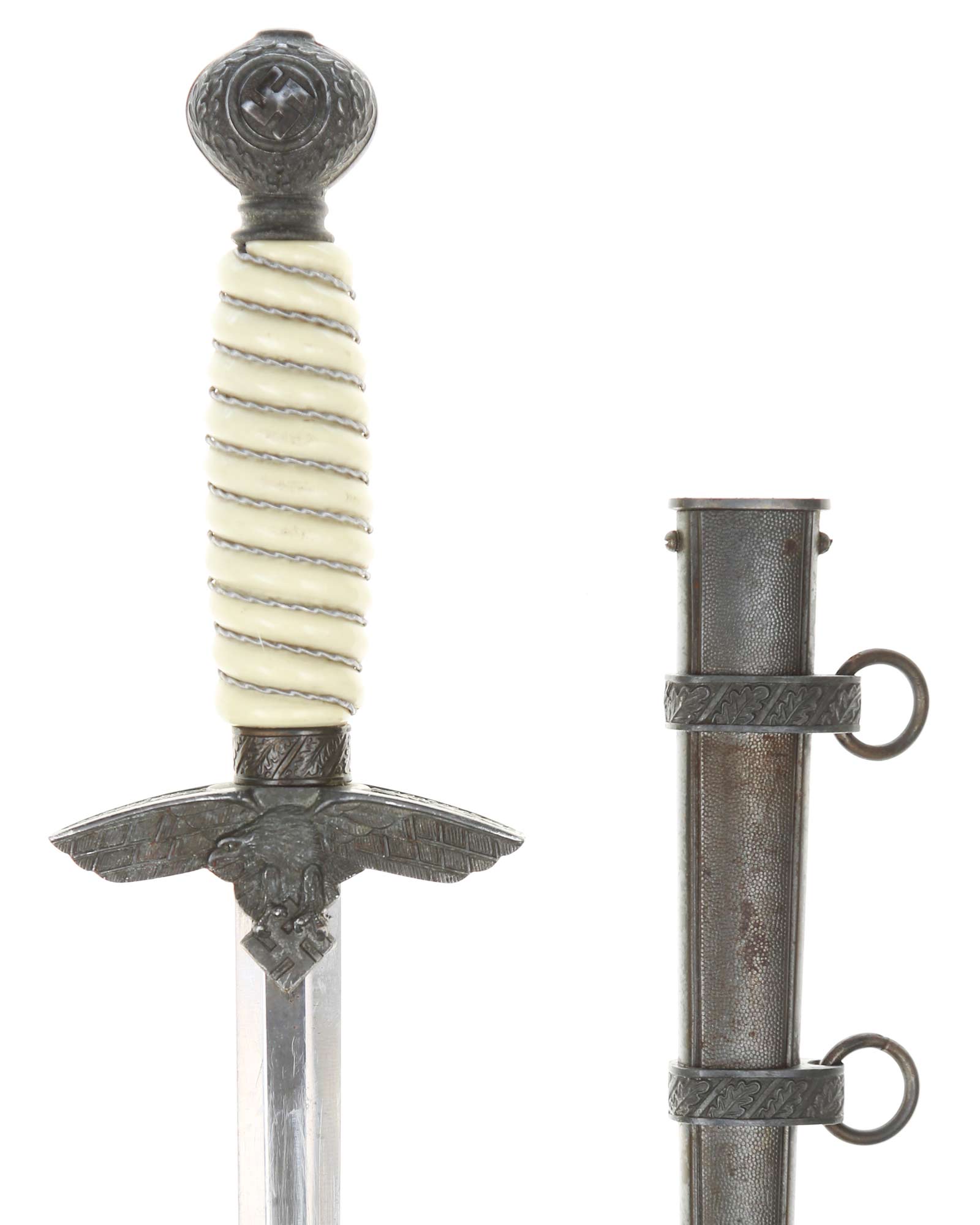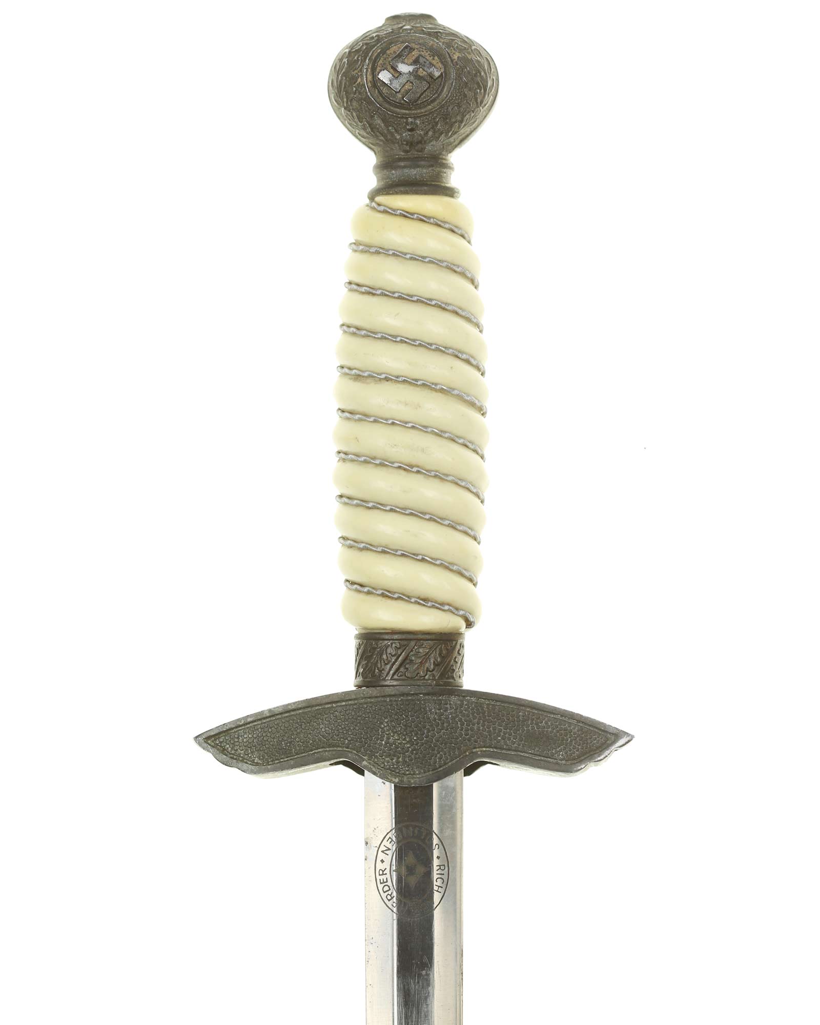 Grip: The Grip of this dagger is a fine, white color. It is tightly wrapped with twisted silver wire. The pommel is the style with pebbled backgrounds to the oak leaves. These oak leaves are nicely detailed, and they surround the raised swastikas that appear on both sides of the pommel. The crossguard is also a great example. The generic variety has large pebbling on the reverse panel. The eagles on these guards are especially nice as the tops of the wings slightly overlap the depiction. This bird has complete detail to the head, breast and wing feathering, as well as the talons. The upper surface of the quillons are decorated with a pattern of oak leaves and acorns cast into the surfaces.