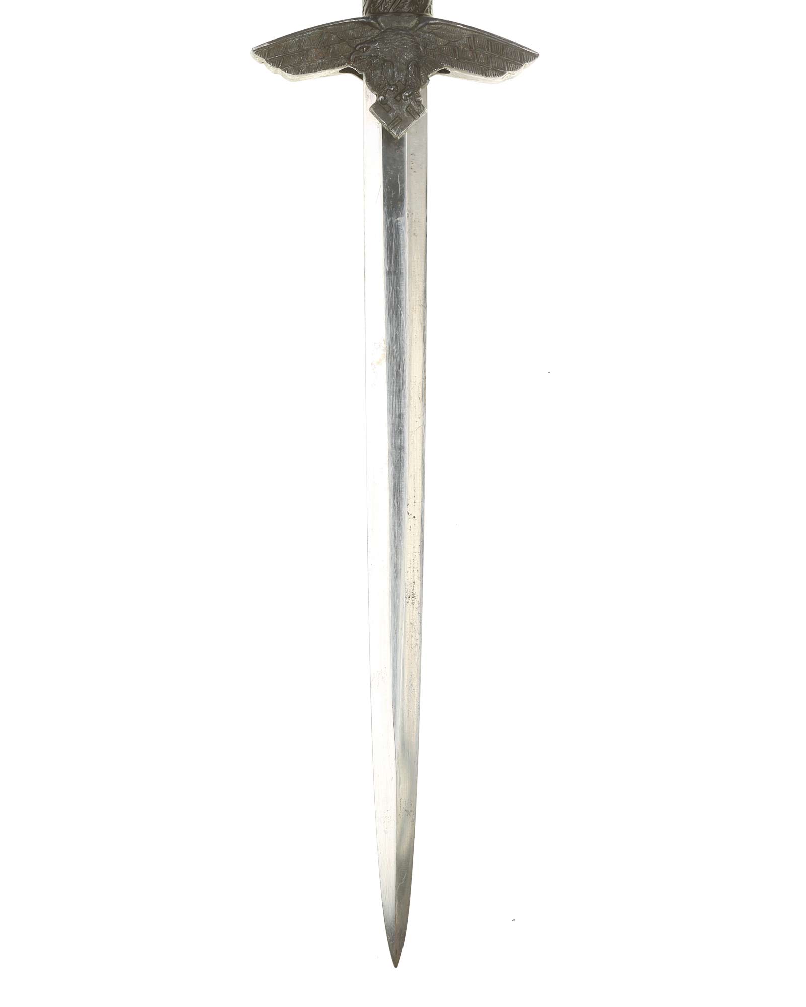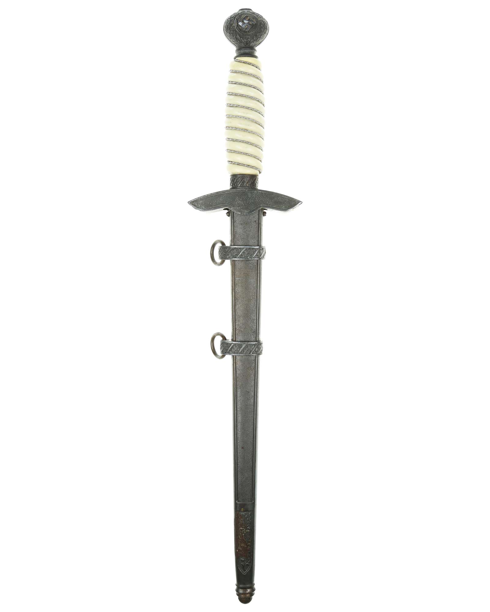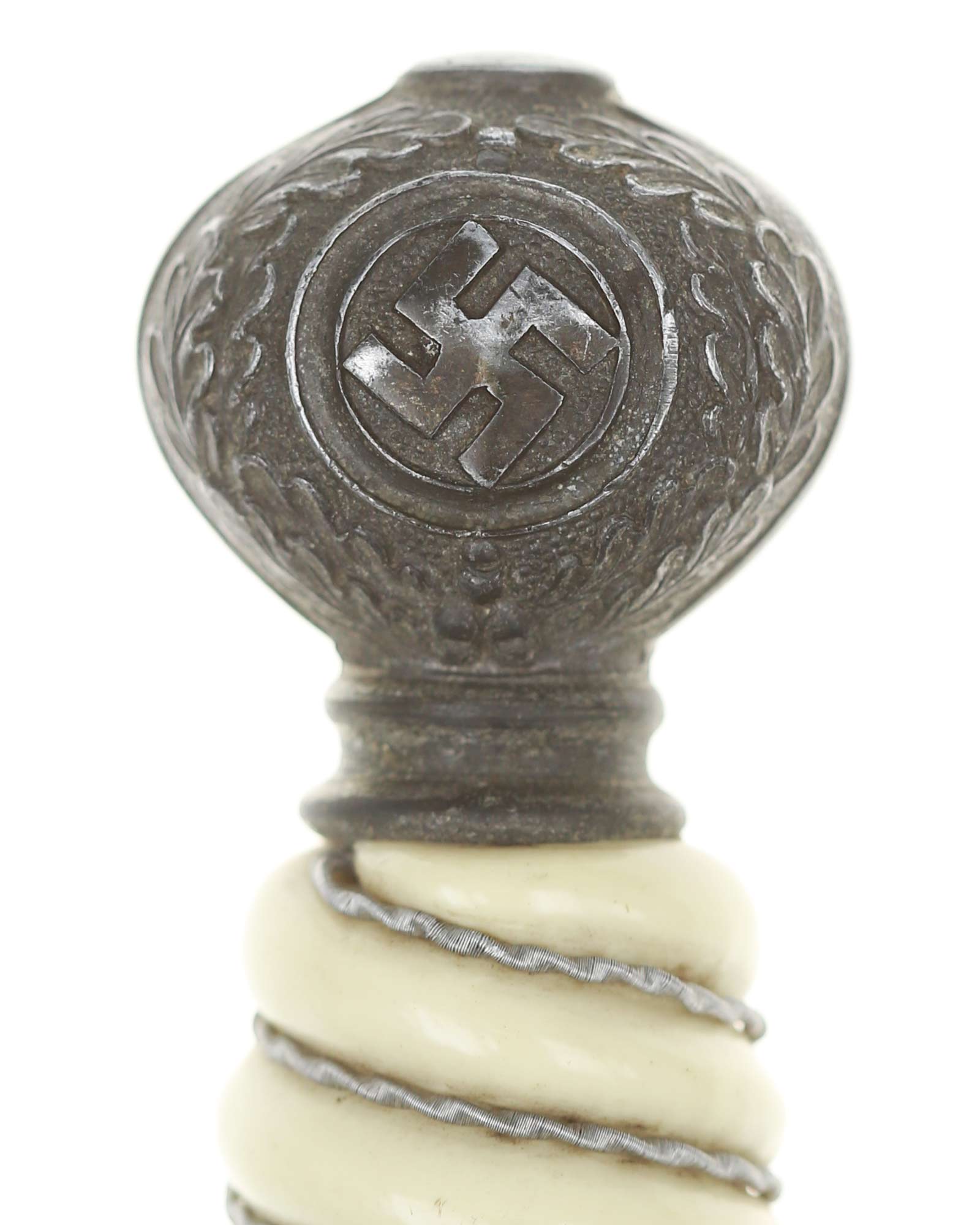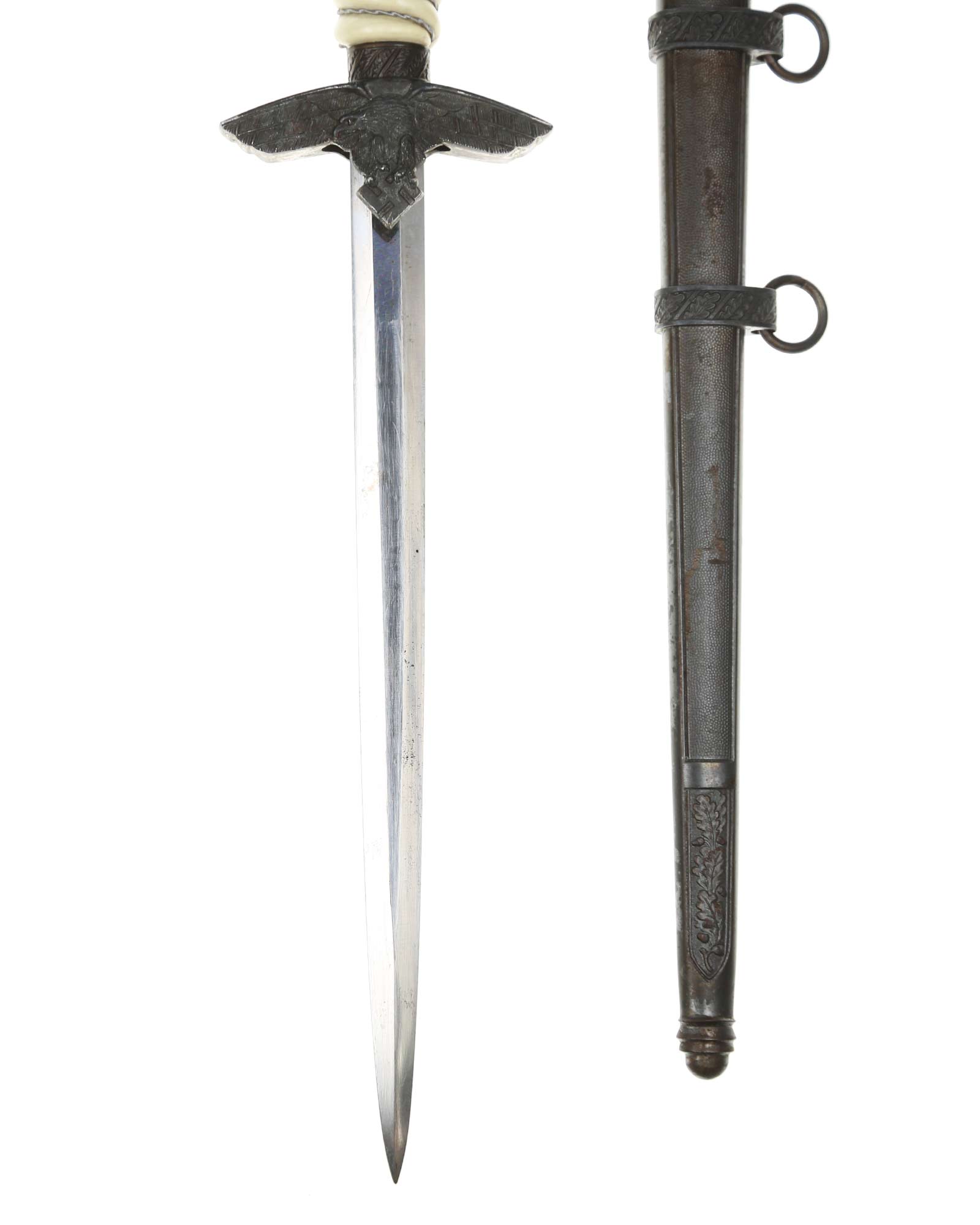 Grip: The Grip of this dagger is a fine, white color. It is tightly wrapped with twisted silver wire. The pommel is the style with pebbled backgrounds to the oak leaves. These oak leaves are nicely detailed, and they surround the raised swastikas that appear on both sides of the pommel. The crossguard is also a great example. The generic variety has large pebbling on the reverse panel. The eagles on these guards are especially nice as the tops of the wings slightly overlap the depiction. This bird has complete detail to the head, breast and wing feathering, as well as the talons. The upper surface of the quillons are decorated with a pattern of oak leaves and acorns cast into the surfaces.