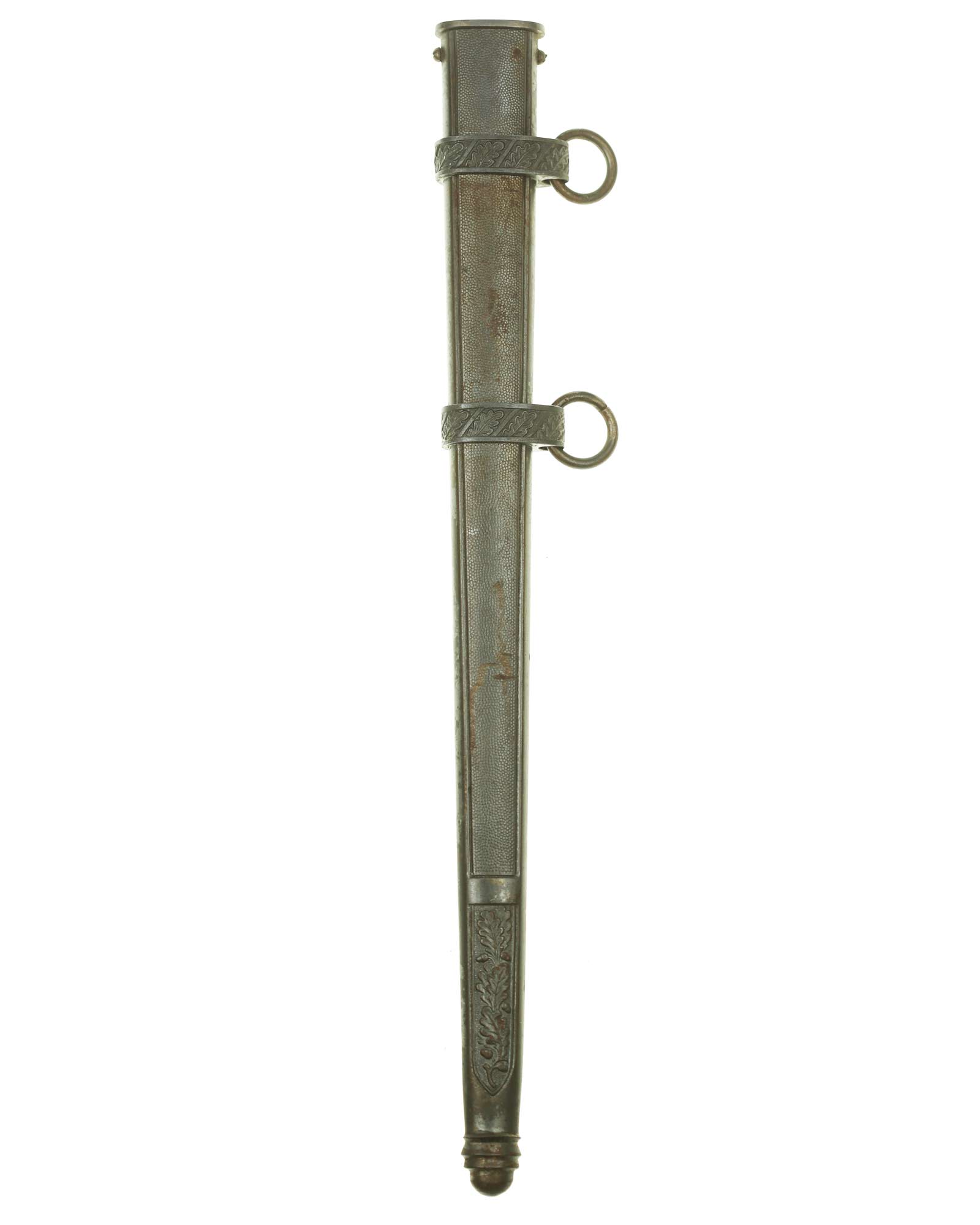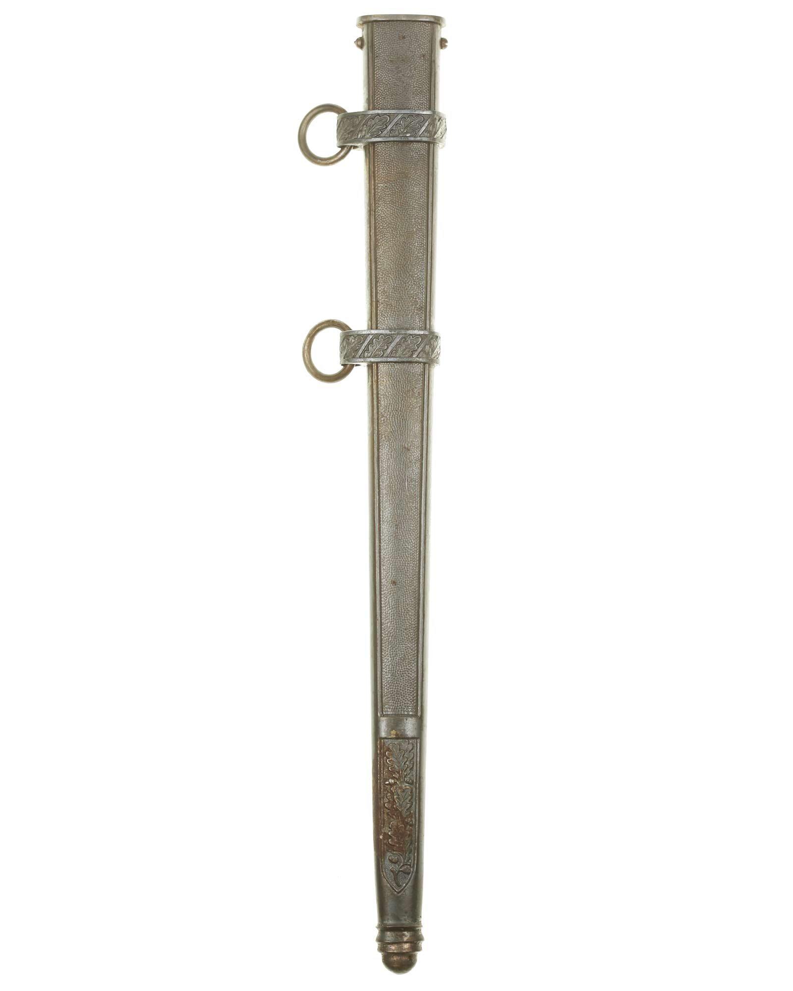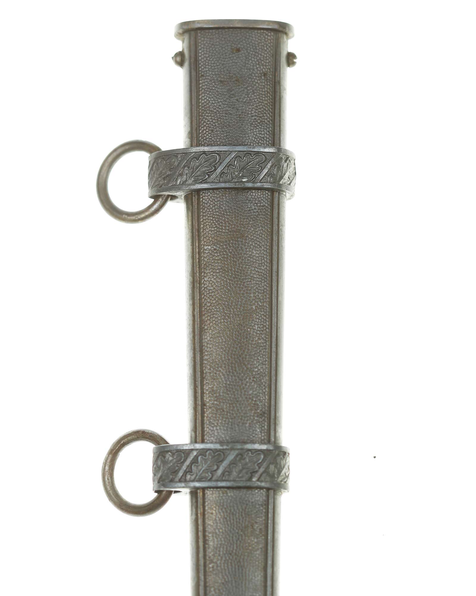 Scabbard: The scabbard is also a fine example. It is coated with an airplane gray finish. It has outstanding crisp pebbled panels and the bands are a fine aluminum having excellent detail to the oak leaves. The throat is slightly thick and is retained by two side screws.