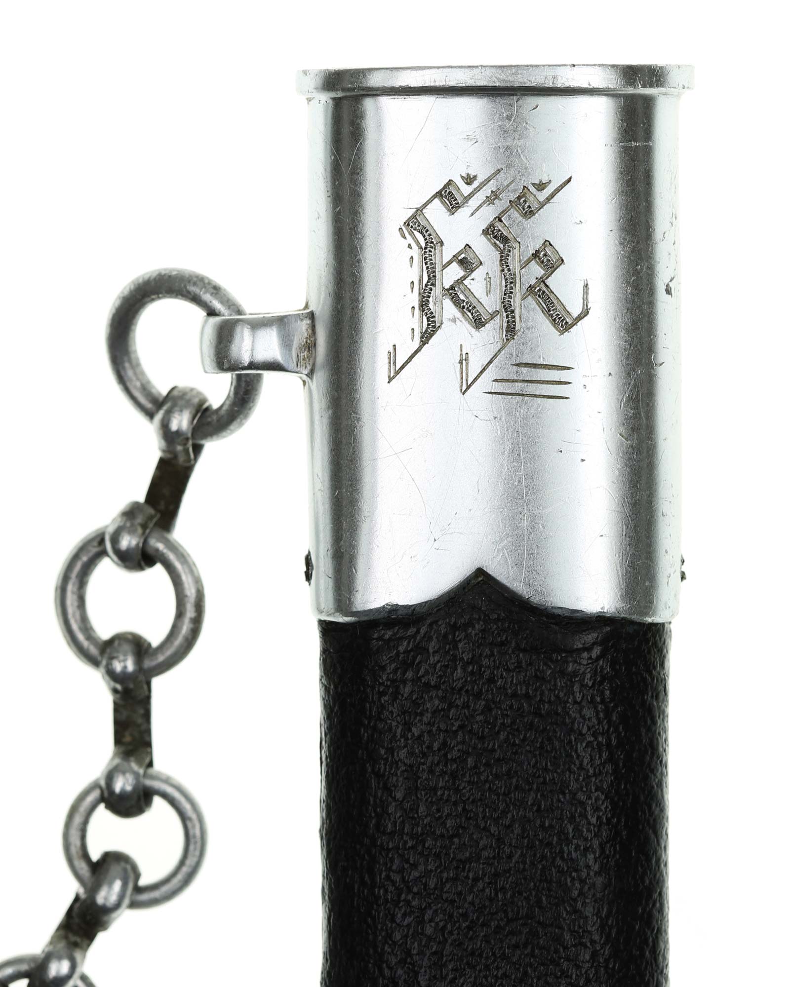 Scabbard: The scabbard shell is as straight. The satin aluminum scabbard mounts are also perfect. They show no signs of wear and have beautiful finish, being retained by headless side screws which are in-placed. The matching aluminum chain is also a real beauty. It is equipped with 6 upper and 6 lower ringlets, the rig being attached to a fine aluminum snap clip. This snap clip retains the original lacquer over the finish and is marked “OLC” and “GES GESCH” on the reverse.