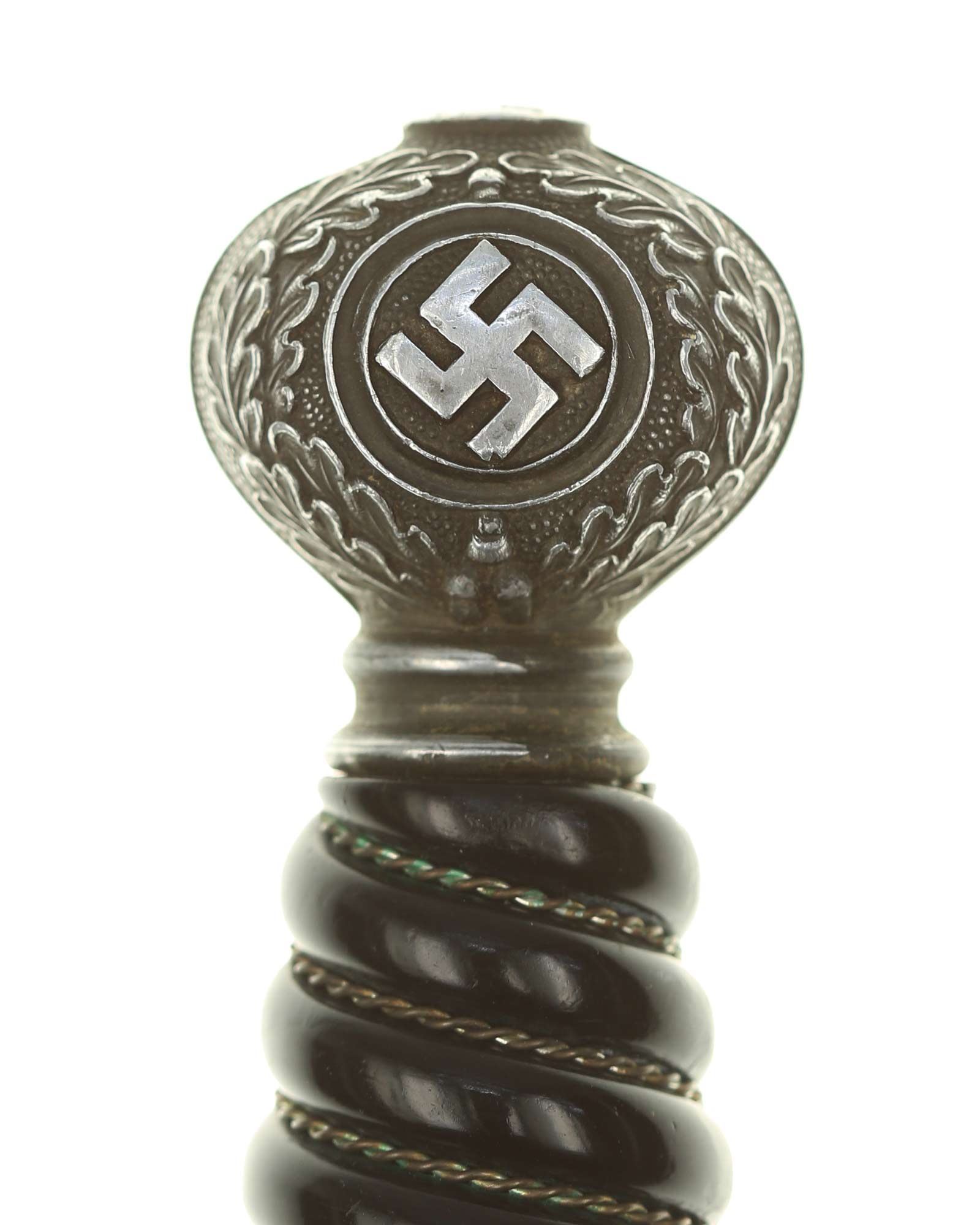 Grip: The grip of this dagger is a beauty. The pommel and crossguard are in exceptional condition. The pommel has good pebble patterns behind the oak leaves, which nicely set off the mobile swastikas on each side of this mount. This black celluloid grip is in absolute perfect condition, and is wrapped with twisted aluminum wire. .