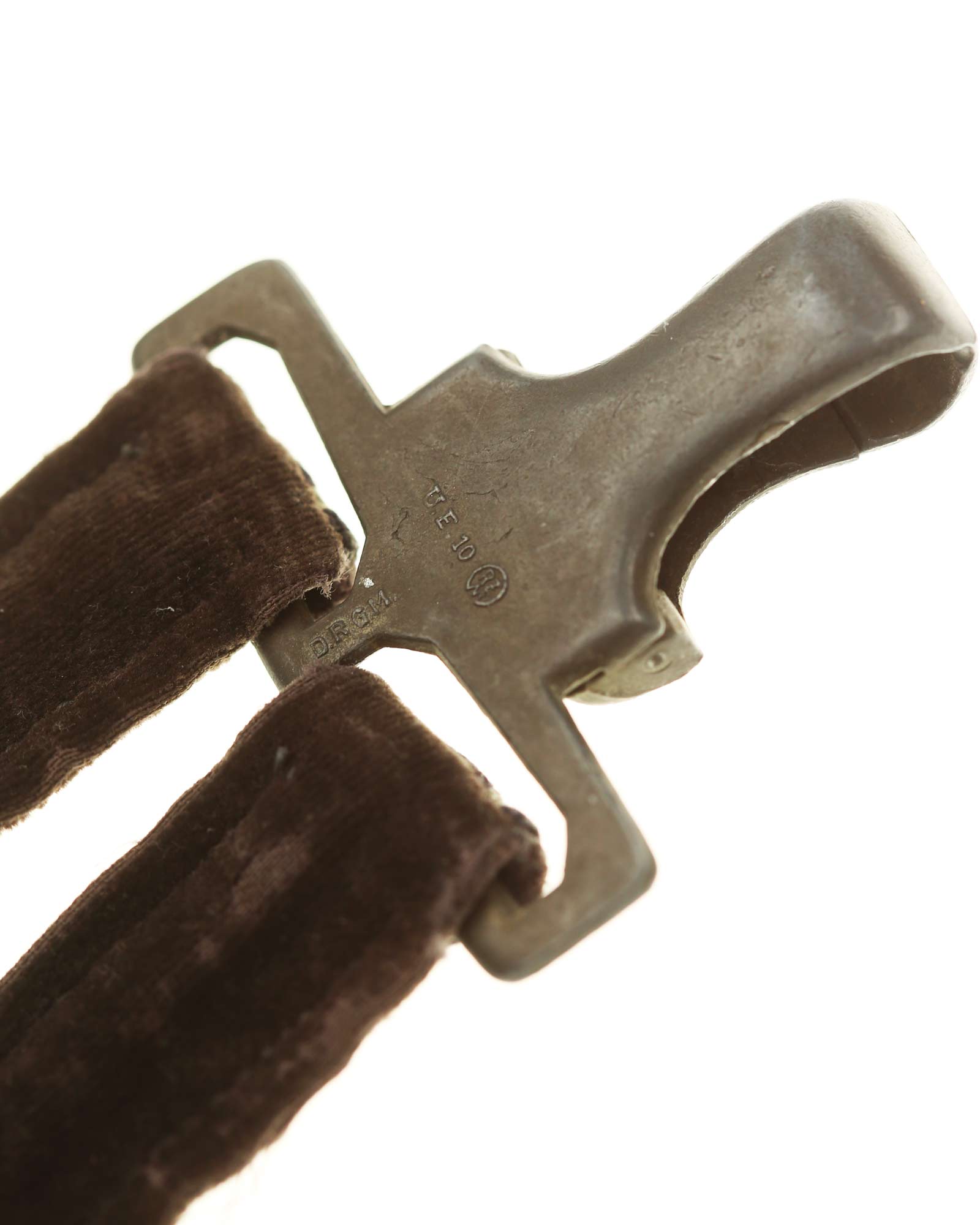 Blade: The blade is a fine example, showing a few runner marks, and modest of aging. Overall, this blade easily grades in extremely fine condition retaining its sharp tip. The reverse ricasso is stamped with the kissing cranes trademark, beneath which appears the maker name and location "ROBERT KLAAS SOLINGEN". The original brown pebbled blade buffer is in place.