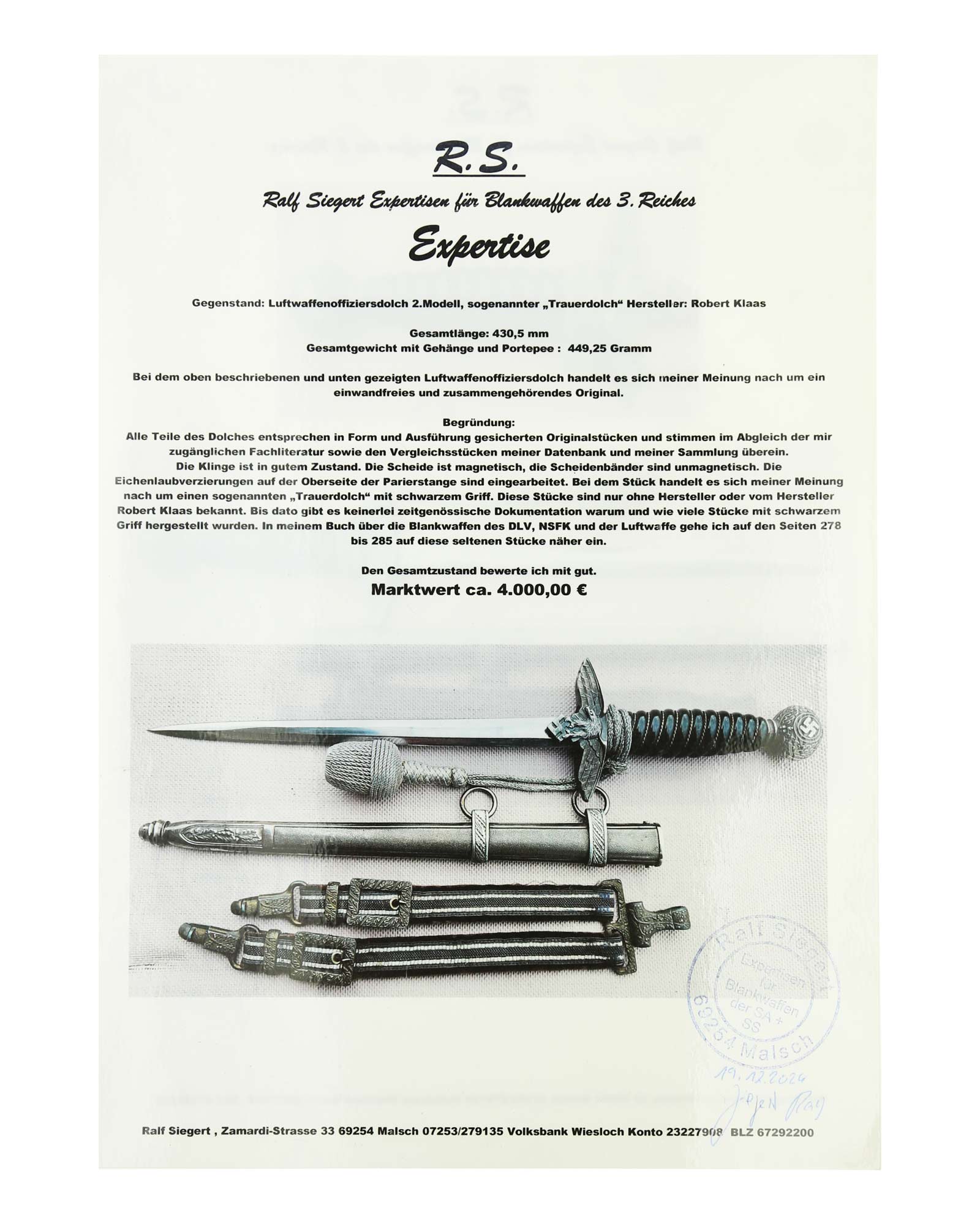 This 2nd Model Luftwaffe Funeral Dagger, produced by Robert Klaas and is in Near Mint condition overall. Model 1937. The total length is 43.1 cm. The Dagger has the maker mark on the blade: Robert Klaas Solingen. This Klaas produced 2nd Model Luftwaffe Dagger is complete with the black grip that we see very rarely on Klaas made Army and Luftwaffe daggers.