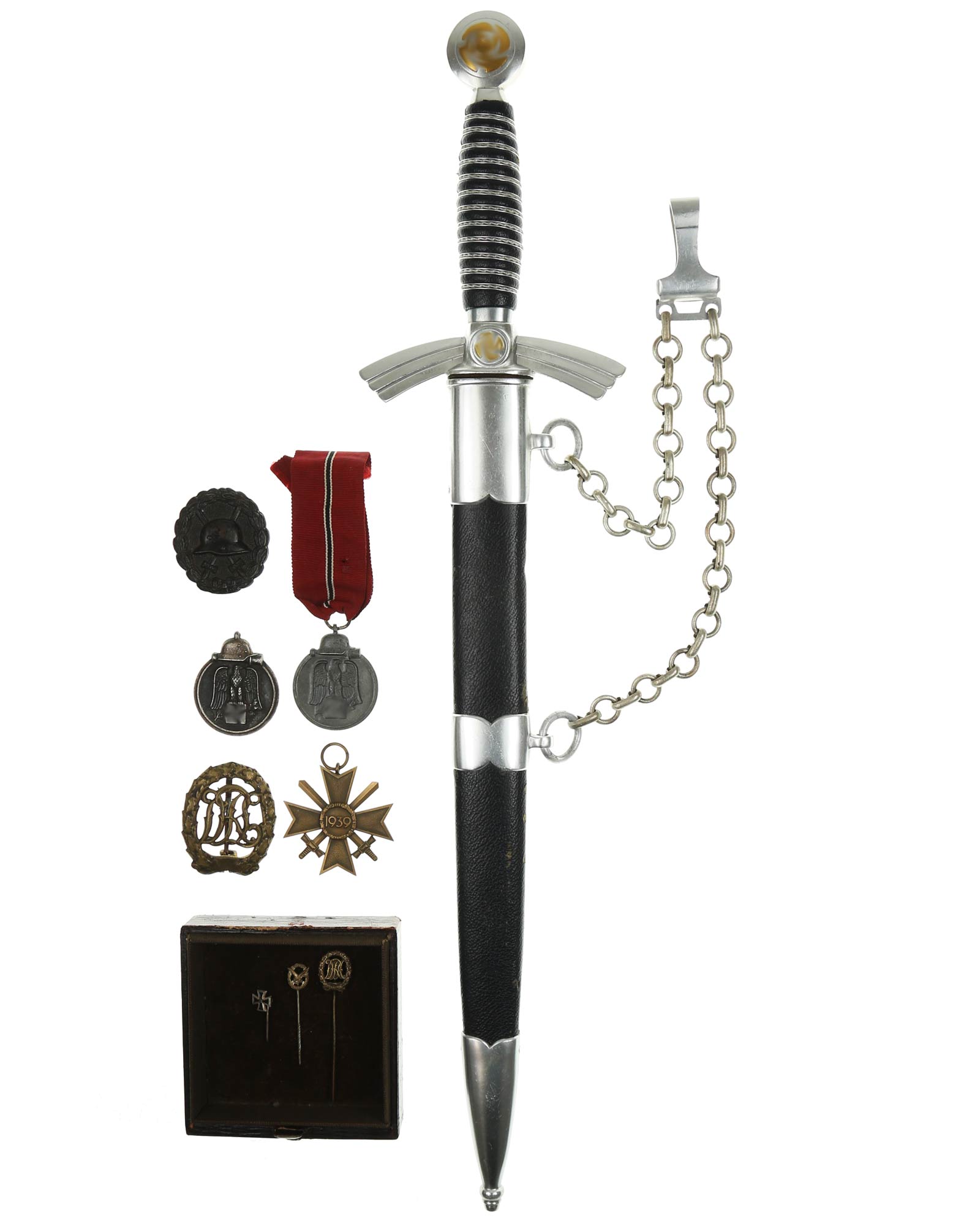 This Eickhorn 1st Model Aluminum Luftwaffe Dagger is in NEAR MINT condition throughout. Dagger is includet with 5x Badges, 3x Pins. Model 1935. The total length is 49.5 cm. The Dagger has the maker mark on the blade: Eickhorn Solingen.