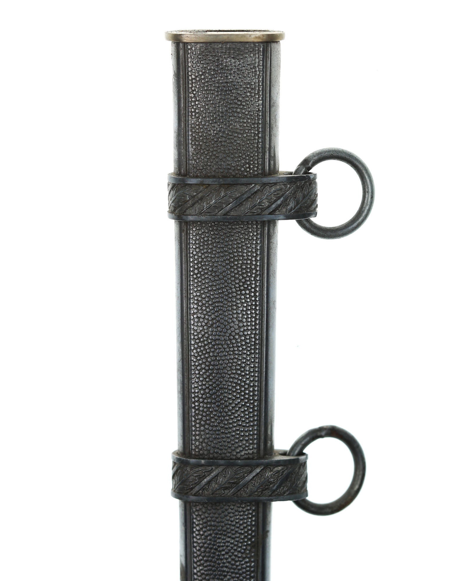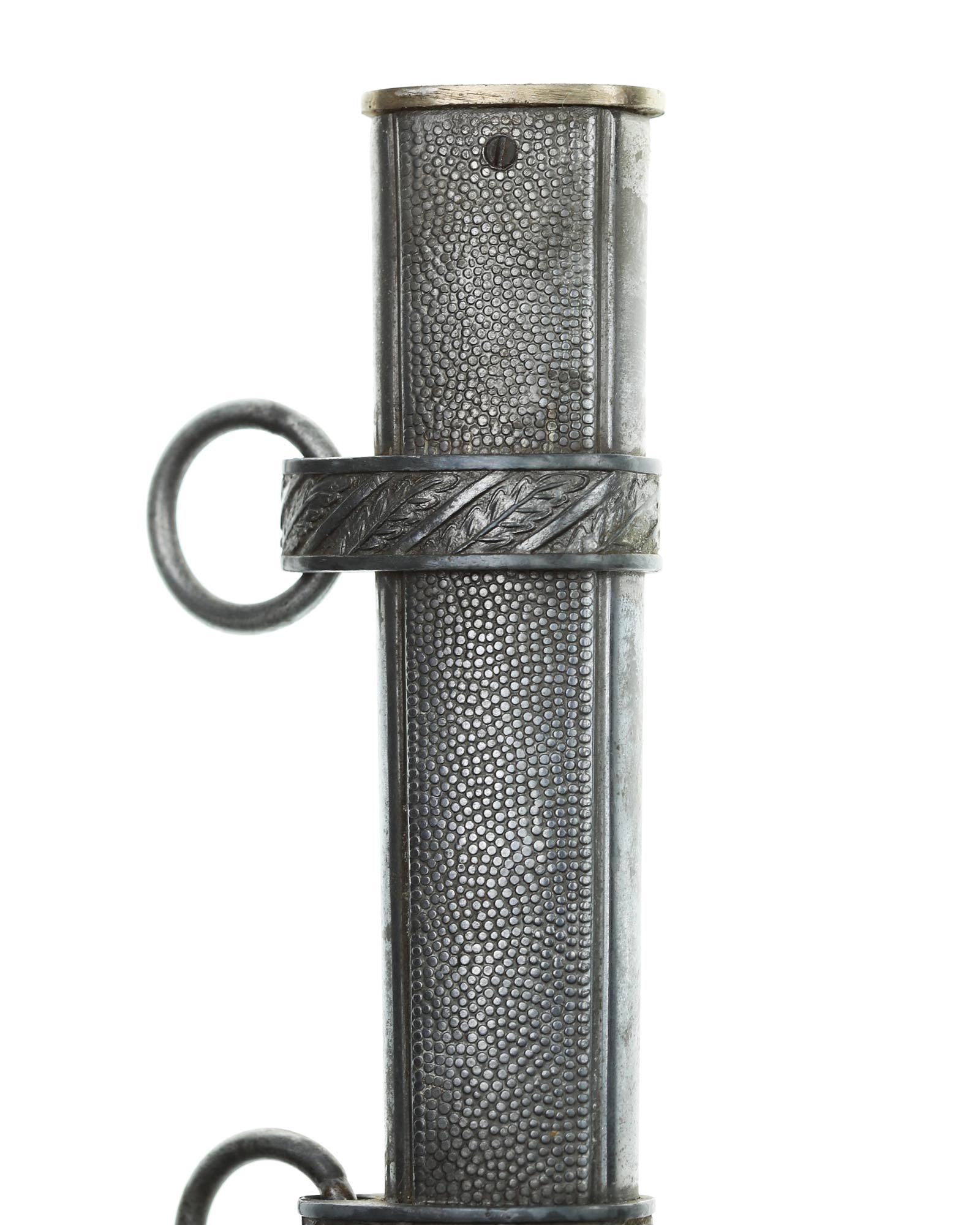Scabbard: The scabbard is also a fine example. It is coated with an airplane gray finish. It has outstanding crisp pebbled panels and the bands are a fine aluminum having excellent detail to the oak leaves. The throat is slightly thick and is retained by ony headless flush mount screw.