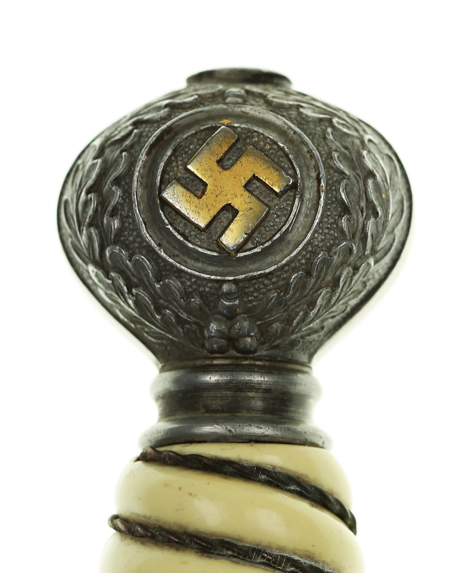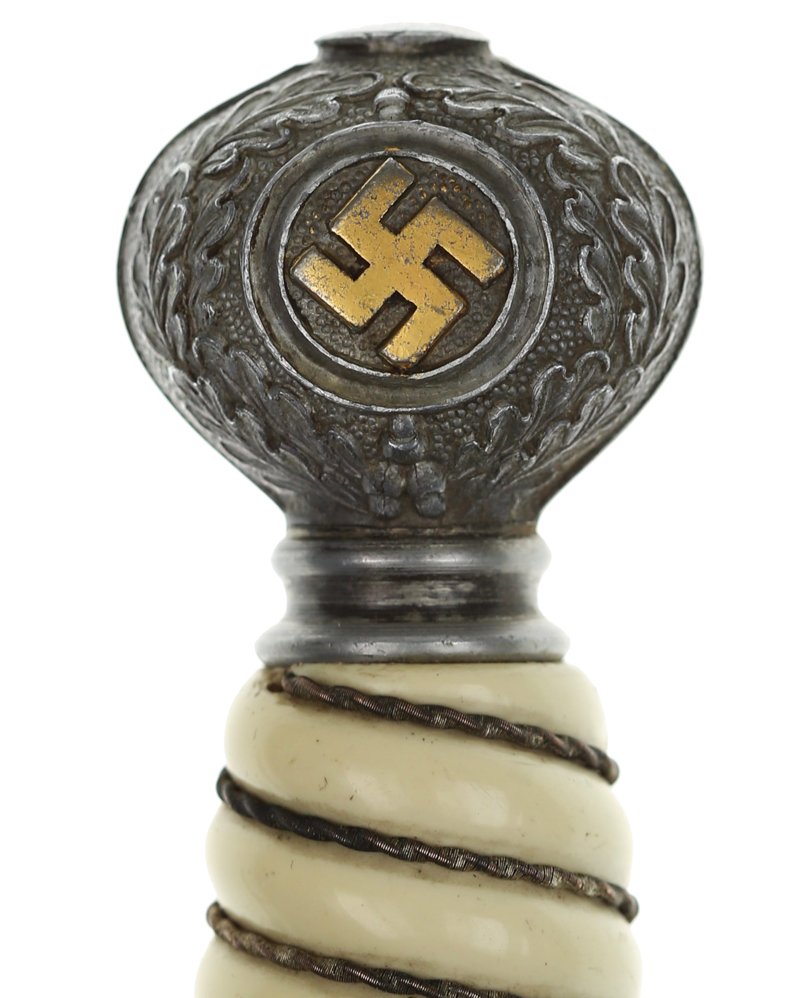 Grip: The grip of this dagger is a fine, off-white color, and is in choice, perfect condition. It is tightly wrapped with twisted silver wire. The pommel is the style with pebbled backgrounds to the oak leaves. These oak leaves are nicely detailed, and they surround the raised swastikas that appear on both sides of the pommel. These swastikas are in original gilded finish. The crossguard is also a great example. The generic variety has large pebbling on the reverse panel. The eagles on these guards are especially nice as the tops of the wings slightly overlap the depiction. This bird has complete detail to the head, breast and wing feathering, as well as the talons. The upper surface of the quillons are decorated with a pattern of oak leaves and acorns cast into the surfaces.