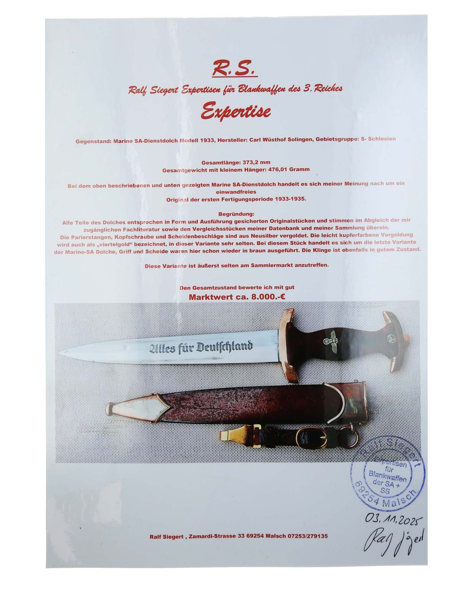 for Silesia. A highly desirable and exceptionally scarce piece of early SA dagger production.