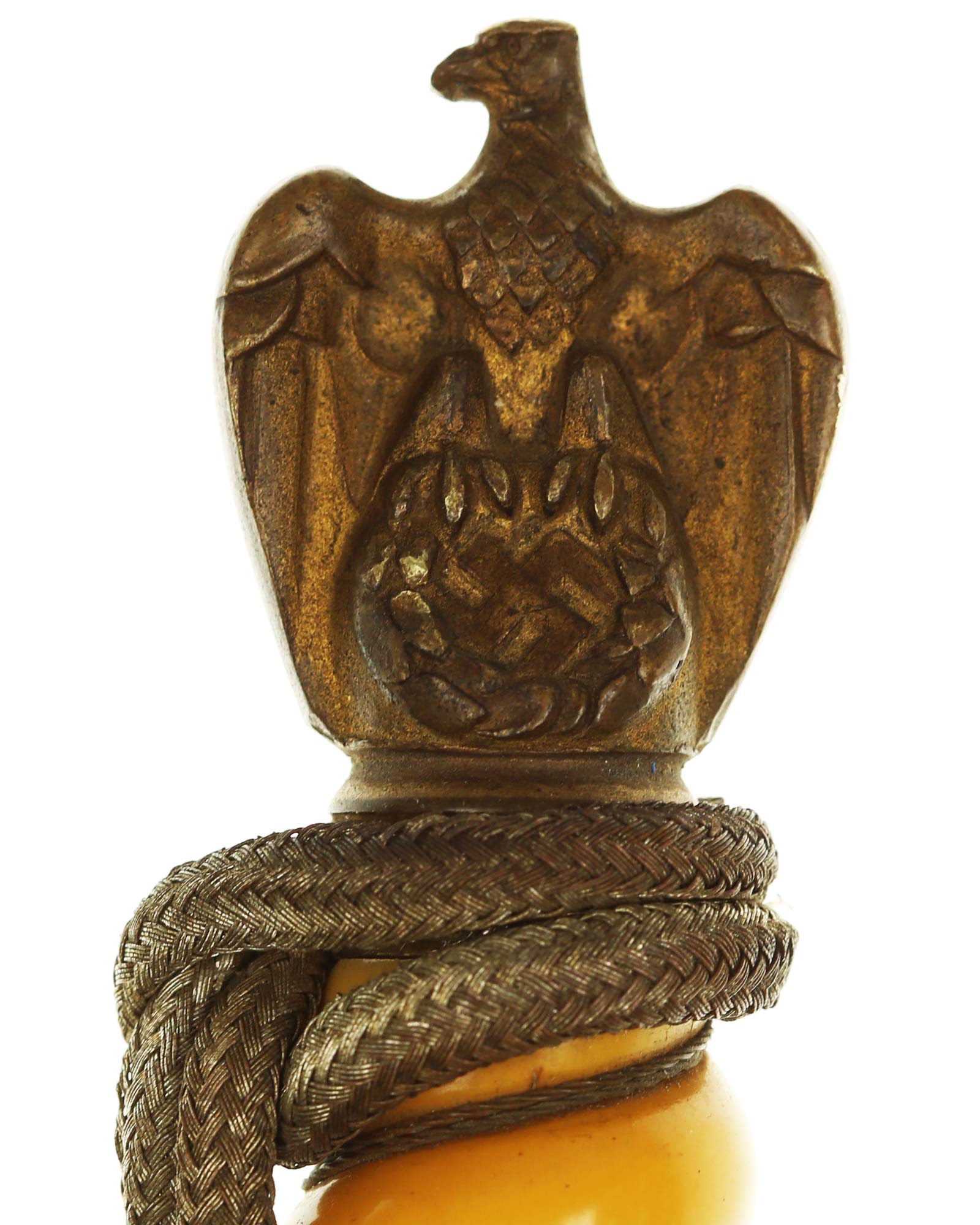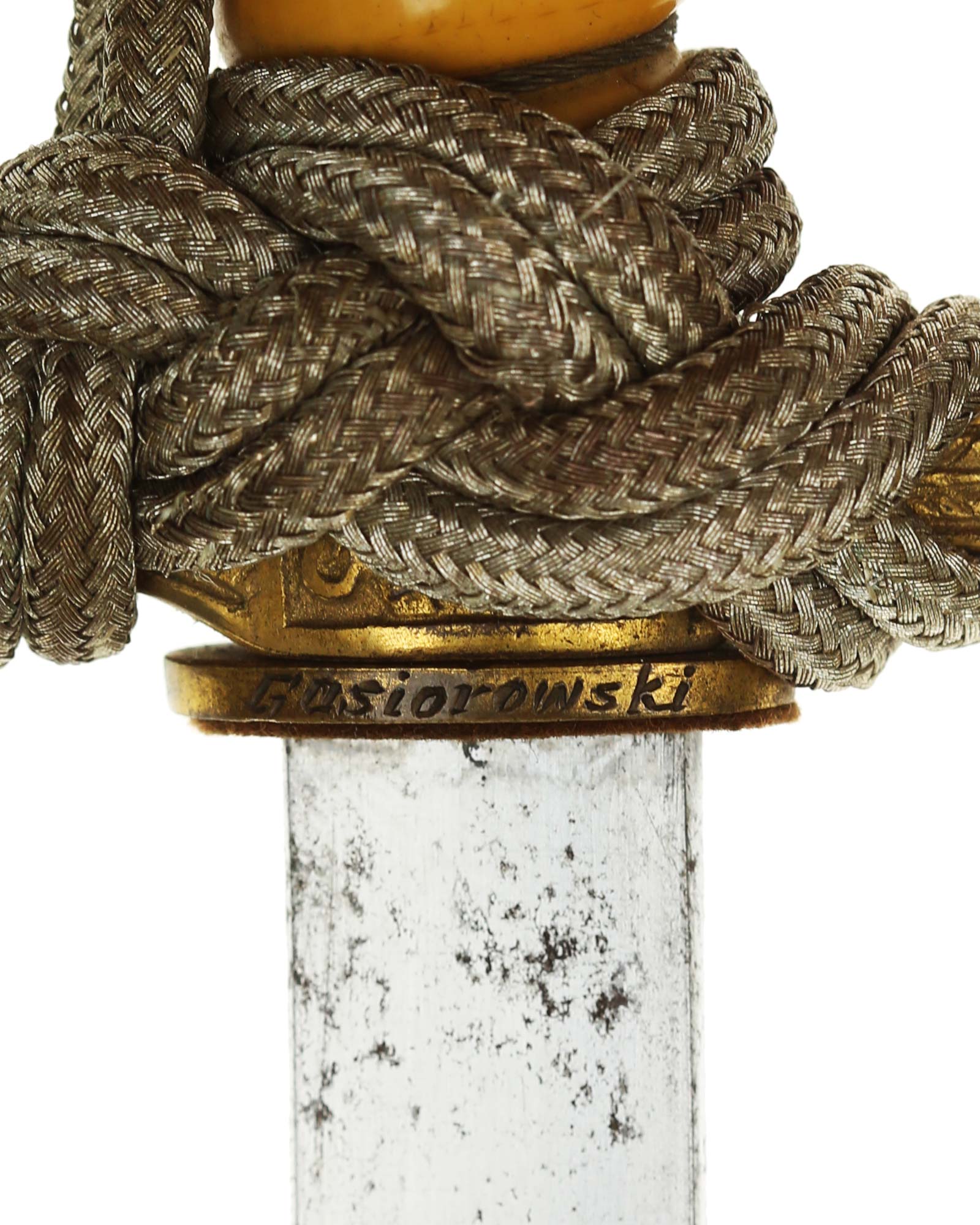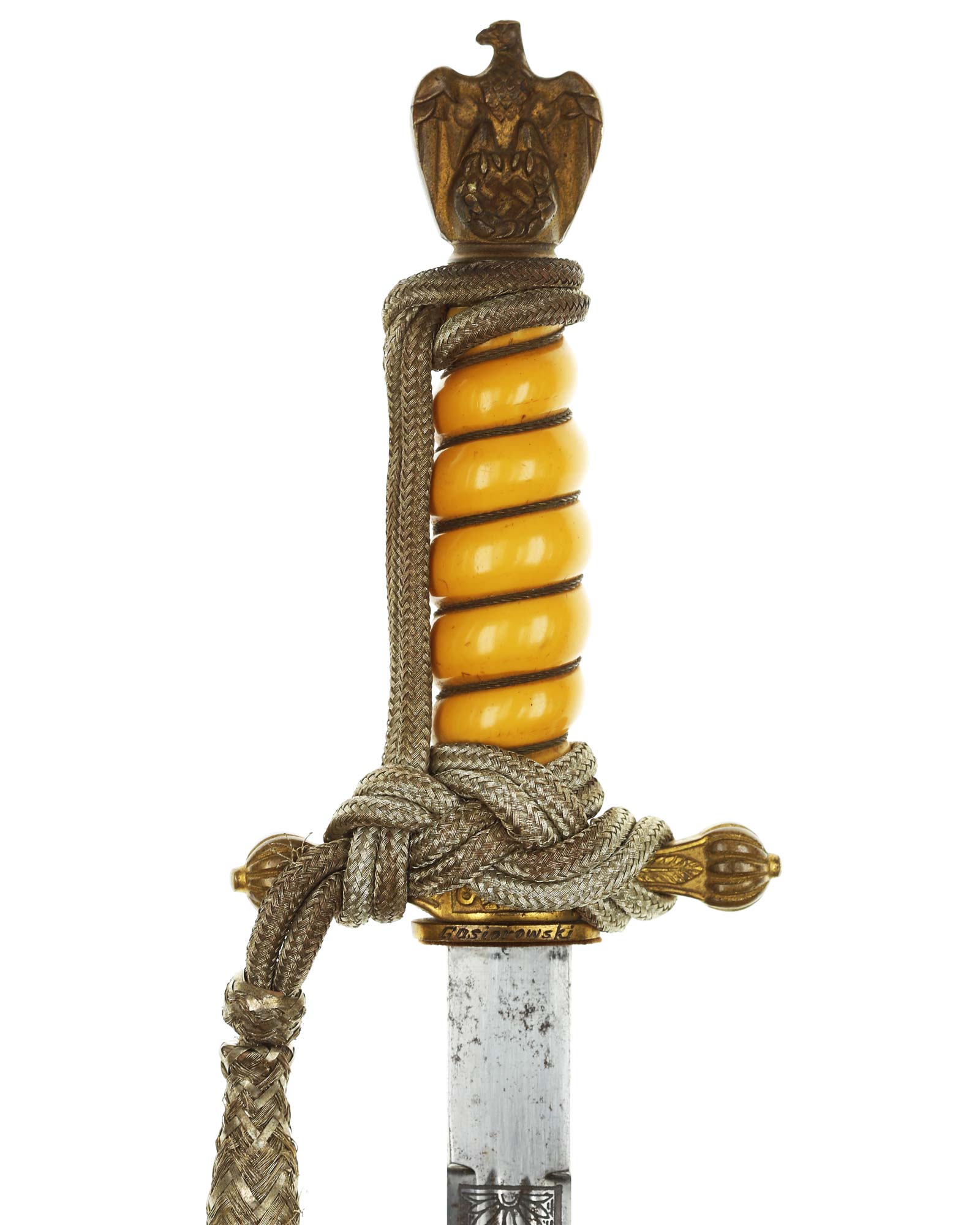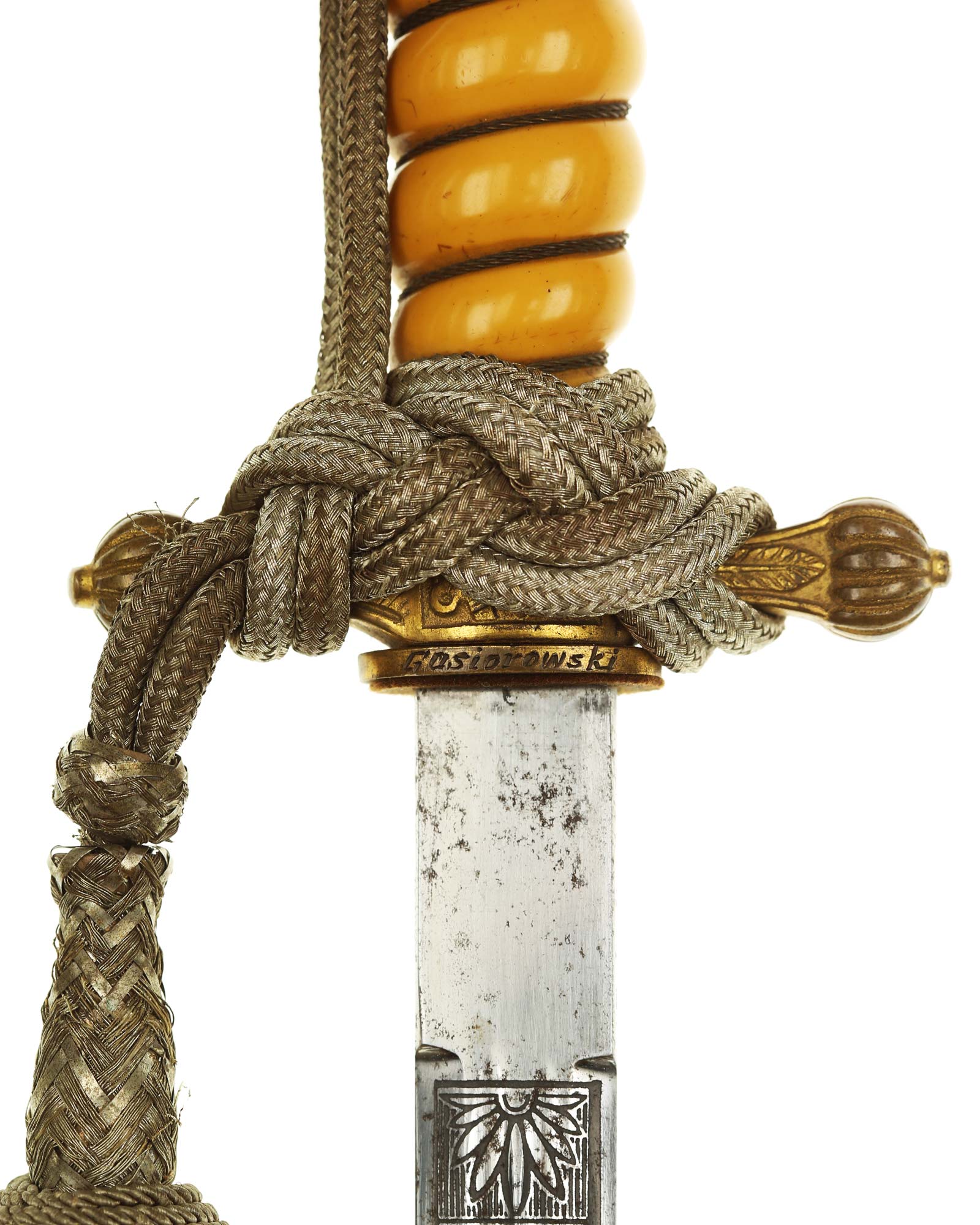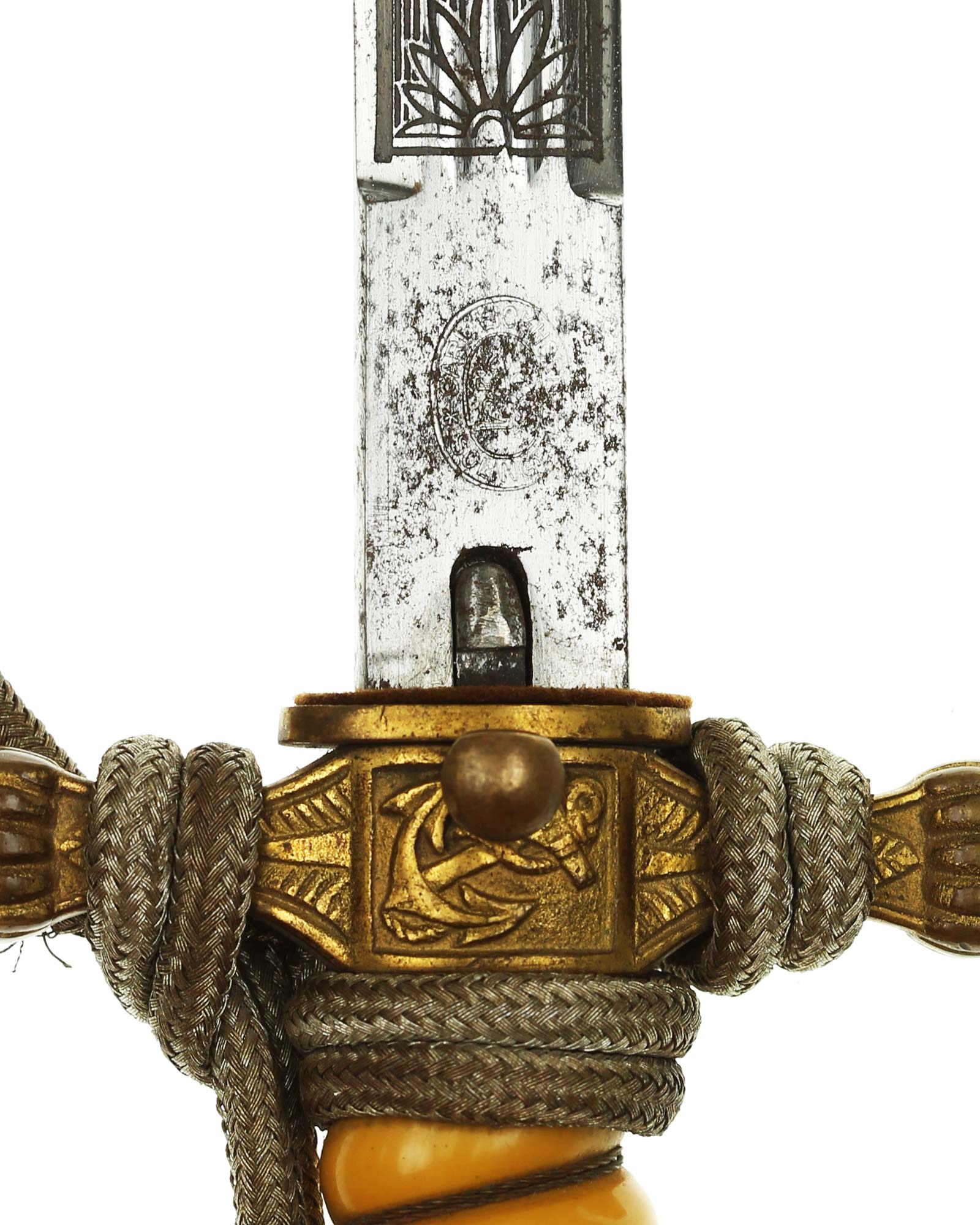 Grip: The grip is a fine, celluloid type. The grip is tightly wrapped with twisted brass wire. The crossguard also has good detail to the fouled anchor center block. Acanthus leaves decorate the surfaces of both of the crossguard arms, and they end in nipple-centered buttons.