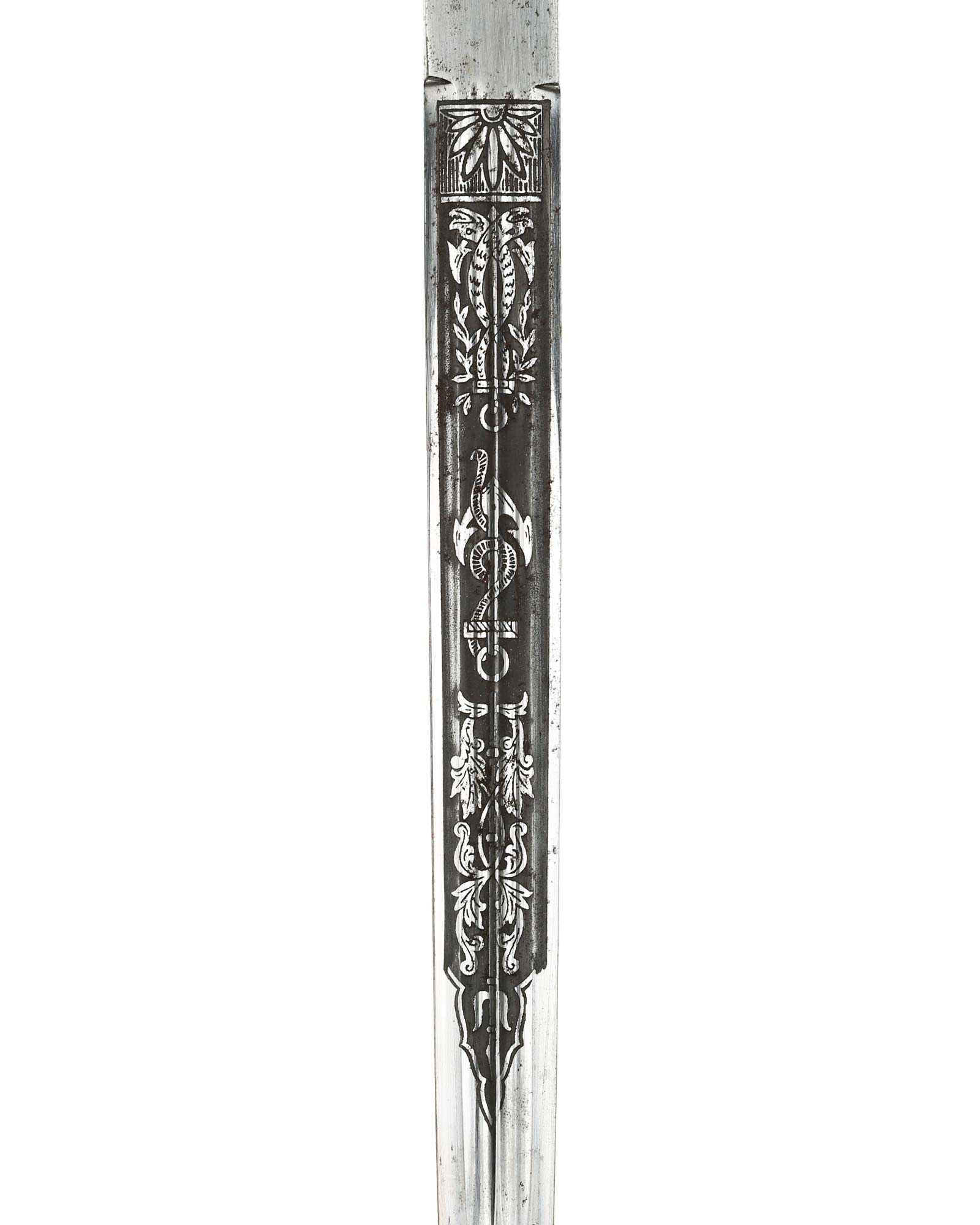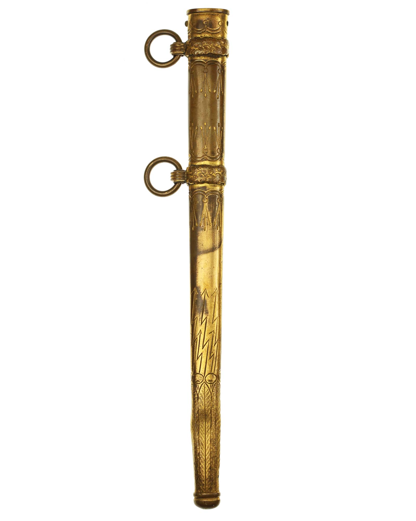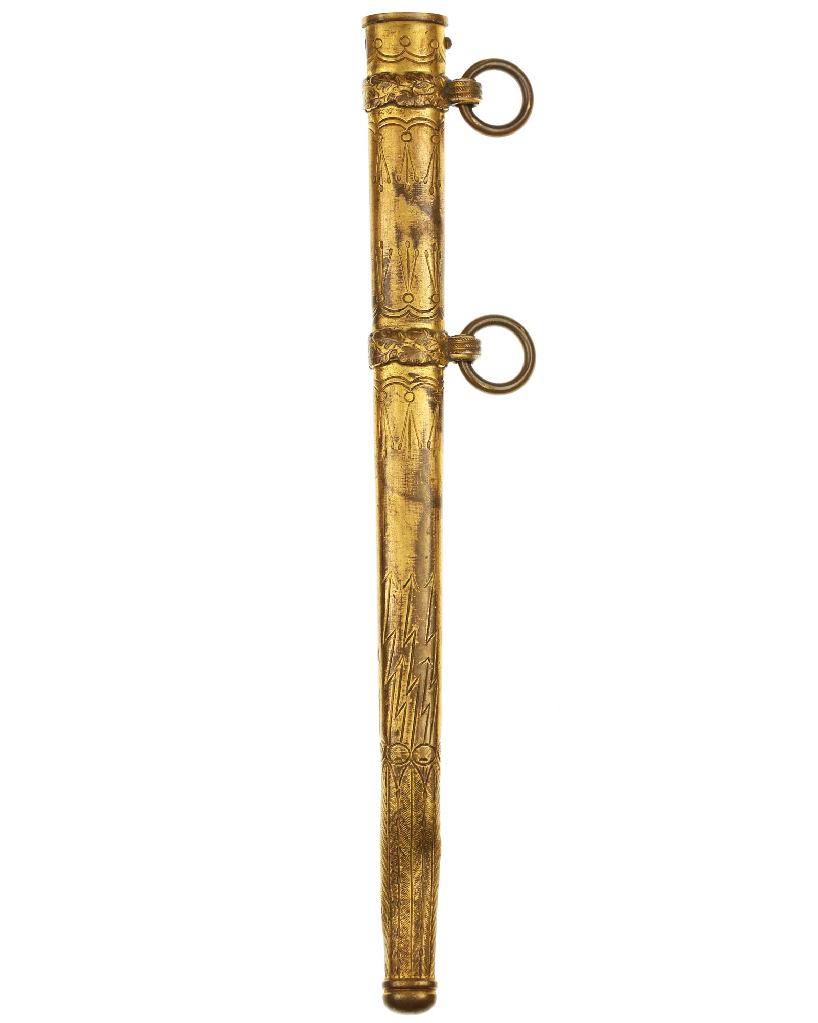 Scabbard: The scabbard is straight throughout, being the lightning bolt type. This scabbard has good detail to the palmettes around the bands, and to the lower lightning bolts, ermine feet, and acanthus leaves. The carrying bands show a little minor wear to the surfaces but the detail to the overlapping oak leaves and acorns is still there. The eyelets have triple serrations, also showing some minor wear.