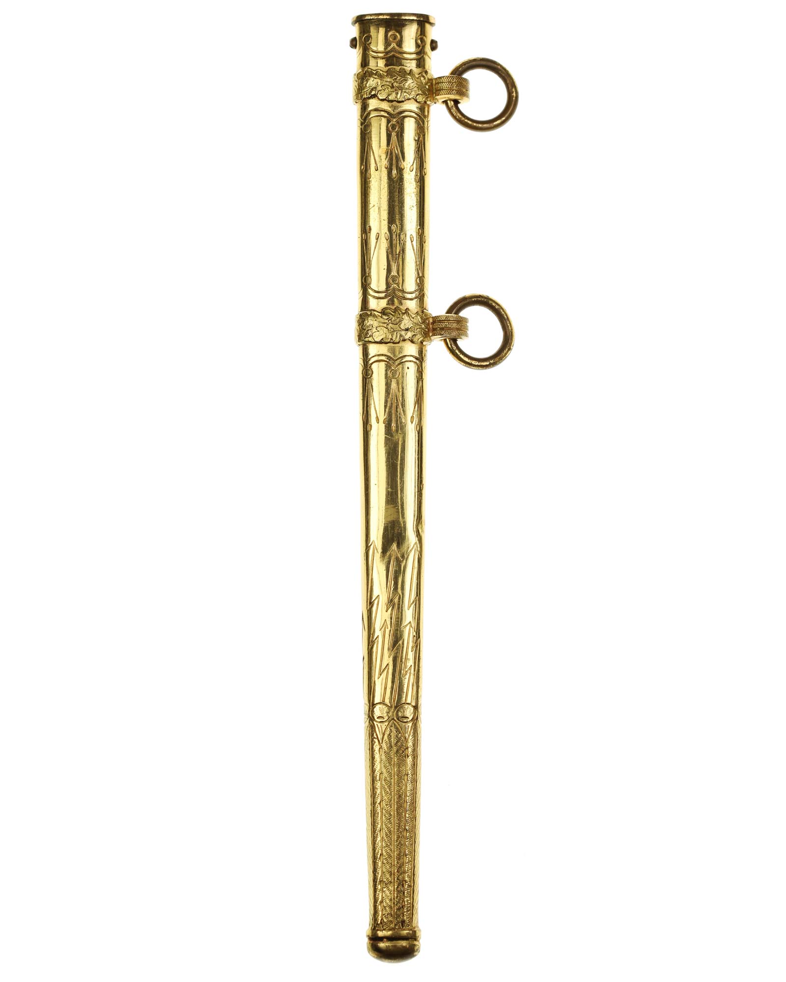 Scabbard: The scabbard is straight throughout, being the lightning bolt type. This scabbard has good detail to the palmettes around the bands, and to the lower lightning bolts, ermine feet, and acanthus leaves. The carrying bands show a little minor wear to the surfaces but the detail to the overlapping oak leaves and acorns is still there. The eyelets have triple serrations, also showing some minor wear.
