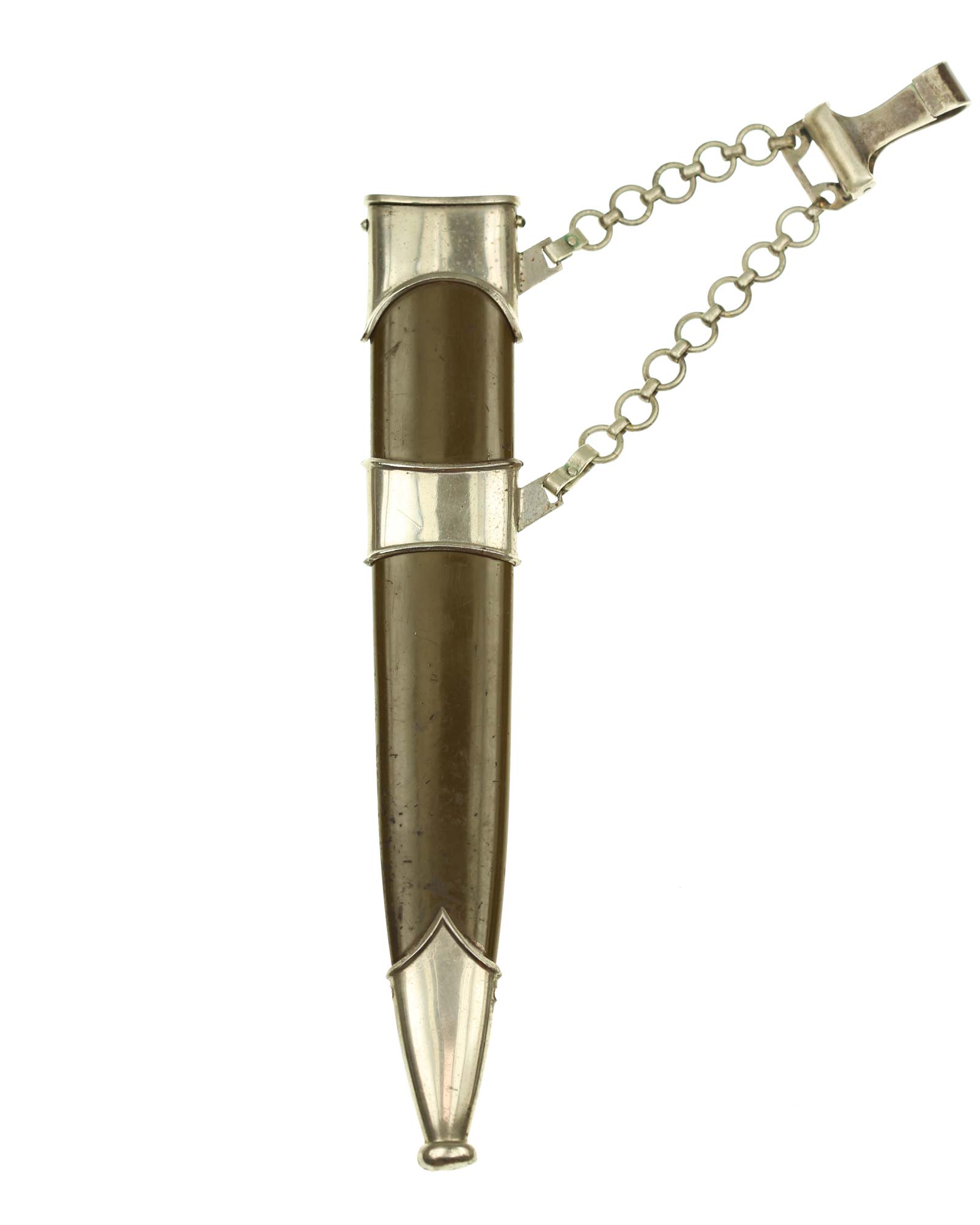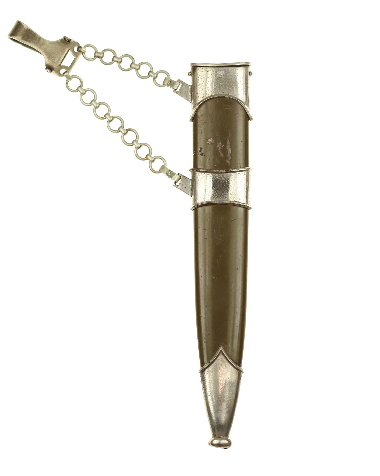 Scabbard: The scabbard shell is straight throughout. Fitted to the scabbard are the nickel plated three mounts. The upper mount is in excellent condition with a little bit of age in the reverse lower portion, the center ramp is in fine condition showing a little age being the style with no screw as we see with this maker. The lower fitting shows some minor age here and there but the plating is still there. These mounts are complete with the original screws. Connected to the ramps at the upper and center fitting is a aluminum style Luftwaffe chain having five upper links and seven lower links.