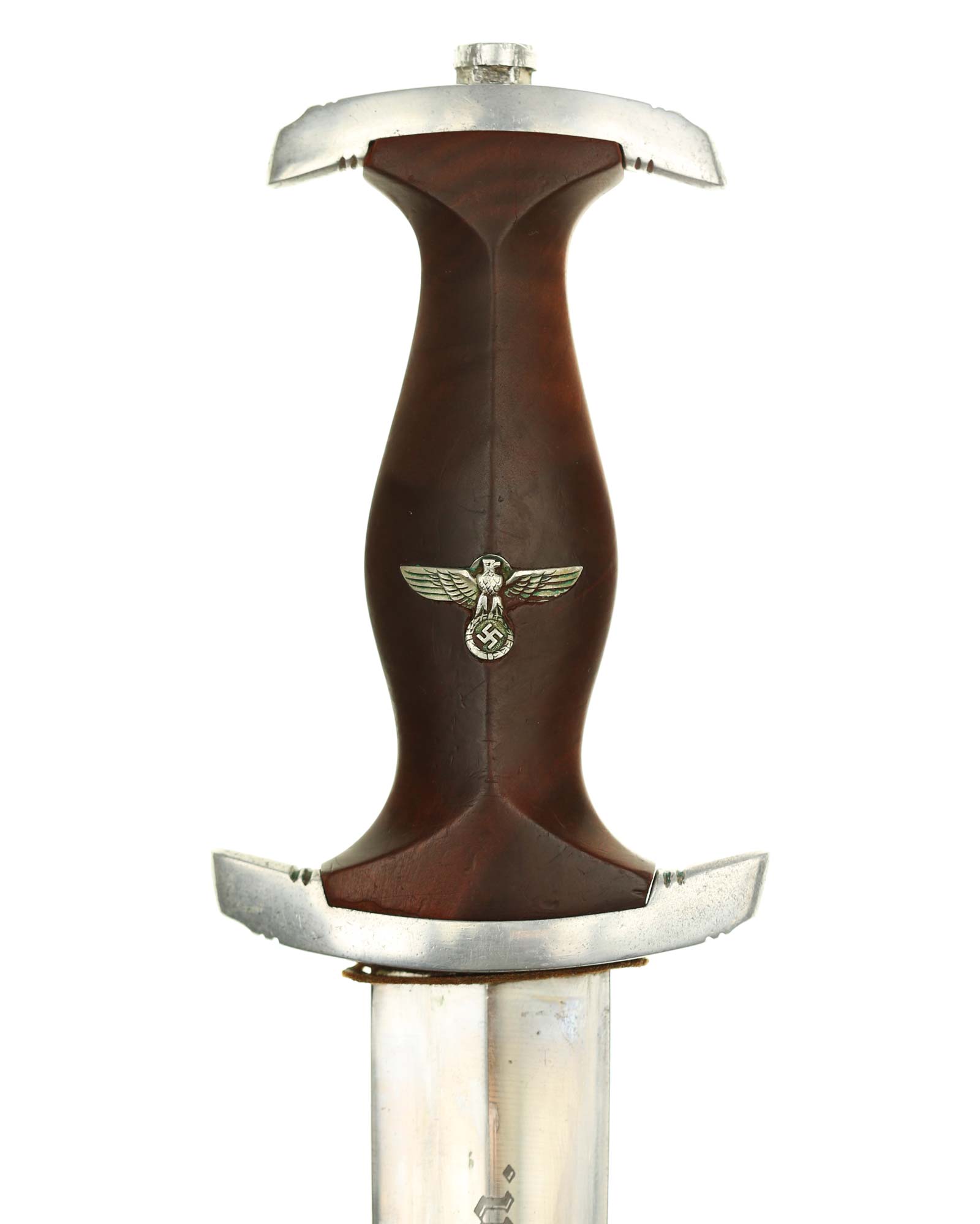 Grip: The grip is a very fine example having high center ridge and vertical grain. It fits the crossguards like a glove. As we see on NPEA's there is no insignia in the upper grip. The grip eagle is a aluminum example. It is the the "high necked" variety and is completely crisp with all detail to the bird's head breast and wing feathering talons wreath and swastika. A fine hilt here.