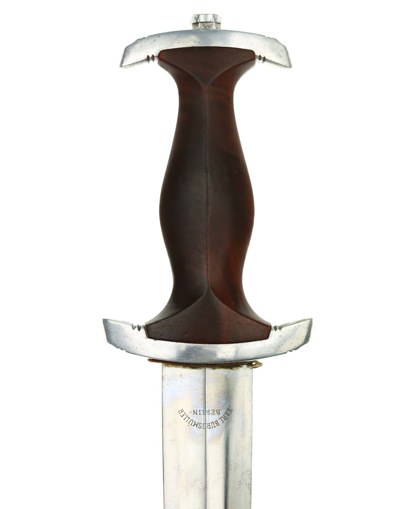 Blade: The blade of this example shows some age and also signs of some old sharpening. The motto is there but has some wear over the lettering. Little of the factory darkening remains in the recesses. This blade grades at only excellent. On the reverse it is etched "Karl Bergsmüller Berlin". There is a proper brown felt washer but it appears to be a replacement.