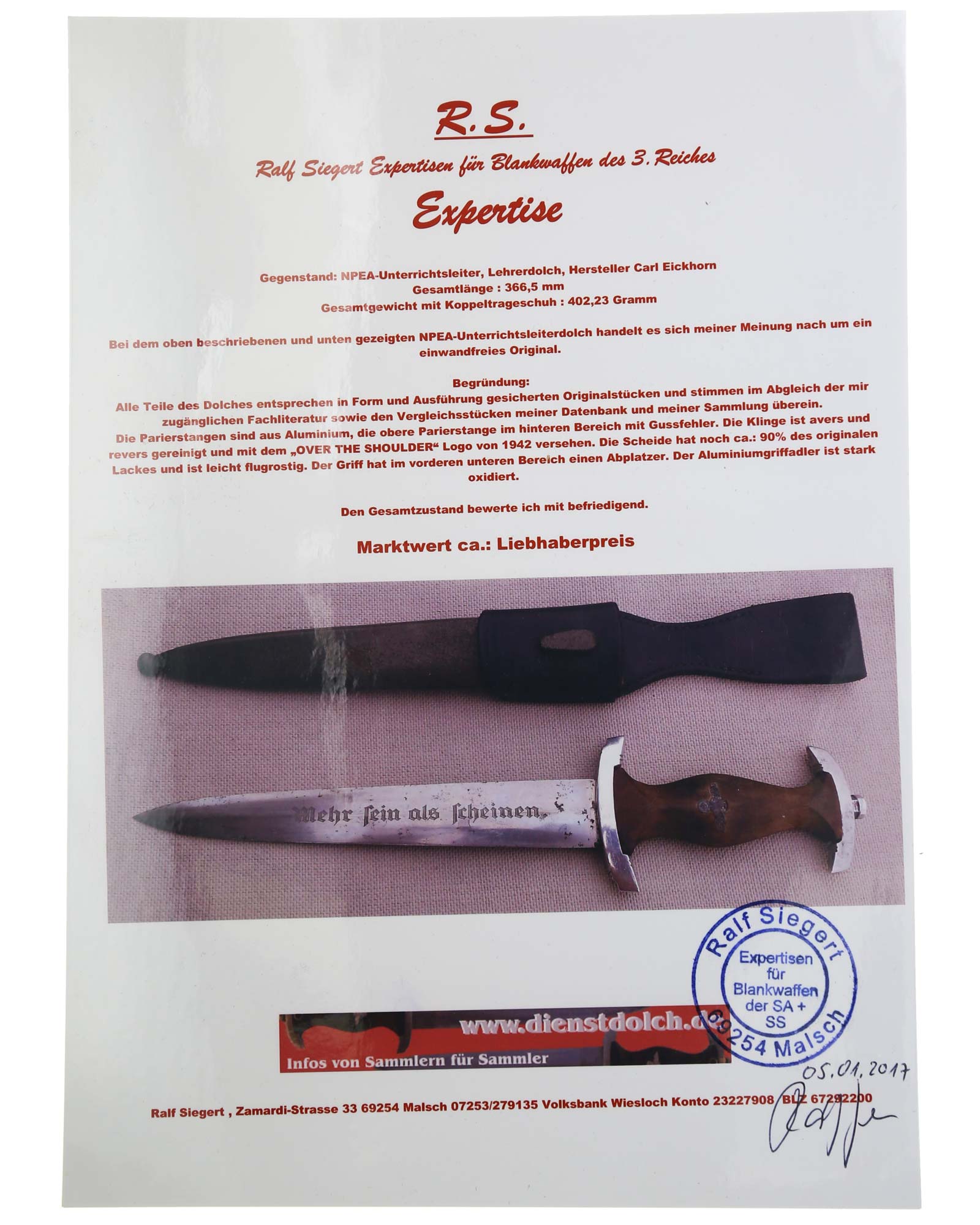 NPEA Student Leader Dagger by Carl Eickhorn Solingen. A beautiful piece from Ralf Siegert Book about NPEA and HJ and with Expertise by Siegert. Model 1935. The total length is 36,7 cm.