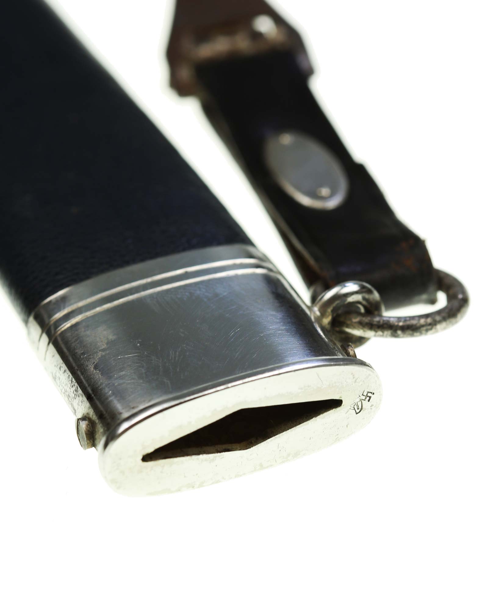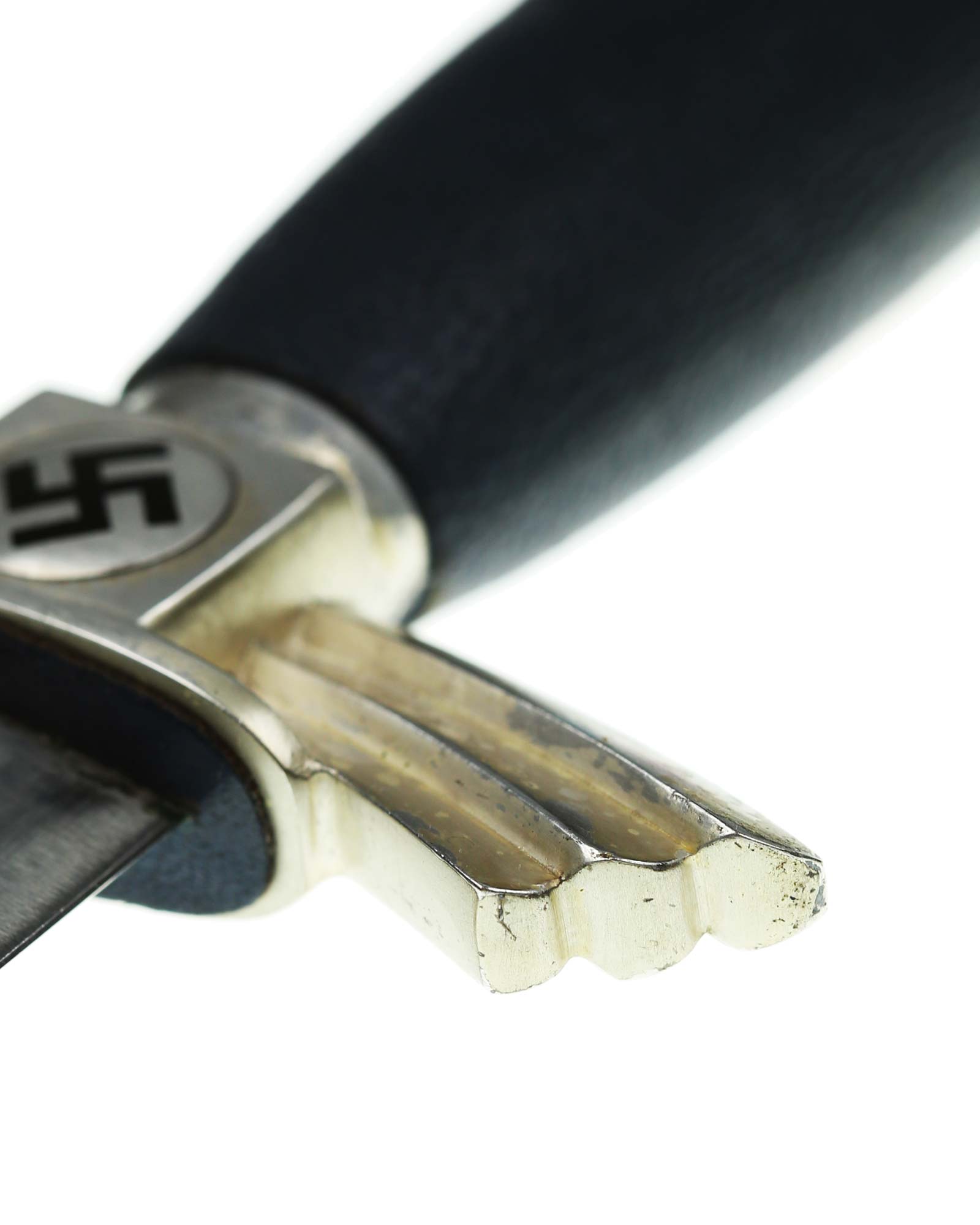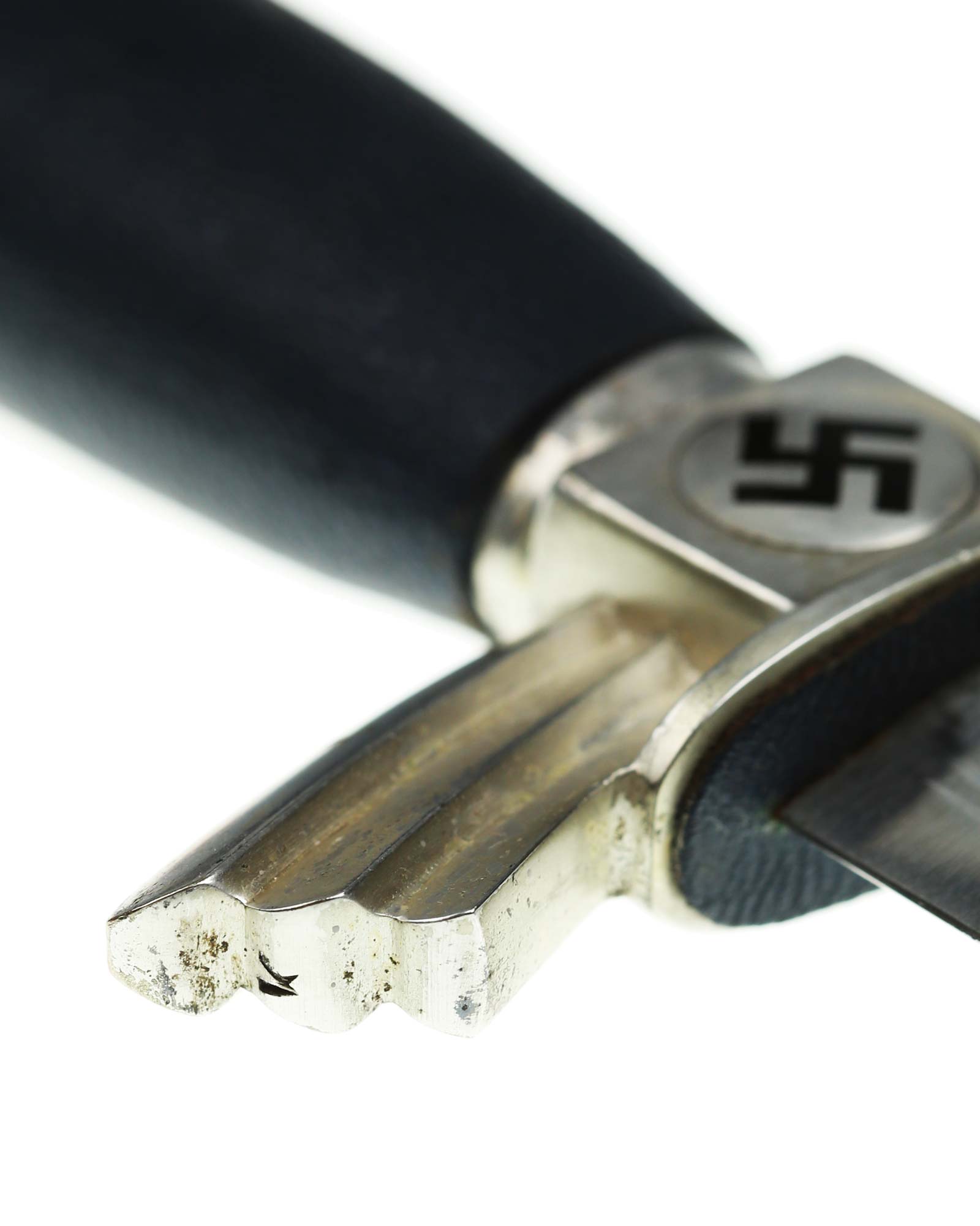 Grip: The pommel cap has the standard three segments. The center block still has crisp rectangular squares having the separate added medallions which are complete with mobile black enamel swastikas. The crossguard arms are the three segment type which go downwards slightly. The “K” is stamped into one end quillon. The grip is a wood base being bulbous in the center and tapering on both ends. This grip is covered with fine Moroccan leather being two-piece construction.