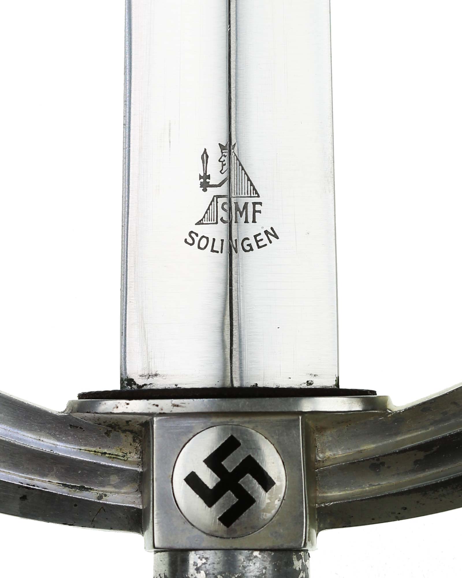 Blade: This blade retains needlelike tip and is MINT condition. The blade has grain in the surfaces. The producer etching is on the reverse ricasso. The etched trademark consists of a seated king which is holding an upward pointing sword. The king is sitting on the firm’s initials, SMF - Stöcker & Co. (Solinger Metallwaffenfabrik), Solingen. This blade is protected by the original matching blue grained leather washer.