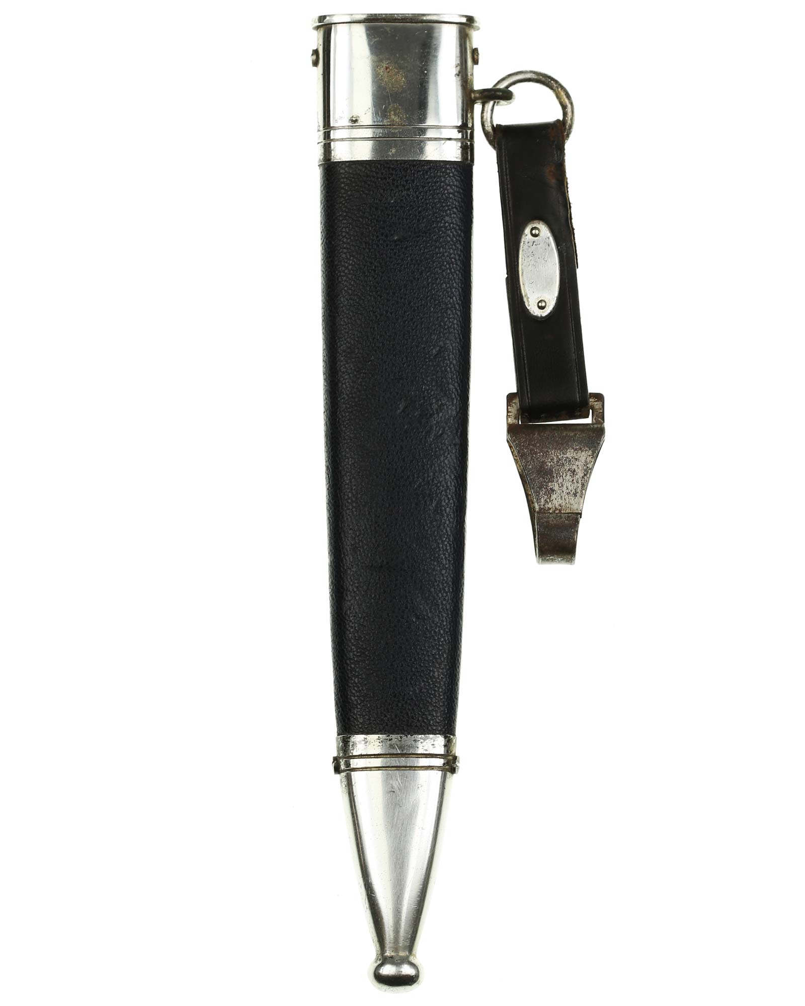 Scabbard: The scabbard shell is nice and straight. This shell is covered with matching Moroccan leather. This leather is perfect except for a couple of areas along the right edge. The scabbard mounts are in outstanding condition to include the lower ball. The flatter style screws are in the sides and are all in place. The carrying ring is complete with the original short hanger.
