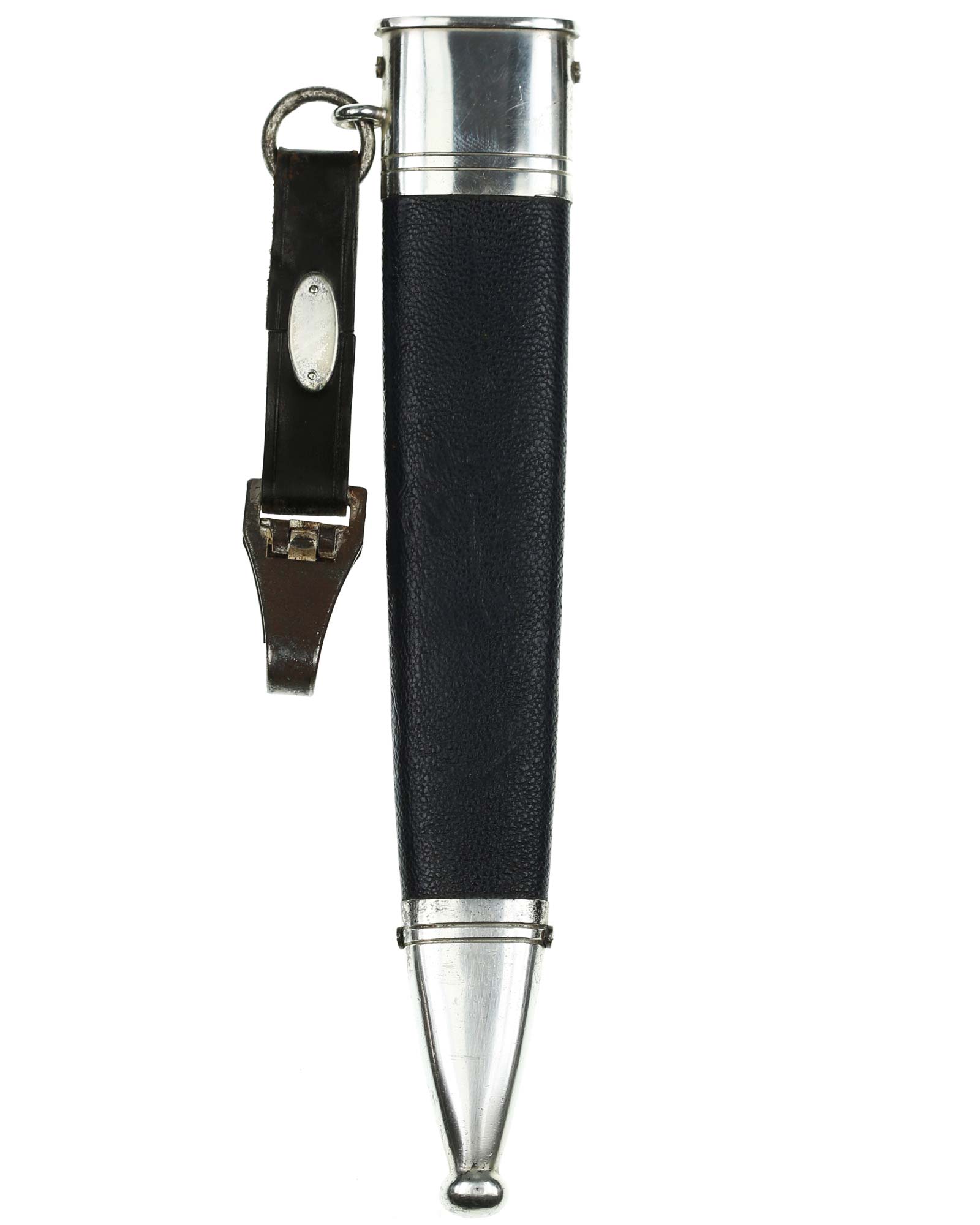 Hanger: This short hanger is as nice as they come being of a dark brown leather and having accent lines along all of the edges. This leather is still in pristine condition. The leather is retained by two oval nickel disks which are held in place by two rivets. These disks also have some original frosting on them. The clip is the standard nickel unmarked type.