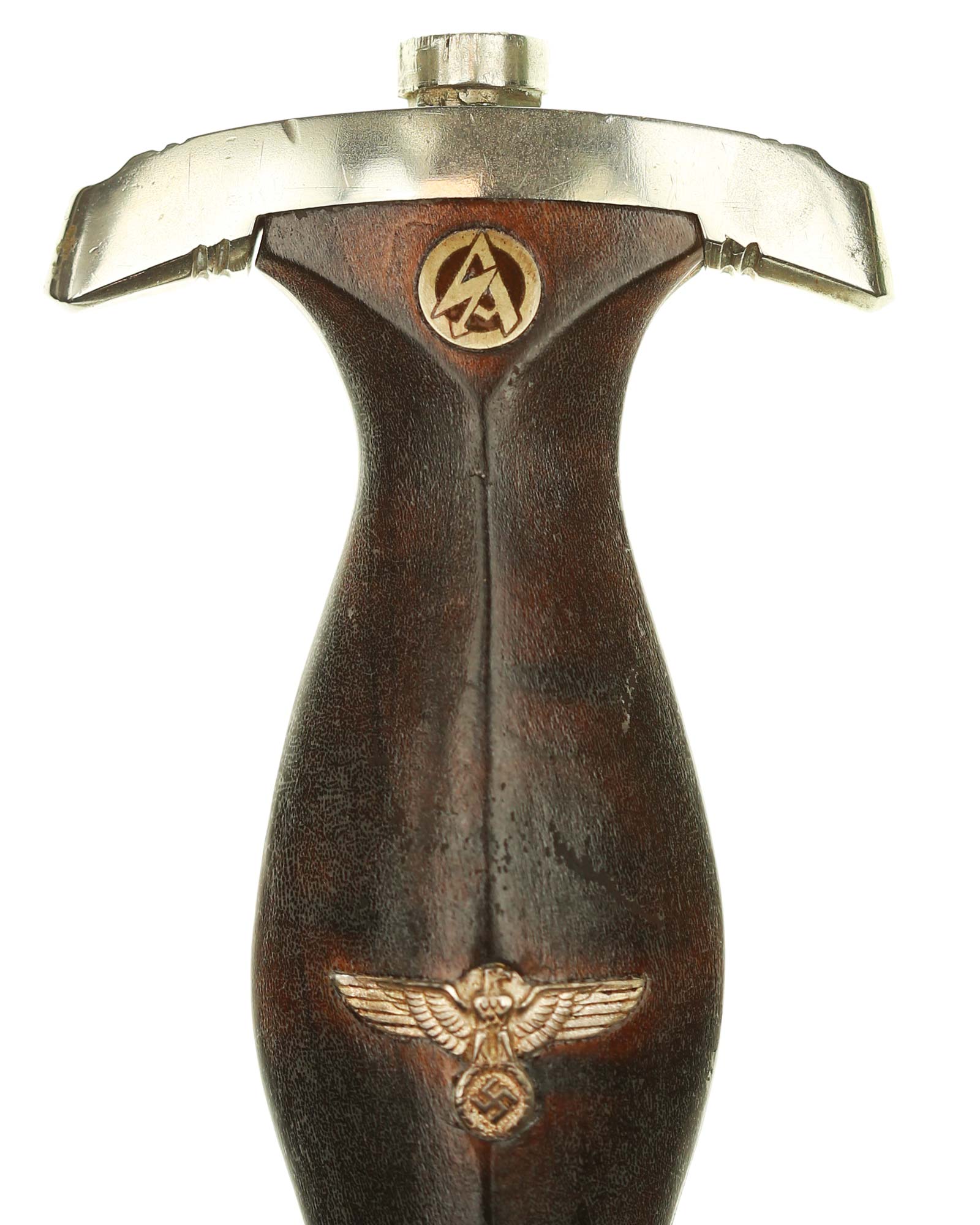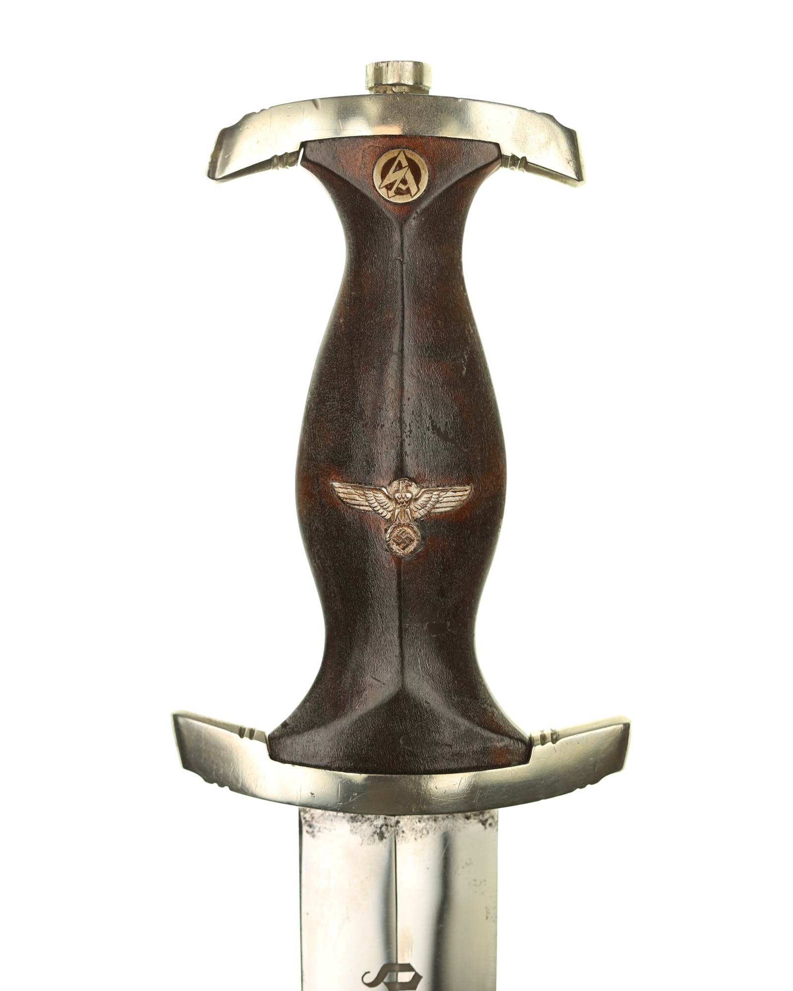 Grip: Nickel plated fittings on both crossguards, along with the pommel, tight nut on the pommel, both crossguards exhibit scattered chipping in the plating where they but the wooden handle and light contact overall. Dark reddish brown wooden handle exhibits very light contact and is without chipping, embedded finely-detailed aluminum eagle rates near extremely fine, as does the SA insignia, its brown enamels and silvering intact.