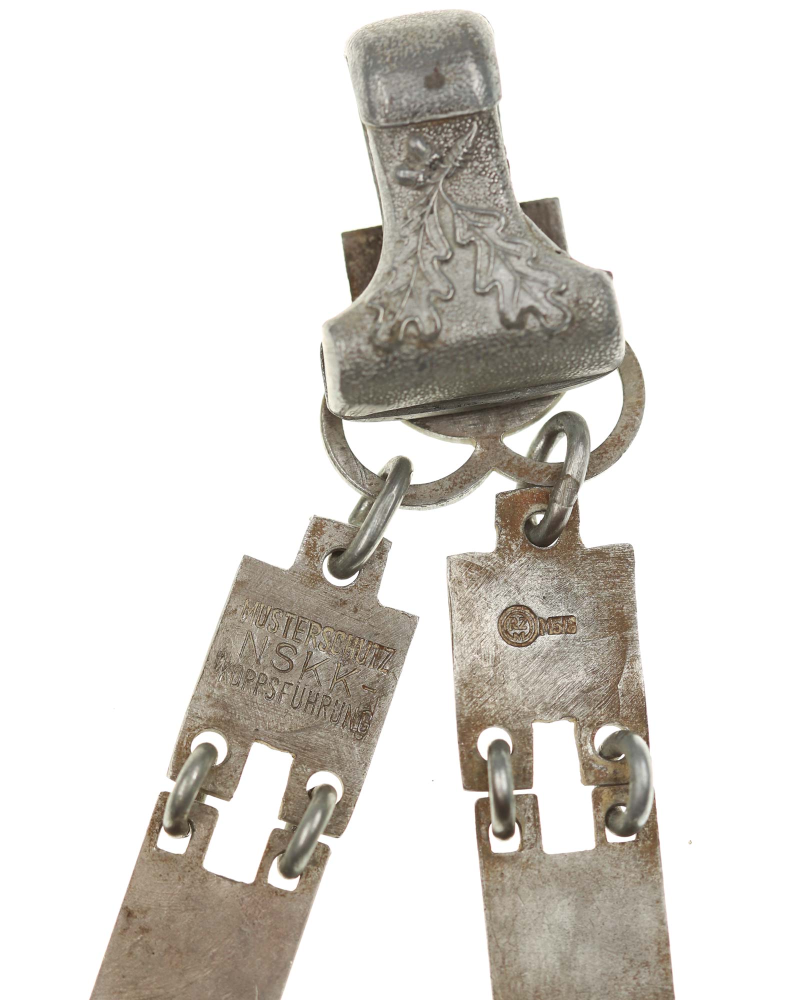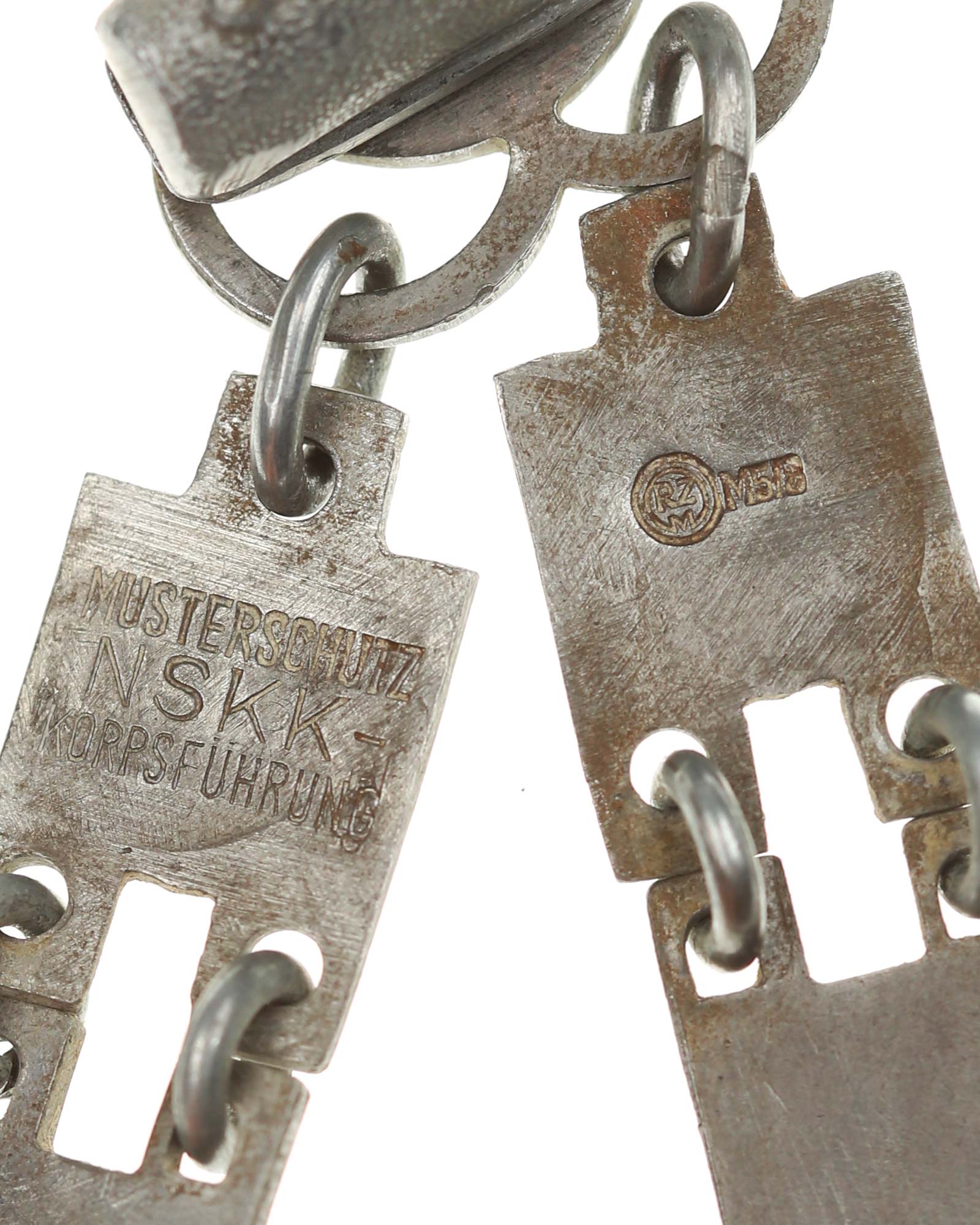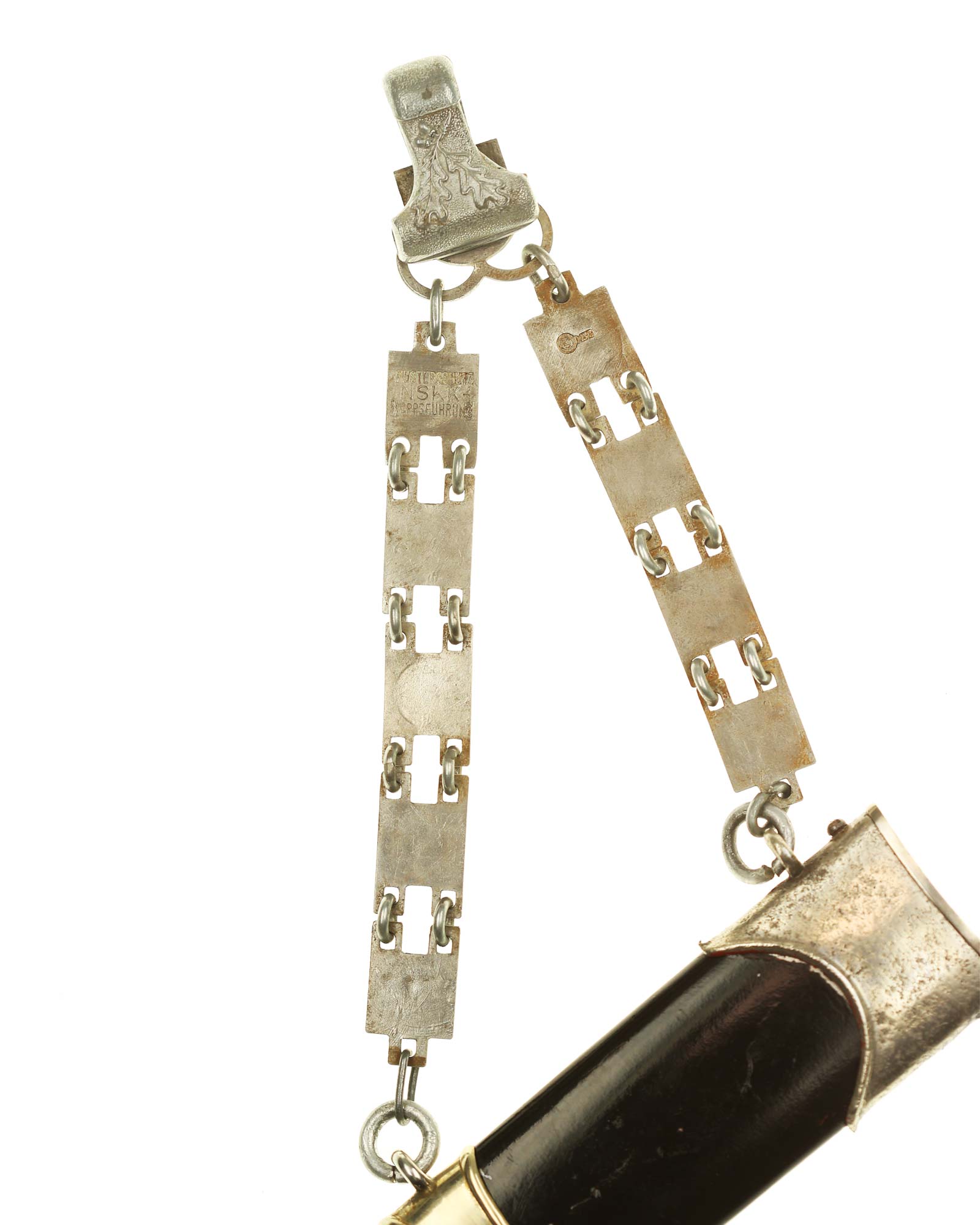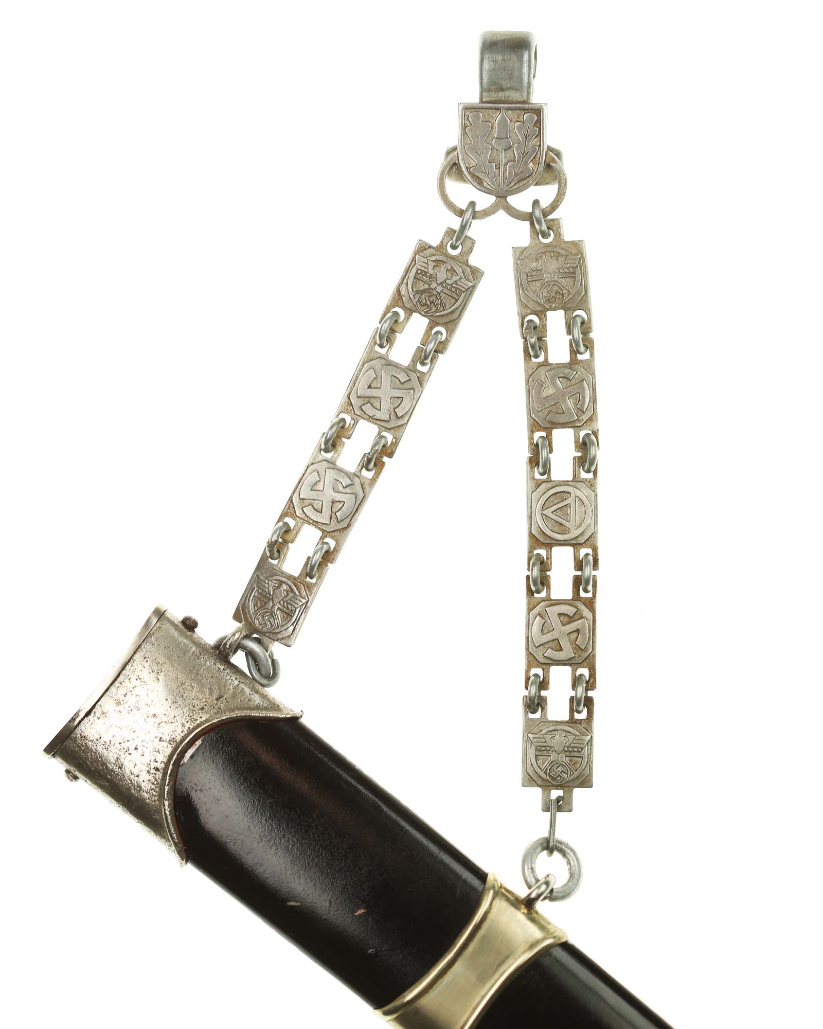Scabbard: The scabbard fittings with light contact overall, contact marks and scratches evident on the black painted body from active use. Ball finial exhibits contact marks and pitting, the locket and chape held firmly in place via two screws each. Rings attached to the locket and central band, the chain attached being the typical factory type, the upper chain composed of four links, the lower chain with five links, acorn and oak leaves insignia on the clip. The chain is marked with the RZM insignia and maker marked "M5/8" (F.W. Assmann & Söhne, Lüdenscheid) on the reverse of the lower link and marked "NSKK MUSTERSCHUTZ KORPSFÜHRUNG" on the reverse of the upper link.