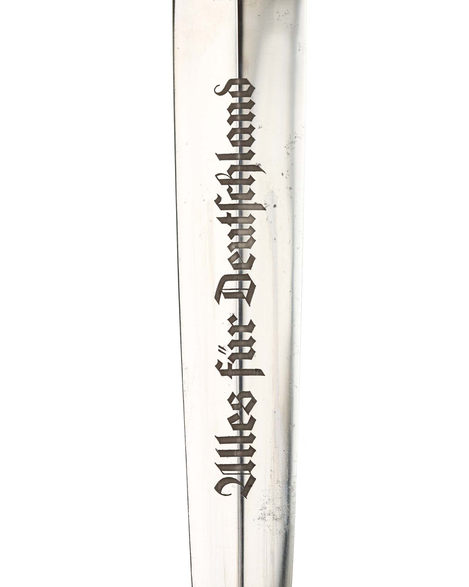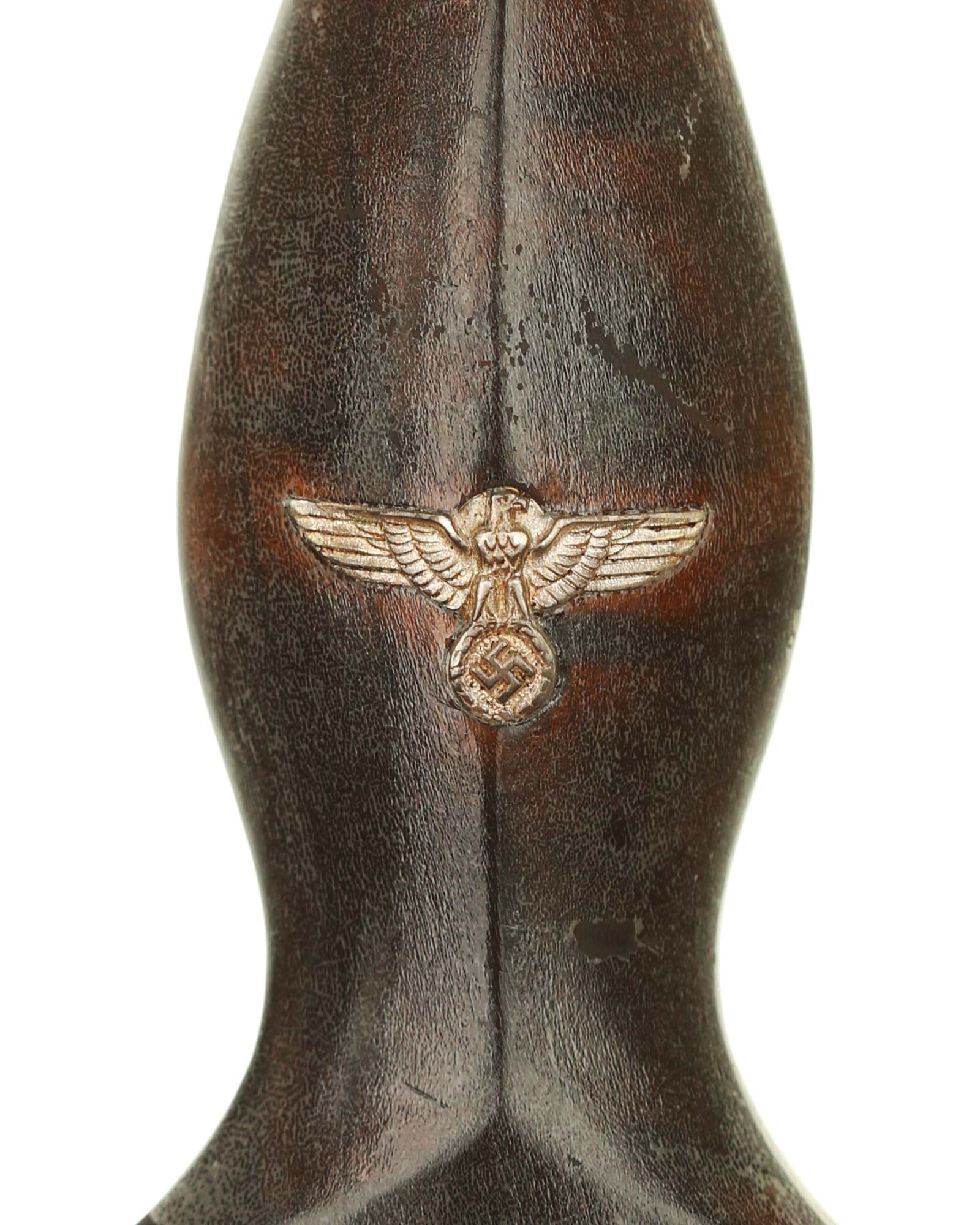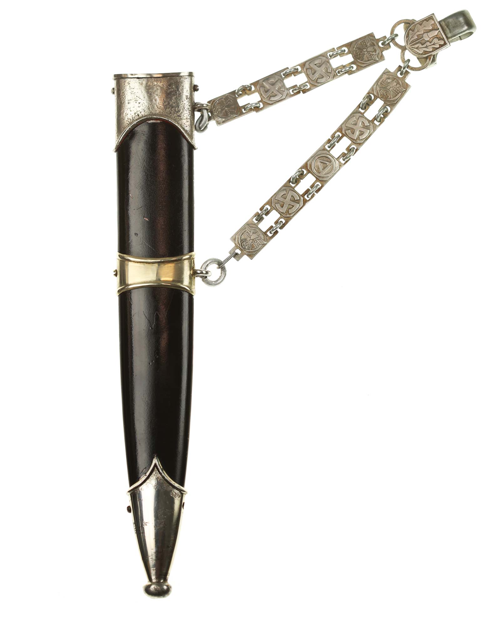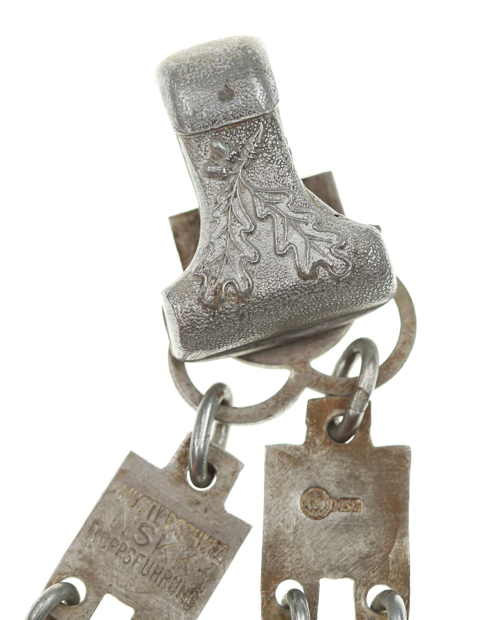 Scabbard: The scabbard fittings with light contact overall, contact marks and scratches evident on the black painted body from active use. Ball finial exhibits contact marks and pitting, the locket and chape held firmly in place via two screws each. Rings attached to the locket and central band, the chain attached being the typical factory type, the upper chain composed of four links, the lower chain with five links, acorn and oak leaves insignia on the clip. The chain is marked with the RZM insignia and maker marked "M5/8" (F.W. Assmann & Söhne, Lüdenscheid) on the reverse of the lower link and marked "NSKK MUSTERSCHUTZ KORPSFÜHRUNG" on the reverse of the upper link.