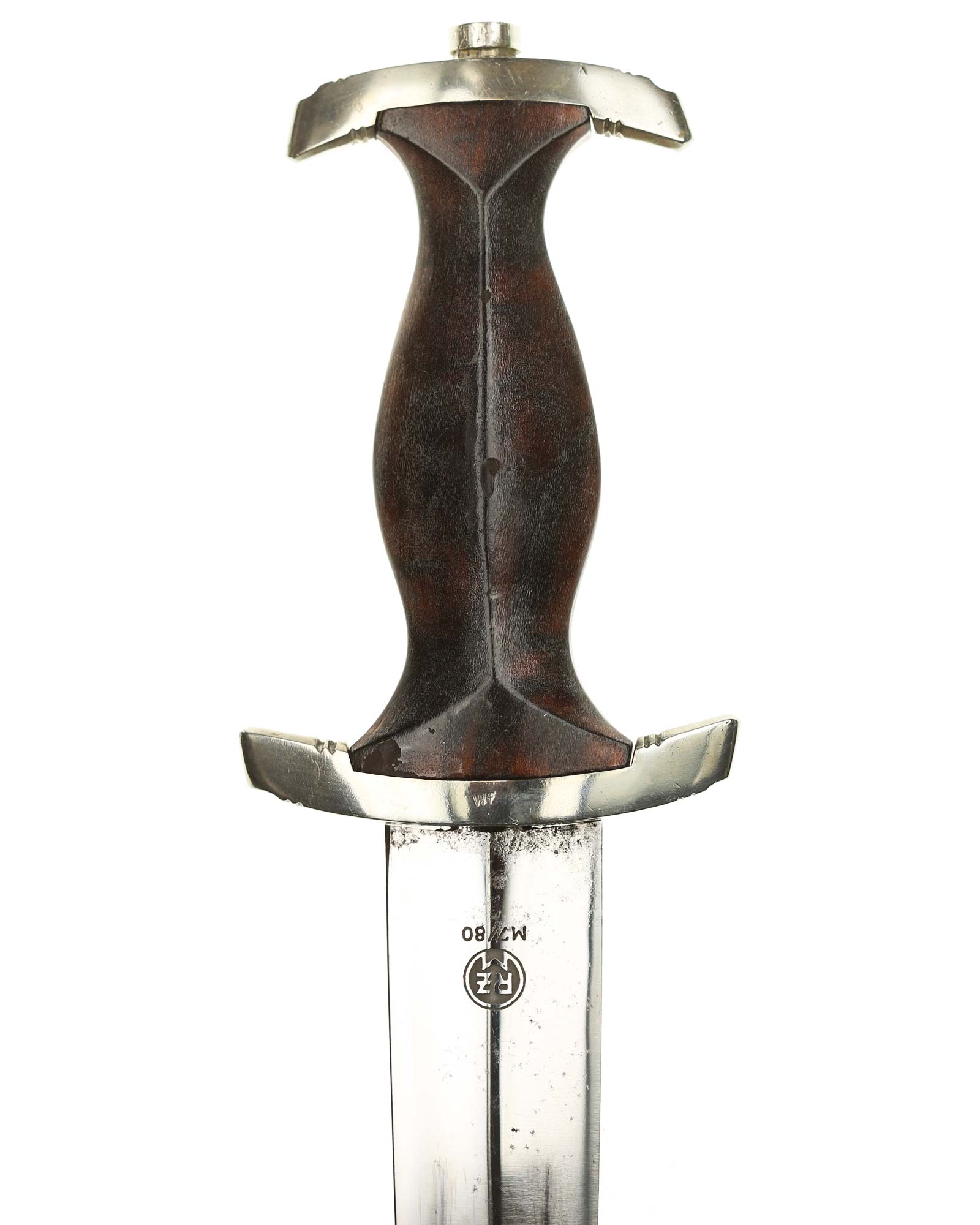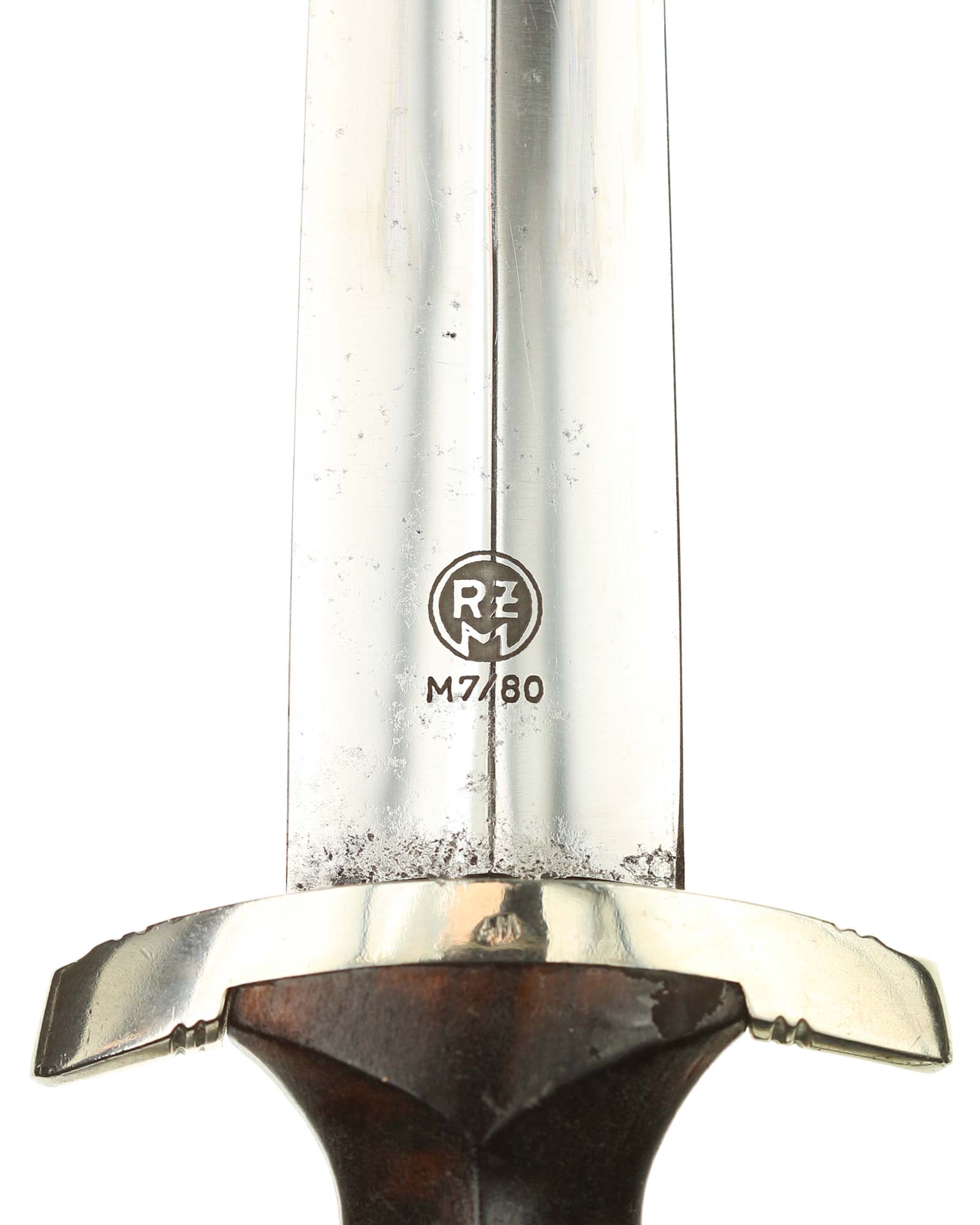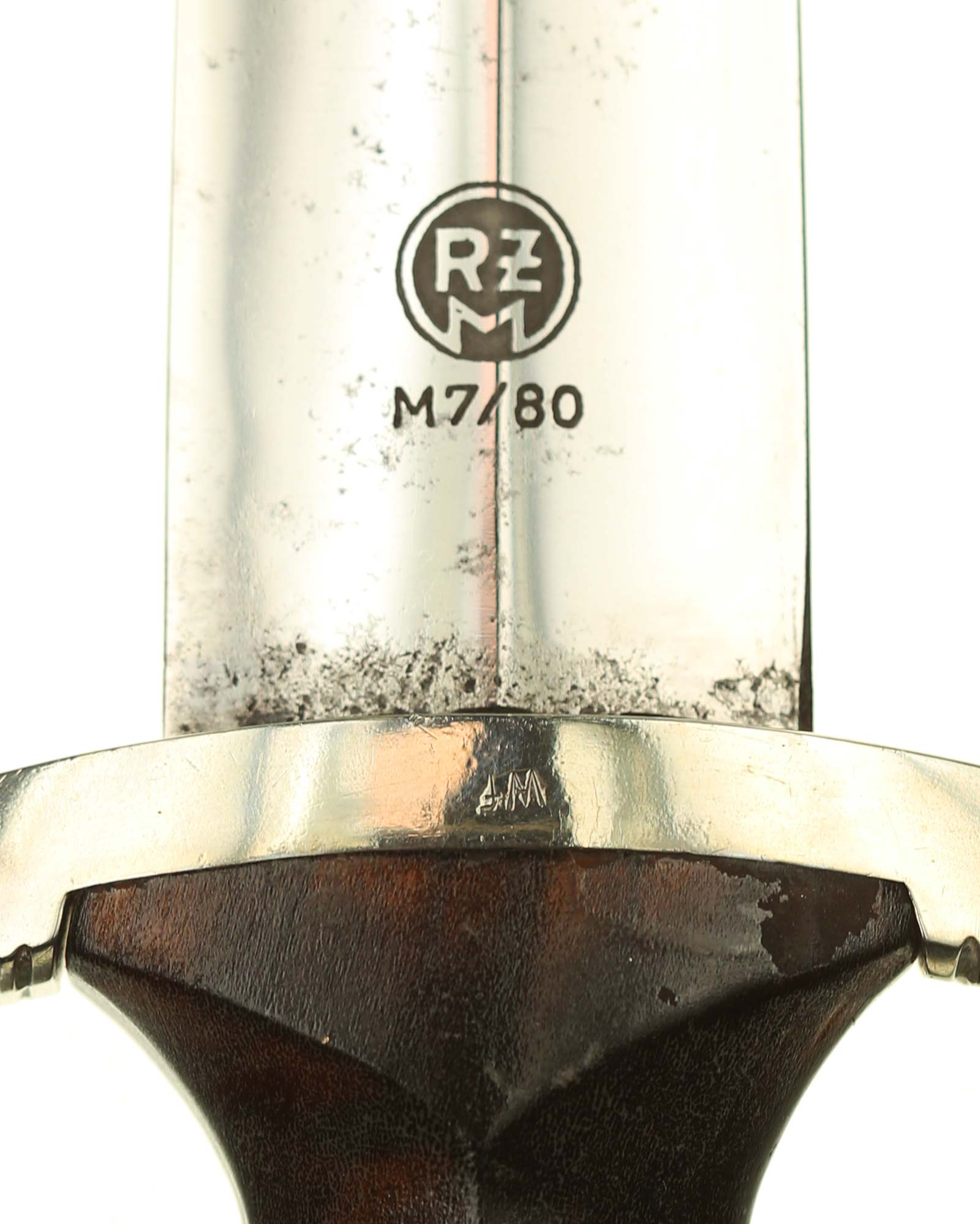 Blade: The blade is in EXC++ condition. The SA motto is crisp and deep. The reverse ricasso is marked with the RZM (Reichszeugmeisterei) insignia and maker marked "M7/80" (Gustav Spitzer, Solingen) on the reverse ricasso.