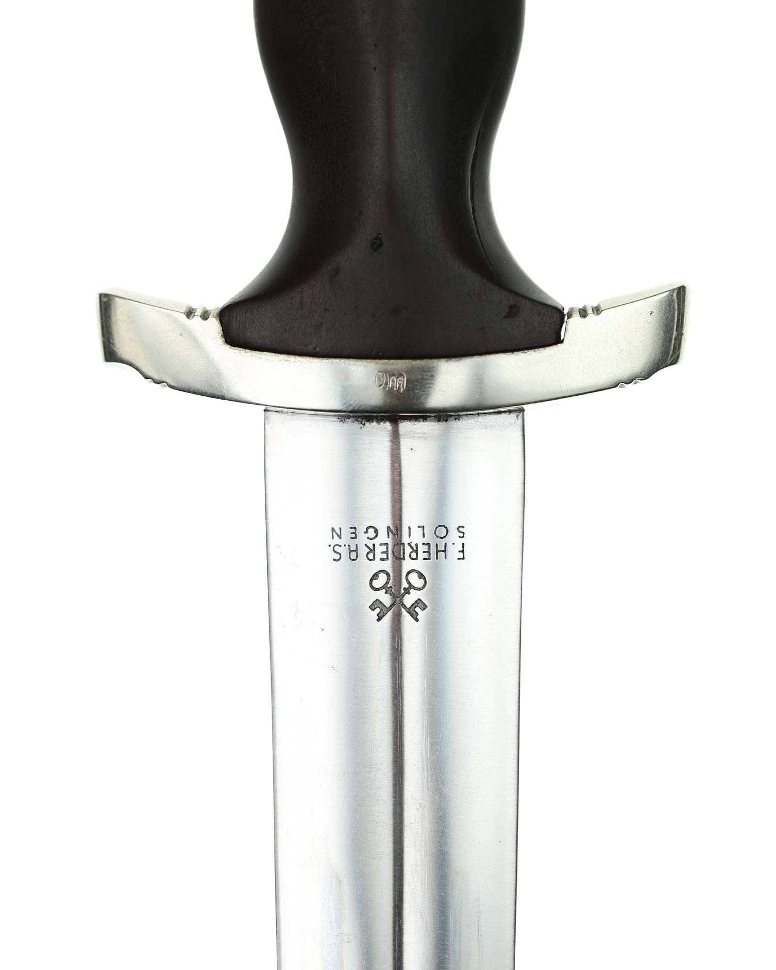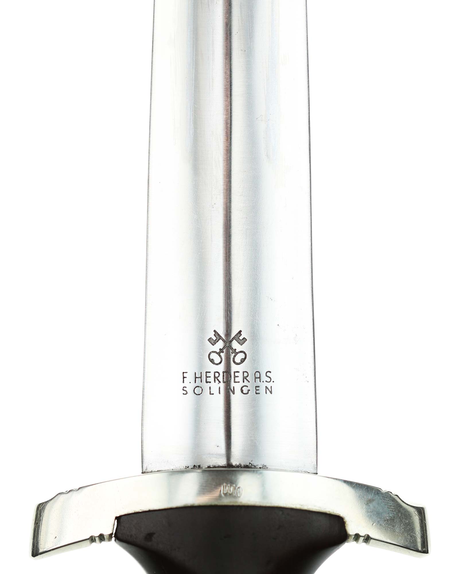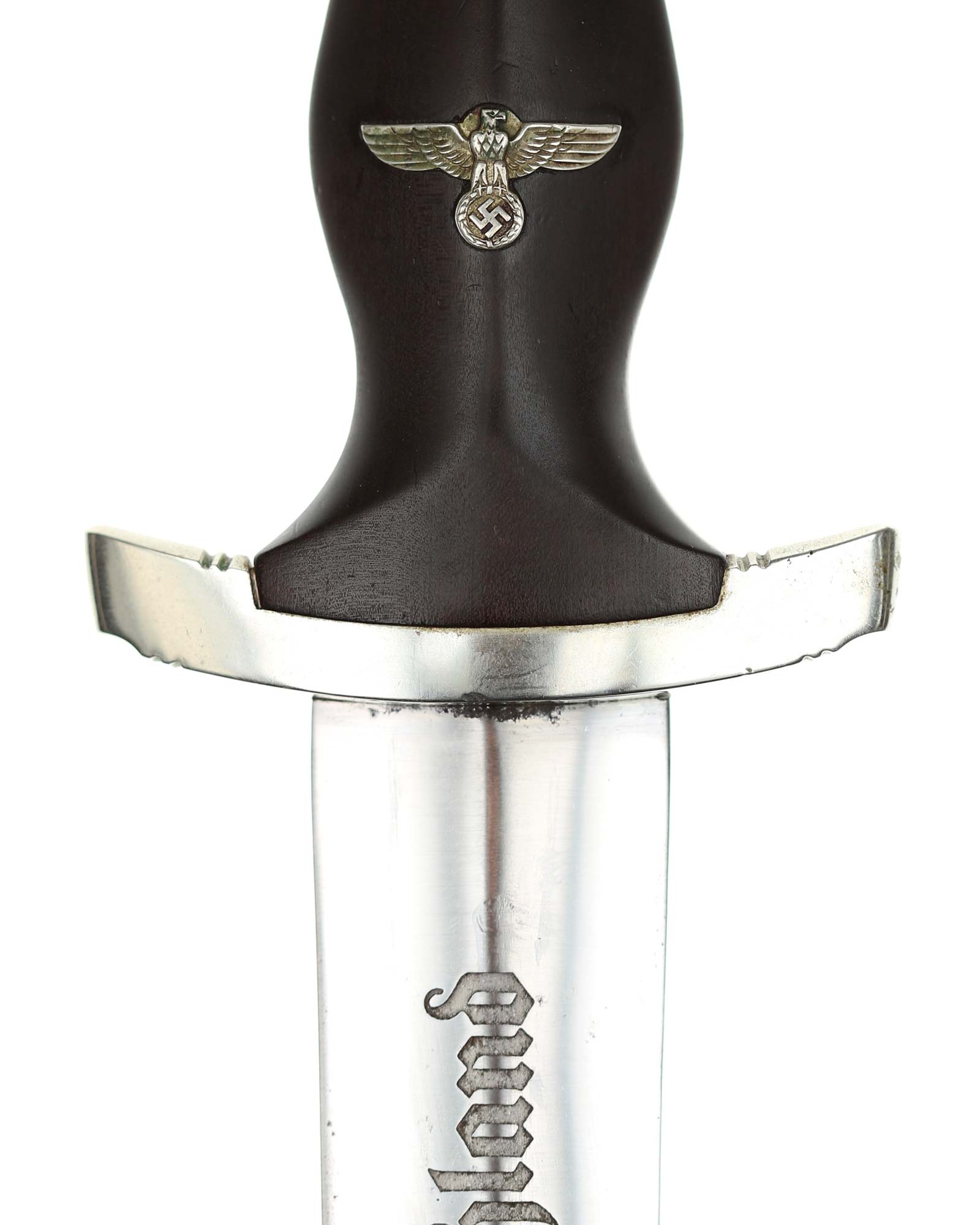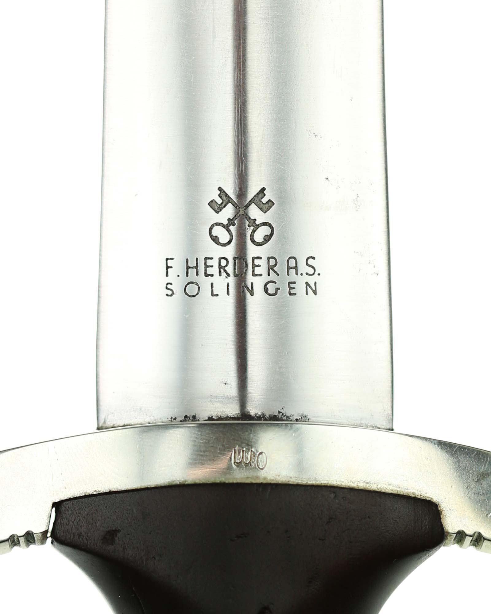 Blade: The blade of this example is still grades at about near mint. The SA motto Alles für Deutschland «Everything for Germany» is deep. The company logo is on the reverse ricasso: F. Herder Solingen. The blade shoulders meet the crossguard contour.