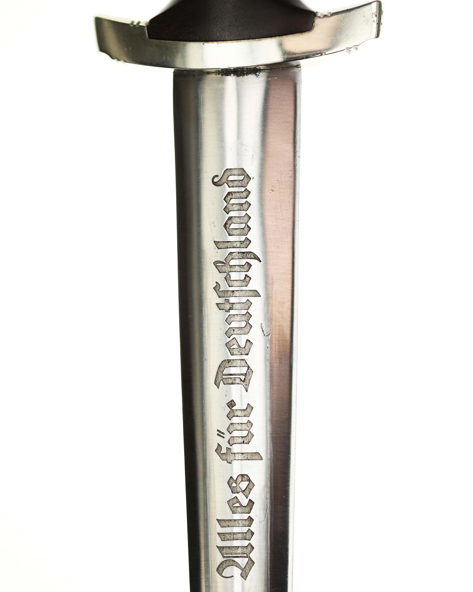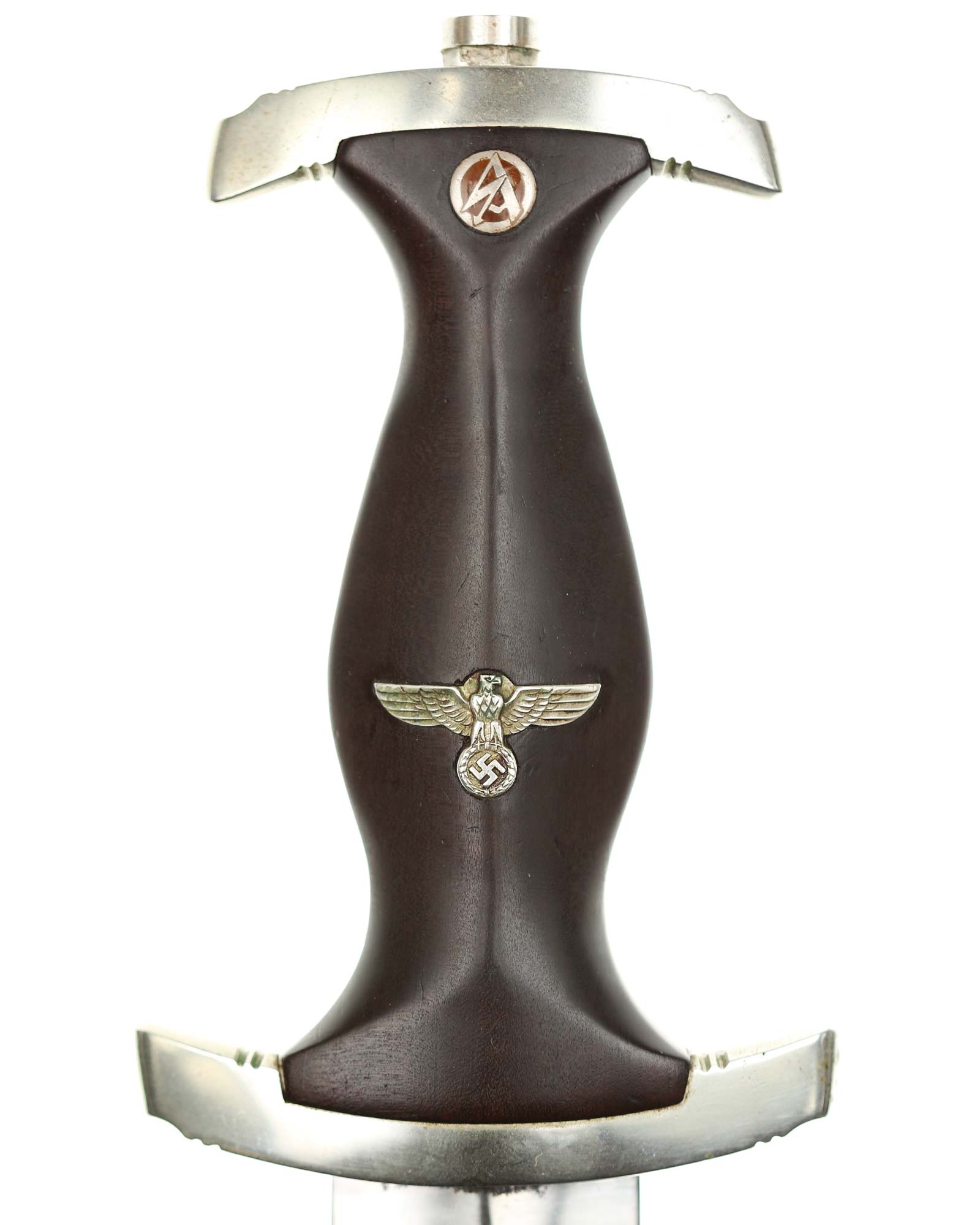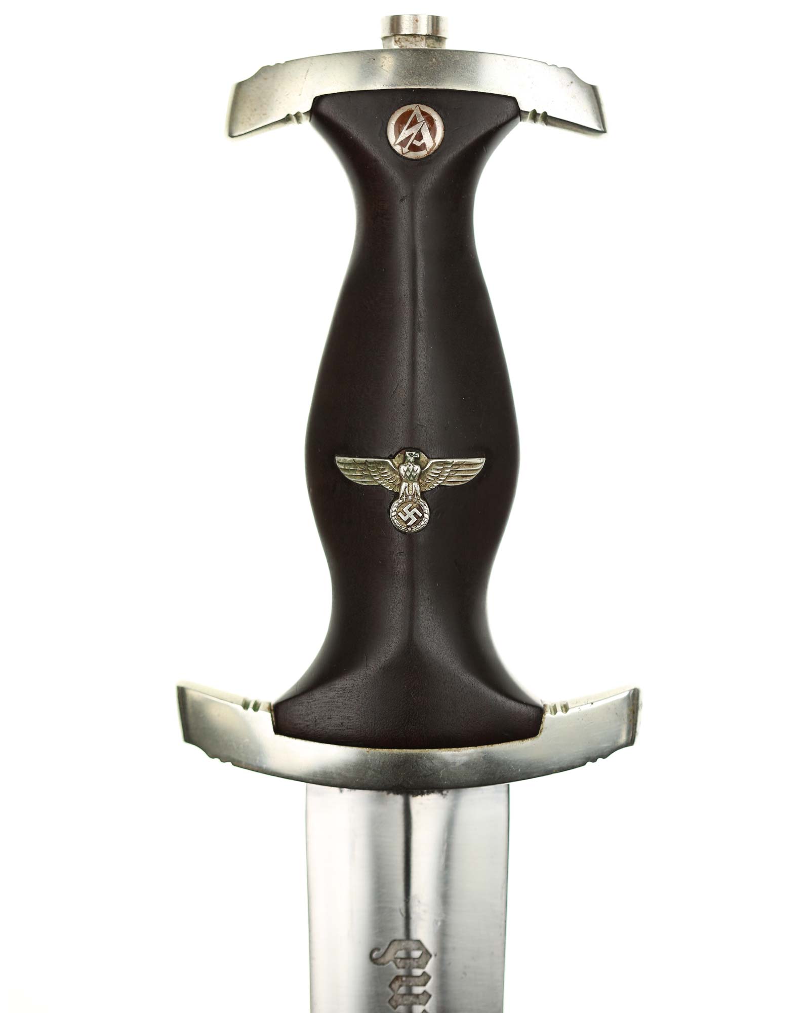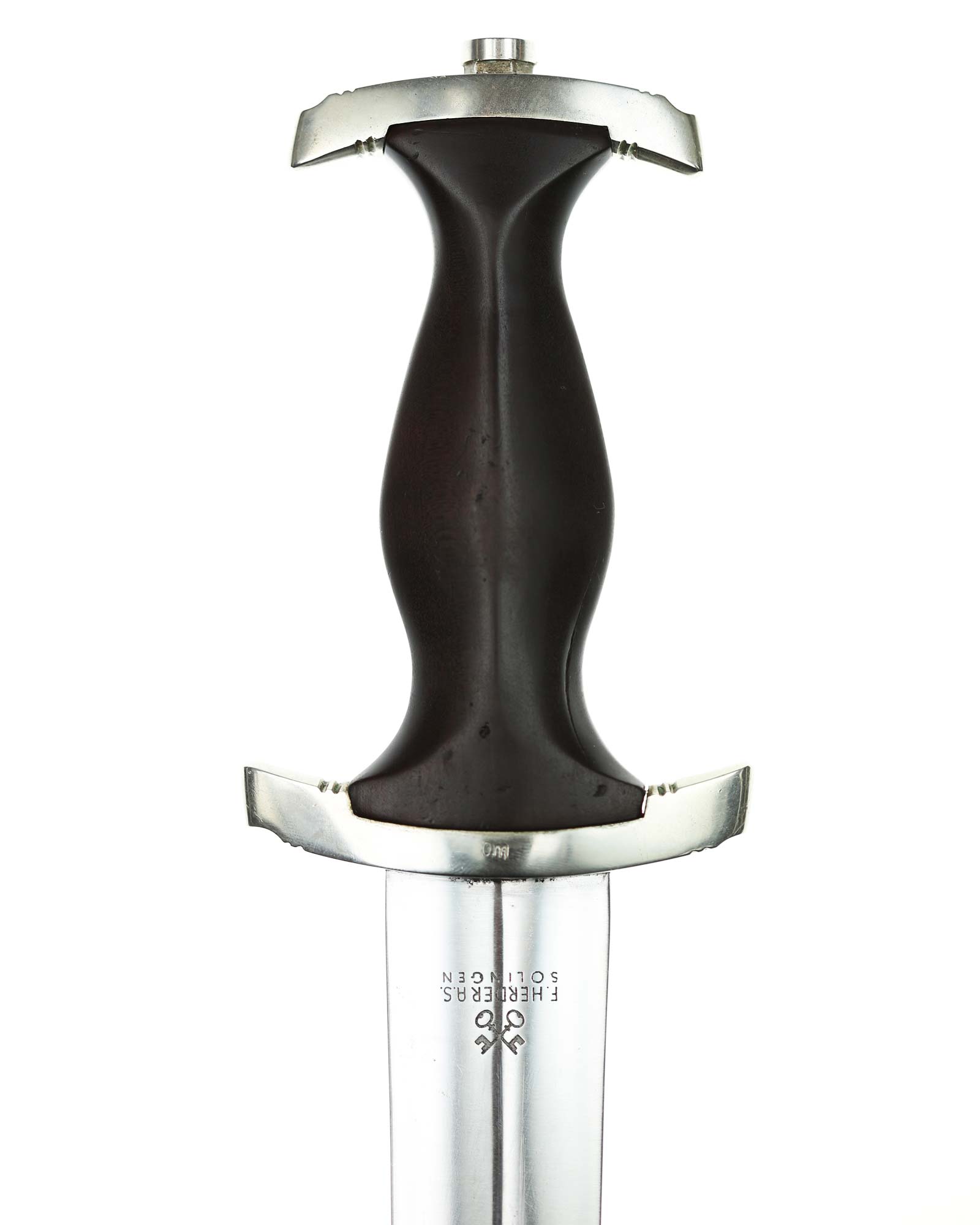 Blade: The blade of this example is still grades at about near mint. The SA motto Alles für Deutschland «Everything for Germany» is deep. The company logo is on the reverse ricasso: F. Herder Solingen. The blade shoulders meet the crossguard contour.