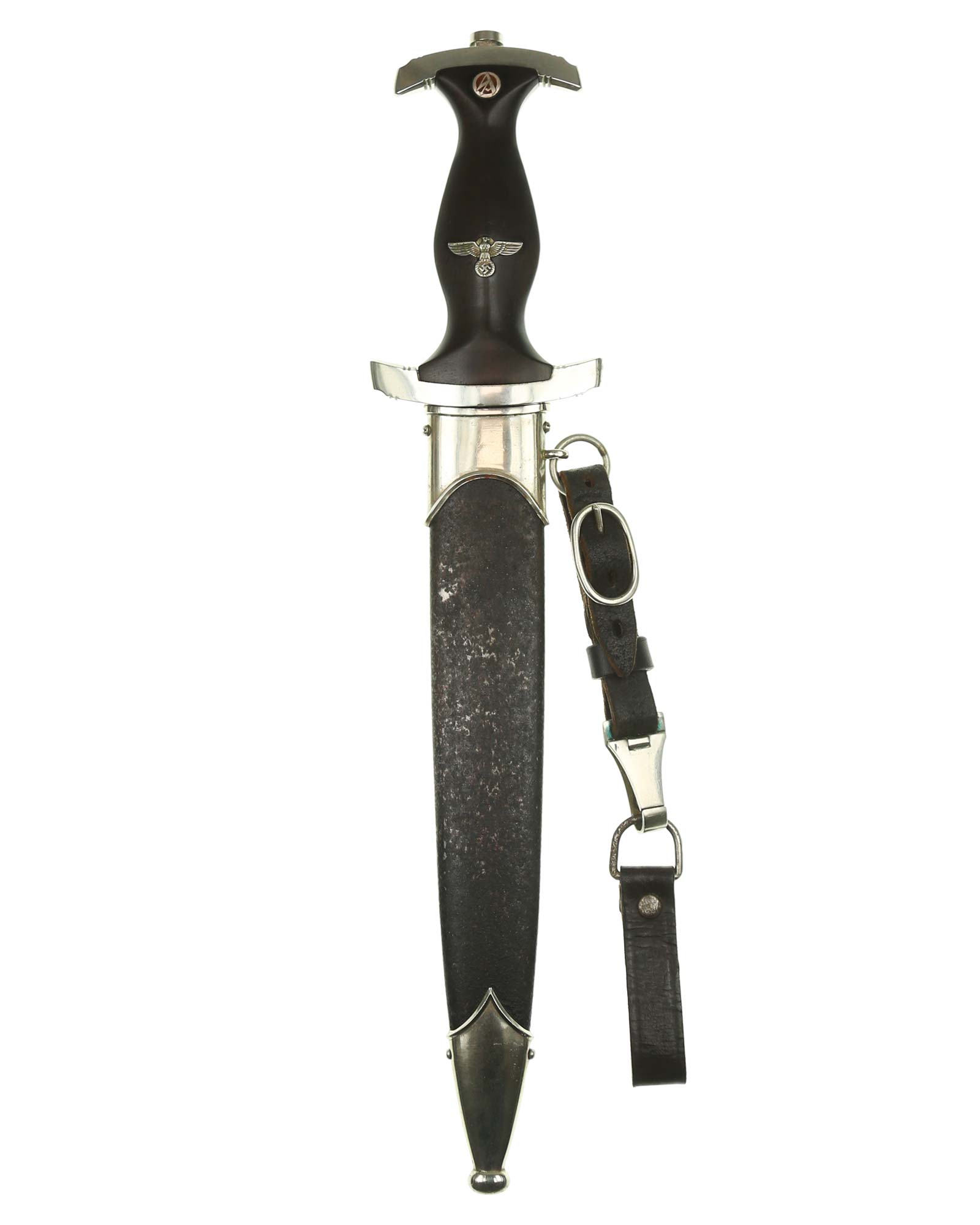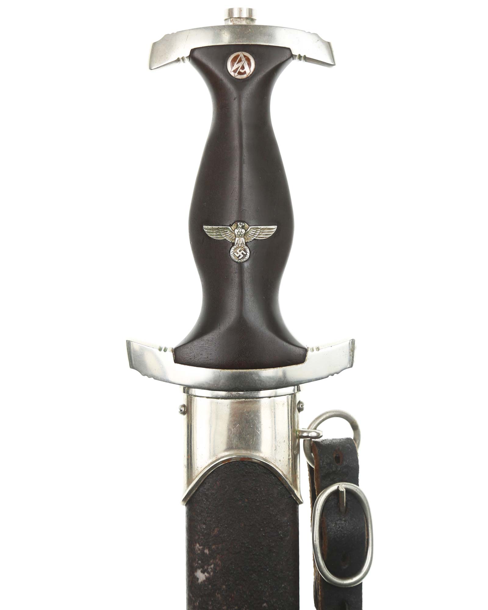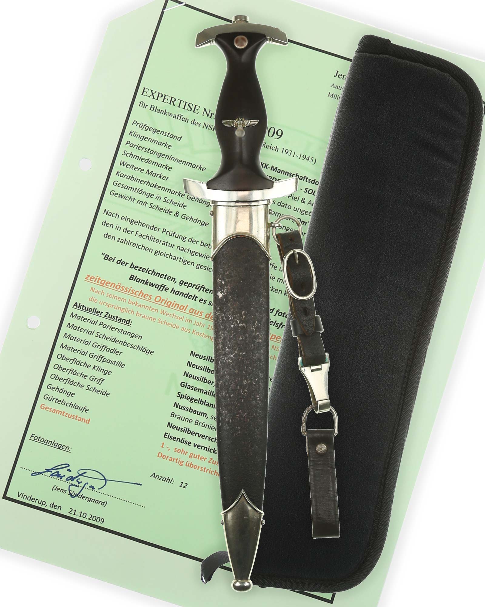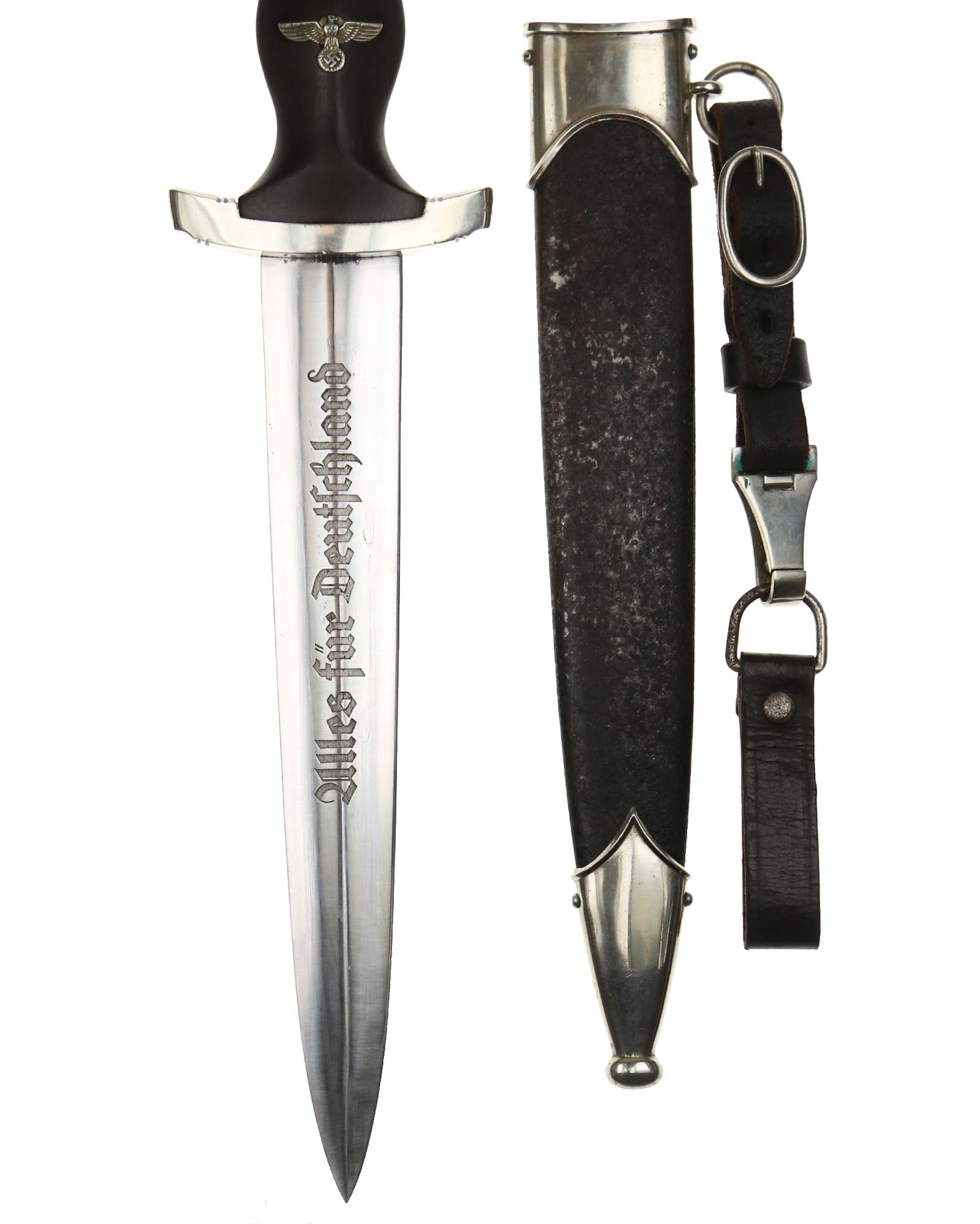 Blade: The blade of this example is still grades at about near mint. The SA motto Alles für Deutschland «Everything for Germany» is deep. The company logo is on the reverse ricasso: F. Herder Solingen. The blade shoulders meet the crossguard contour.