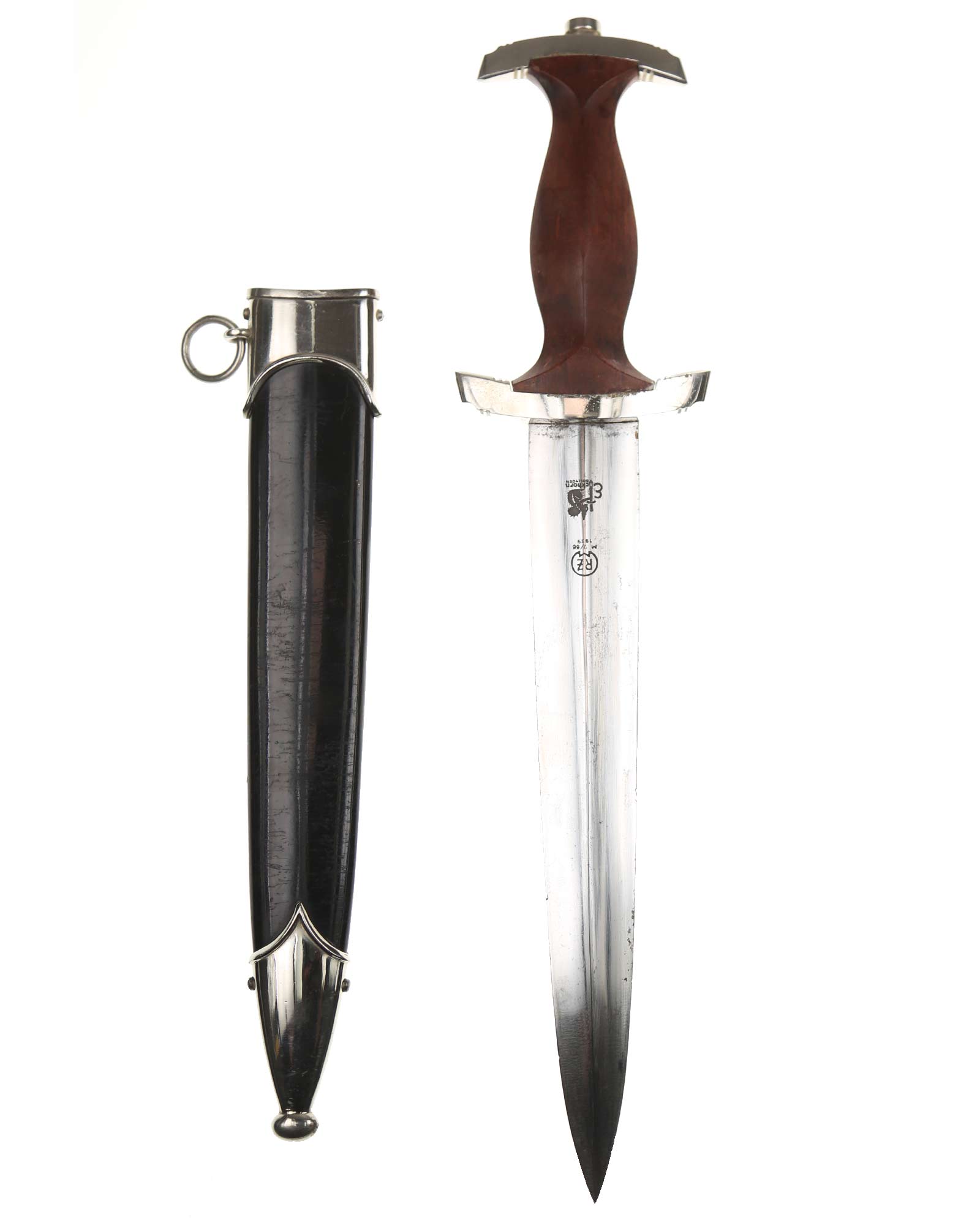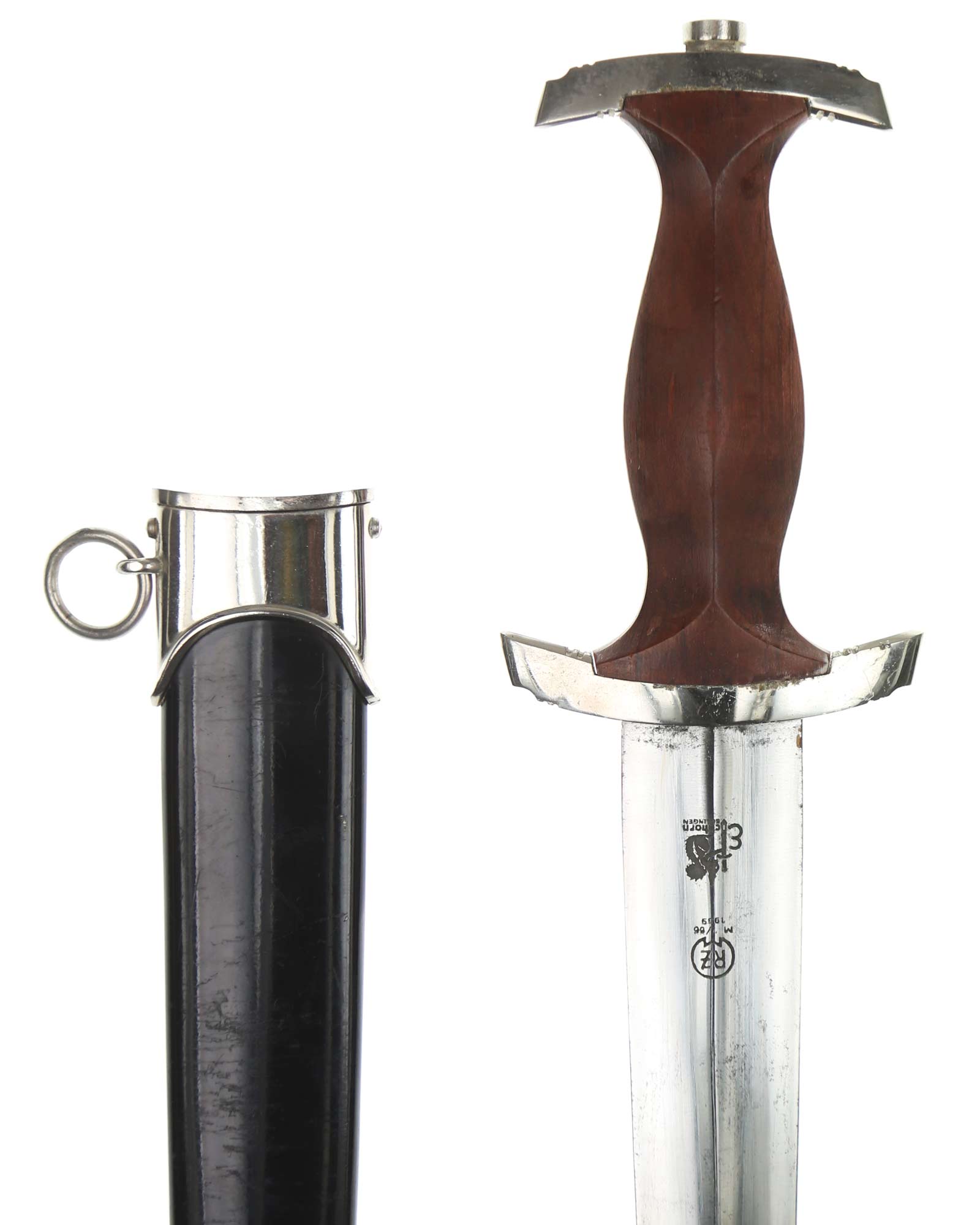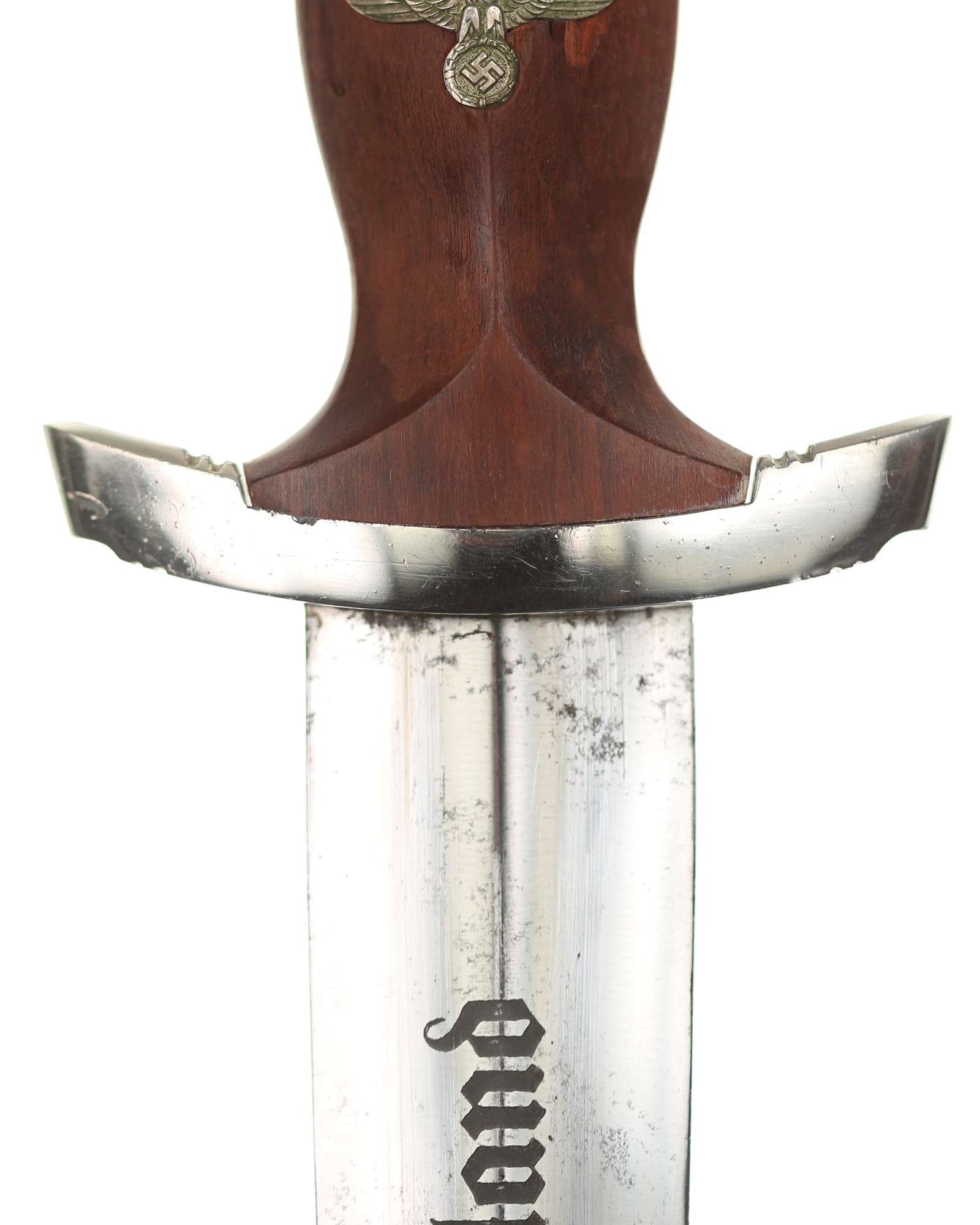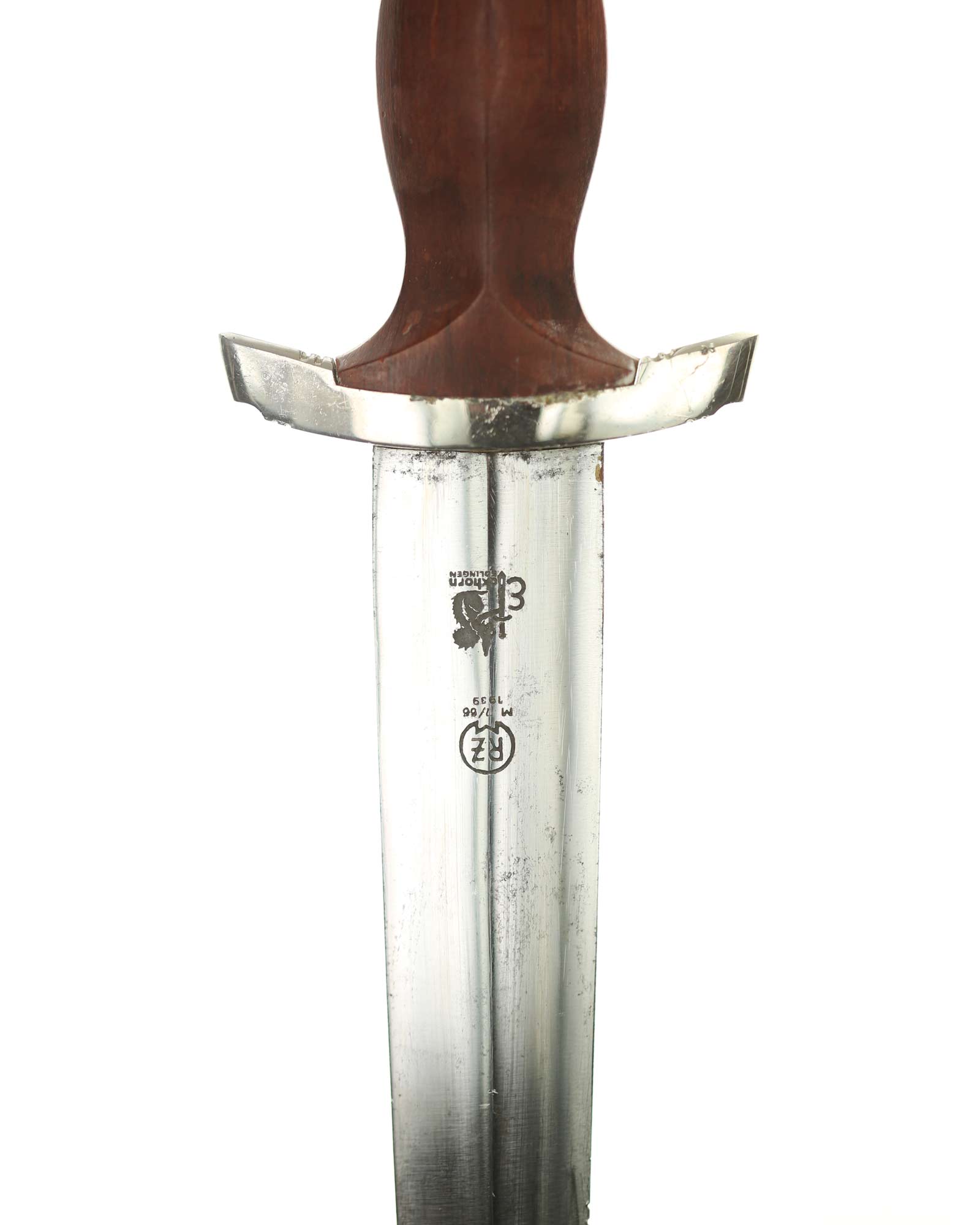 Blade: The blade of this example is still grades at about mint. The SA motto Alles für Deutschland «Everything for Germany» is deep and crisp. The company logo is on the reverse ricasso: RZM M7/66 and Eickhorn Solingen. The blade shoulders meet the crossguard contour.